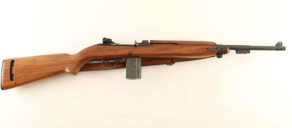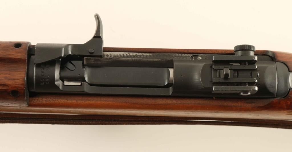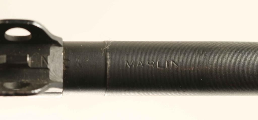 SN: 2112300 Austrian Gendarmerie marked U.S. military magazine fed semi-automatic service rifle chambered in .30 Carbine, manufactured circa 1943. Features a blued finish, 18" Marlin barrel, shrouded blade front sight, sliding adjustable rear aperture sight, wide barrel band with bayonet lug, two-rivet hand guard with narrow groove, rotating safety, push button magazine release, 15 round magazine, smooth trigger, milled triggerguard, flat bolt, smooth brown leather sling, oiler, and smooth walnut pistol grip shoulder stock with high-wood forend, oval cut oiler slot, & textured metal buttplate. Markings: Barrel - "MARLIN" & "P" stamped twice. Barrel Band - "KI" Rear Sight - "PI" Receiver - "14" Operating Slide - "DA-Q" & "2300" Bolt - "2300" Trigger Housing "N", "9", "LGKNO" & "2094" Hammer - "S'G'" Safety Lever - "M" inside a C Magazine Catch - "M" & "WA" Magazine - "MN" Sling - "Stolla/Wien" Forend "OI" & "2300" Stock - "TRIMBLE/TN" & "2300". Rifle exhibits approximately 85% of it's blued finish showing high point edge wear, action wear on the receiver & bolt, and some scattered handling marks. Action is smooth, the four land bore is semi-bright with some minor pitting and the wood stocks are good+ with a repair to the right side of the stock above the magazine well. Condition is NRA Very Good. ***C&R Firearm***