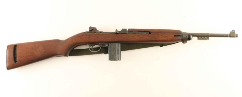 SN: 1998582 Rebuilt U.S. Military contract semi-automatic rifle chambered in .30 Carbine, circa 1943. Imported by Arlington Ordnance of Arlington, Virginia with a small import stamp on the underside of the barrel. Features a parkerized finish, 18" Inland marked barrel dated 7-45, shrouded blade front sight, sliding rear aperture sight, wide barrel band with bayonet lug, four-rivet hand guard with wide groove, rotary safety, push button magazine release, "IS" marked 15 round magazine, smooth trigger, round bolt, green canvas sling and smooth walnut pistol grip shoulder stock with low-wood forend, oval cut oiler slot & metal buttplate. Miscellaneous markings: Front sight - "RIA", Barrel Band - "KI", Rear Sight - "PI", Stock - "IR" & [flaming bomb], Safety - "J.A.O." and the Safety - underlined "M". Rifle retains approximately 85% of it's parkerized finish showing light wear on the barrel and some heavier slide wear on the bolt & receiver from the action cycling. The receiver also shows some old light pin prick pitting under the finish. Action is smooth, bore is good, and the wood stocks are good with imperfections. Condition is NRA Good. ***C&R Firearm***