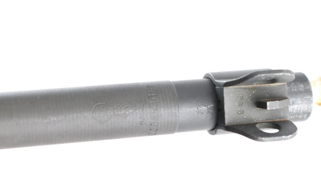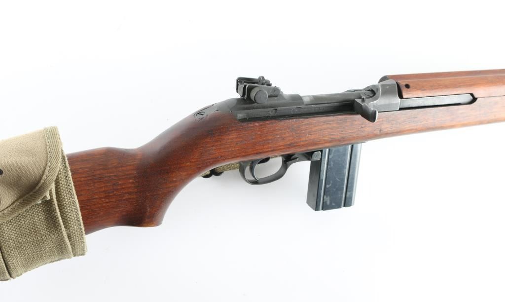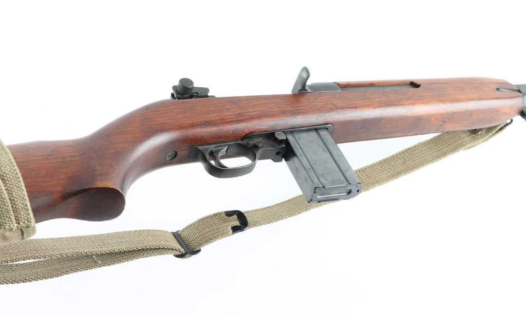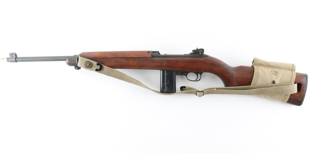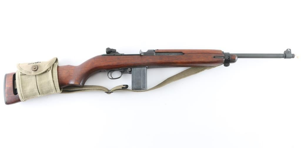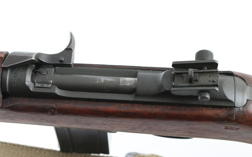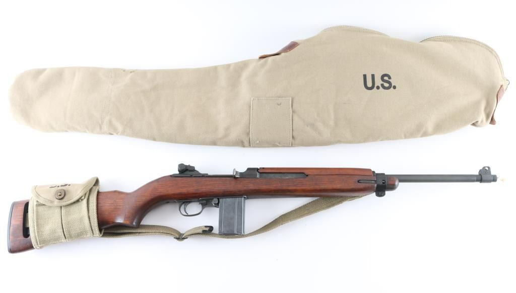 'OGEK' Rework. US military semiautomatic rifle manufactured during WWII. Possibly arsenal refinished. Features parkerized finish, 18" barrel, protected blade front sight, adjustable rear peep sight with range slide, bayonet lug, wide band front sling swivel, rear sling slot, smooth wood stock with two rivet handguard, rotating manual safety. Round top bolt, M2 style mag catch. Bore is very good. Retains 90% medium gray color parkerizing, with edge losses & handling marks, rubbing wear on bolt. Some indication of refinish such as small areas of pitting under the re-finish. Colors look even across most parts, and consistent with US rework. Wood is good condition, handguard is snug. Barrel is marked "UNDERWOOD 2-44" with flaming bomb stamp. Stock markings include "P-U" in sling slot cut on left side of butt, "OGEK" on left side of upper wrist, "H" in shield on rear sight base. Includes (1) blued steel 15 rd magazine marked "SS" (good useable condition with some patina or other blemishes to finish), khaki web sling (appears reproduction), a OD green sling (possibly issue, late production), butt pouch (may be repro) marked "JT&L 1943", reproduction carry case with sling and fleece lining. Condition is NRA Very Good++ (arsenal reworked) *** C&R Firearm ***