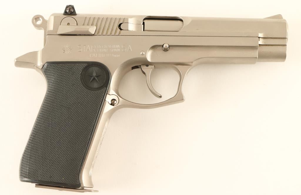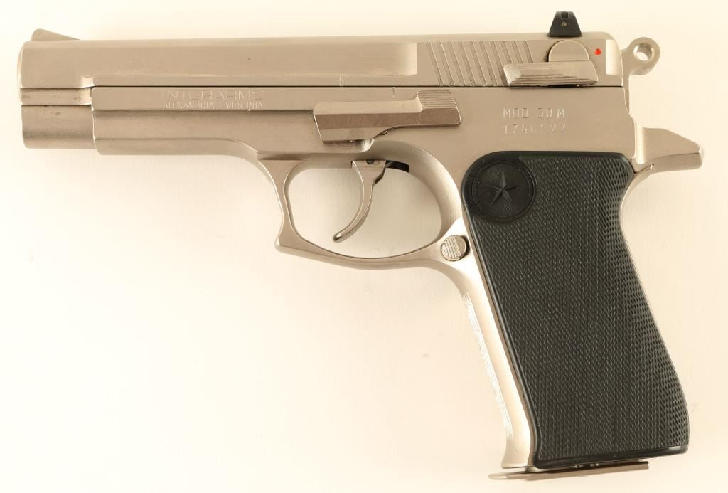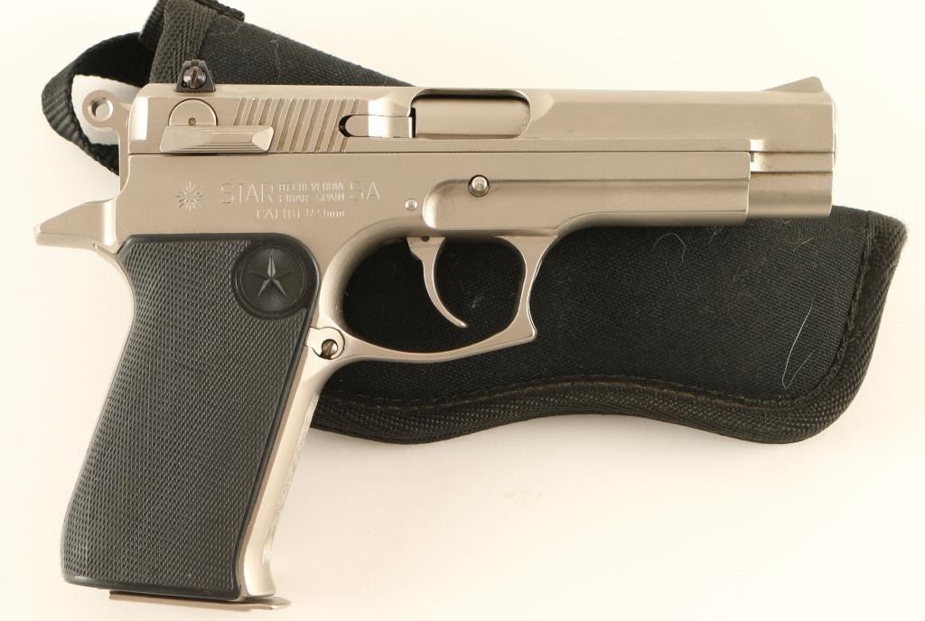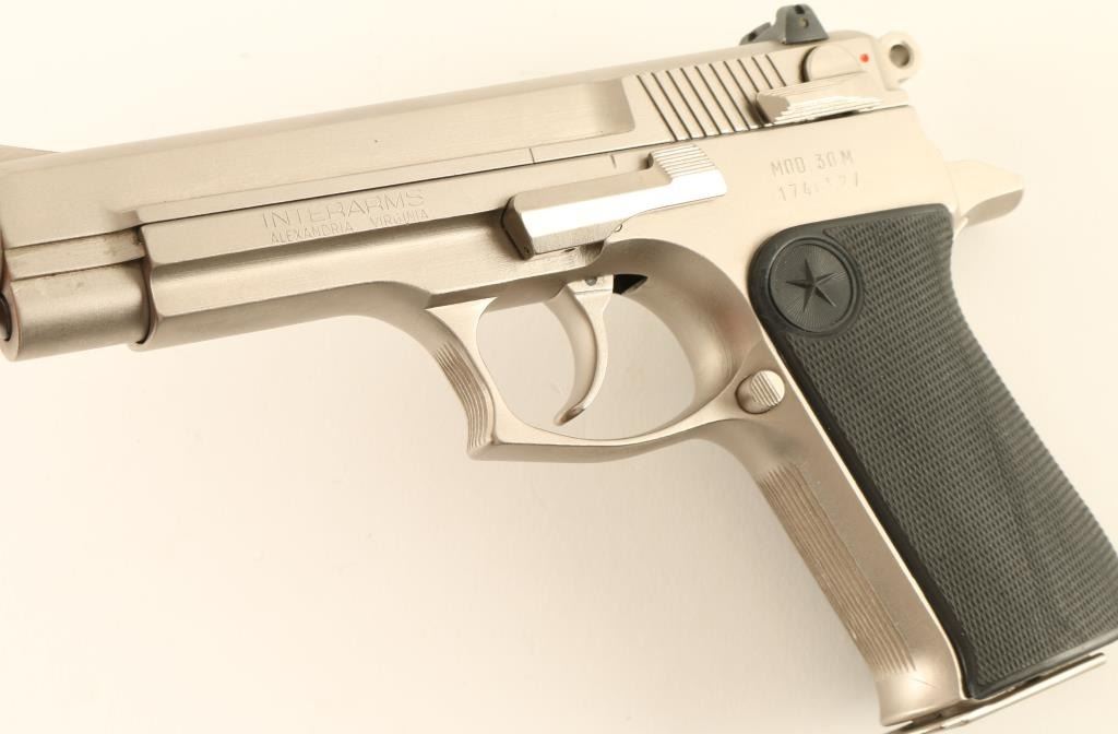 Spanish made double-action stainless steel semi-automatic pistol chambered in 9mm. Imported by Interarms of Alexandria, Virginia with import marks on the left side of the frame. Features a matte finish, 4.25" barrel, fixed front sight, windage adjustable rear window sight, serrated round hammer spur, smooth trigger, ambidextrous safety, push button magazine release, 15 round magazine and checkered black rubber grips. Includes an Uncle Mike's Sidekick black nylon belt loop holster. Finish shows only few minor handling marks with no major wear. Action is smooth, bore is excellent and grips are fine. Condition is excellent. ***Modern Firearm***