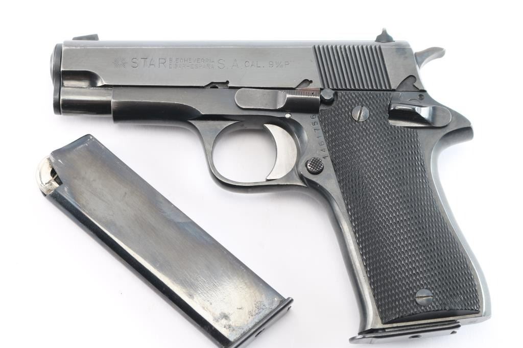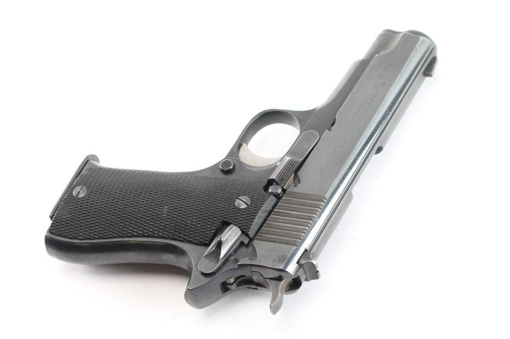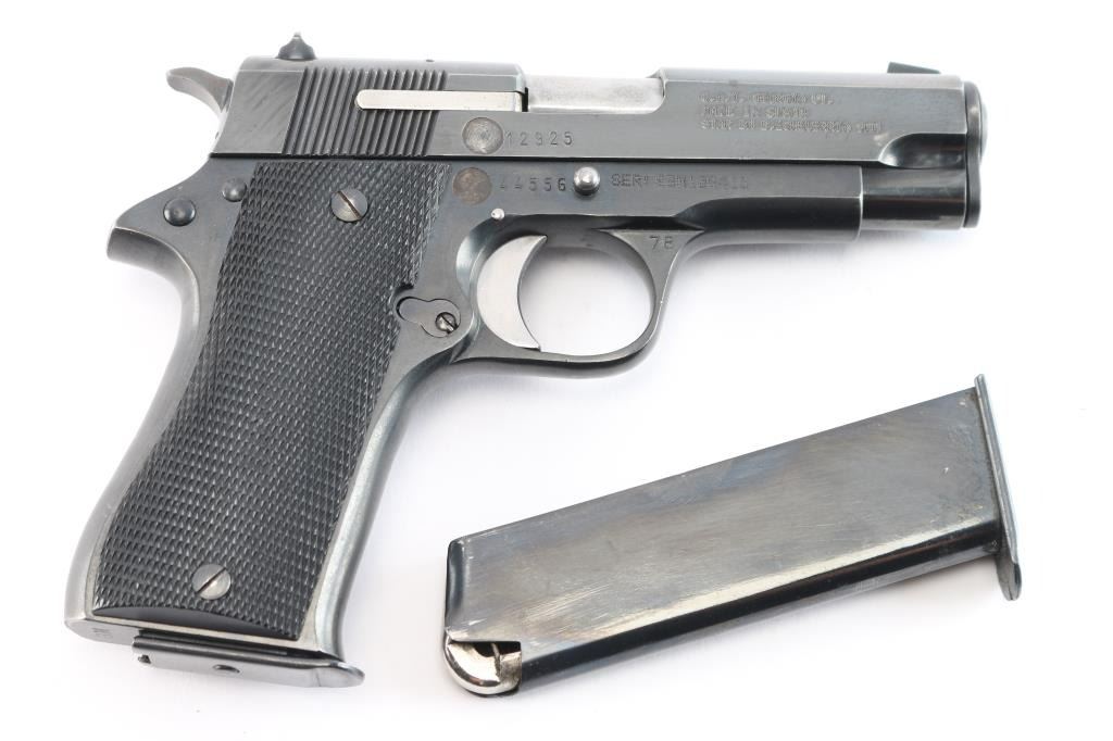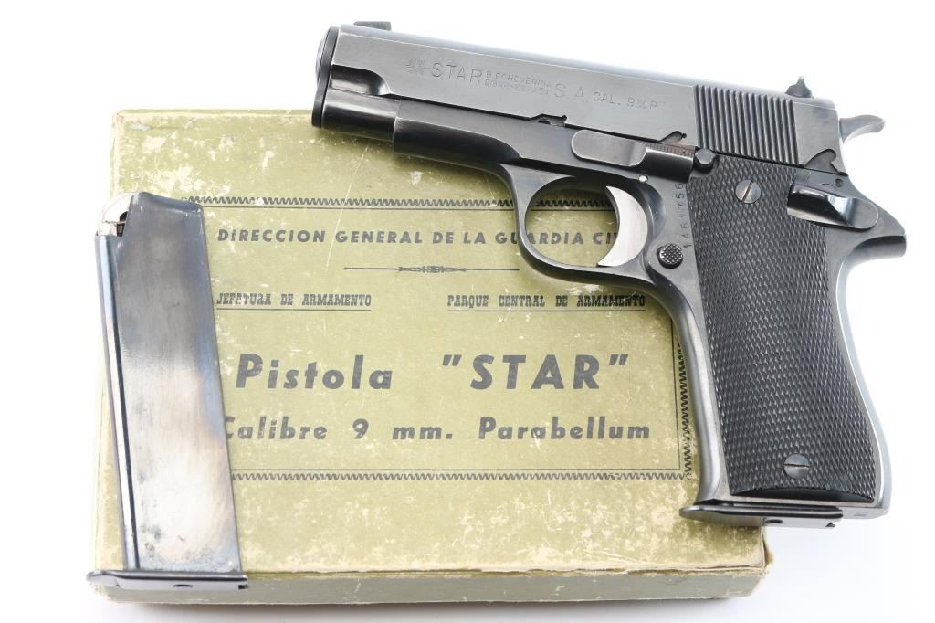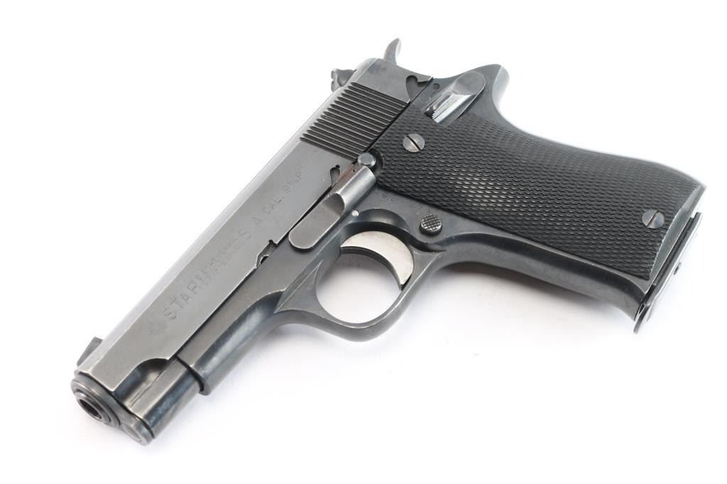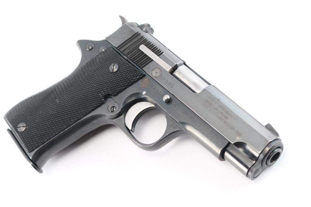 Spanish made single action semi-automatic compact pistol chambered in 9x19mm. Imported by C.A.I. of Georgia, V.T. with import marks on the right side of the slide & frame. Features a blued finish, 3.9" barrel, blade front sight, dovetailed square notch rear sight, serrated trigger, knurled hammer spur, manual safety on the left side of the frame, push button magazine release, 8 round magazine, steel frame and two-piece checkered black synthetic grips. Includes a factory cardboard box with extra magazine & manual (In Spanish). Pistol exhibits approximately 96% of it's blued finish showing some slight edge wear/rubs. Action is smooth, the bore is excellent and the plastic grips are excellent. Manufactured 1978.