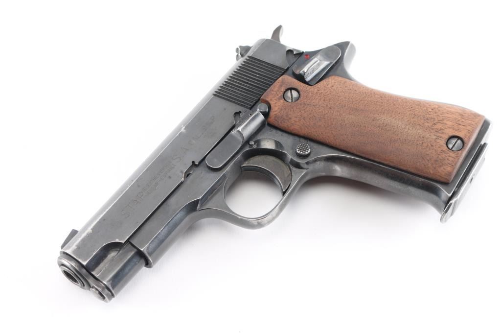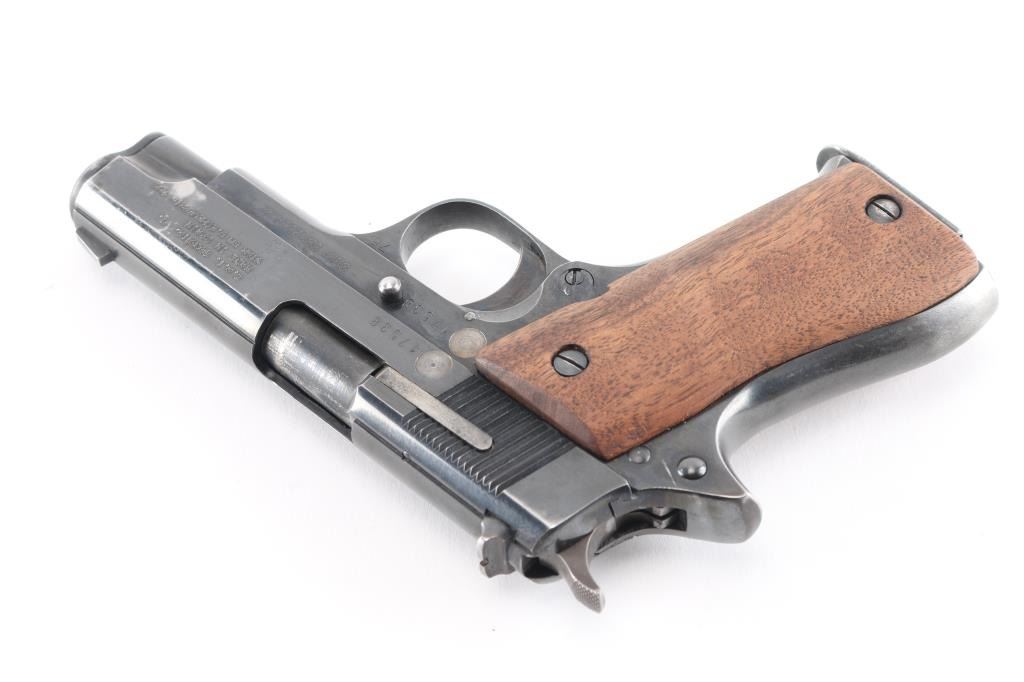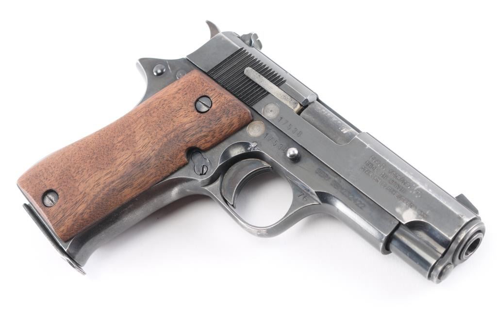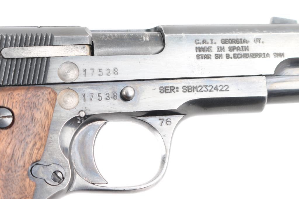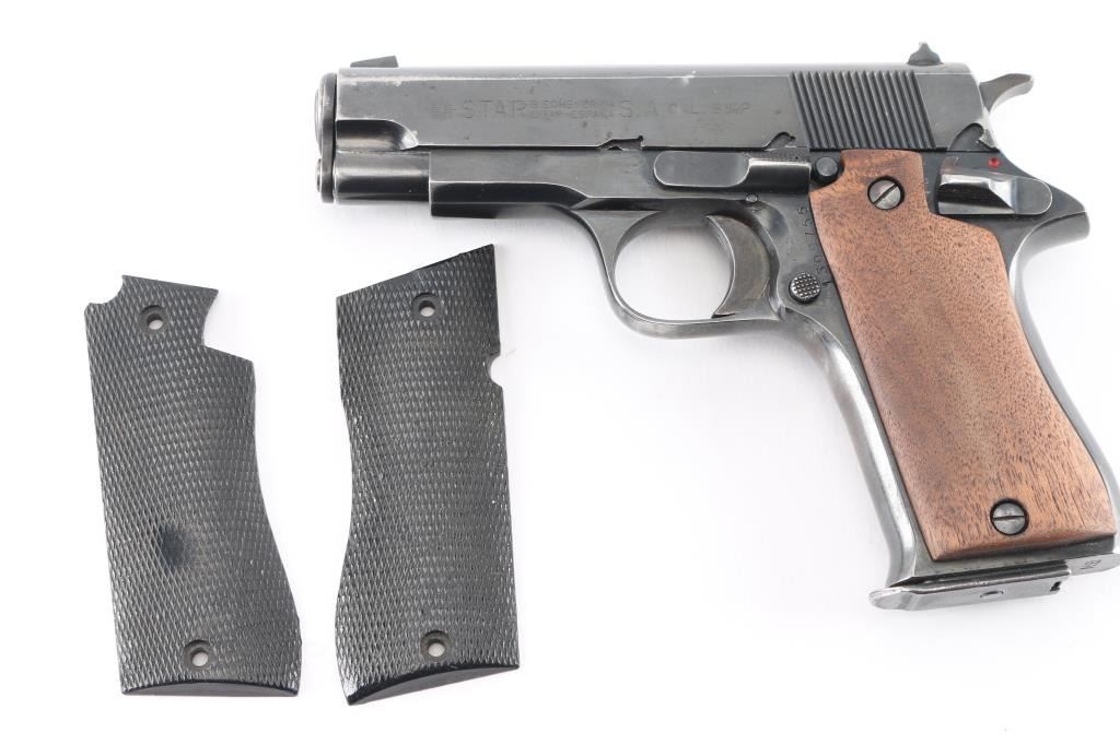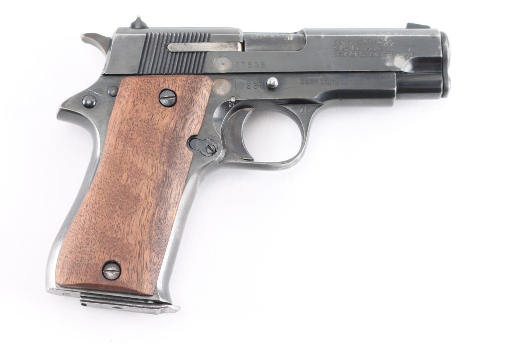 The Star Model BM is a single-action semi-automatic pistol that fires the 9 mm. It was produced by Star Bonifacio Echeverria, S.A. in Spain and is a compact version of the full size Star Model B. Single action semi-automatic compact pistol manufactured circa 1976. Imported by C.A.I. of Georgia, V.T. with import marks and serial number on the right side of the slide. Features a blued finish, 3.75" barrel, full-length steel guide rod, blade front sight, dovetailed rear sight with square notch, serrated trigger, knurled hammer spur, thumb safety on the left side of the frame, push button magazine release, 8 round magazine, steel frame and smooth wood grips, the original two-piece checkered black synthetic grips come with the pistol Bore is excellent/bright. Metal finish is about 85% with edge/holster wear, minor scratches/rubs. Grips are very good/sound. Original serial numbers are matching. Condition is NRA Very Good. Modern Firearm.