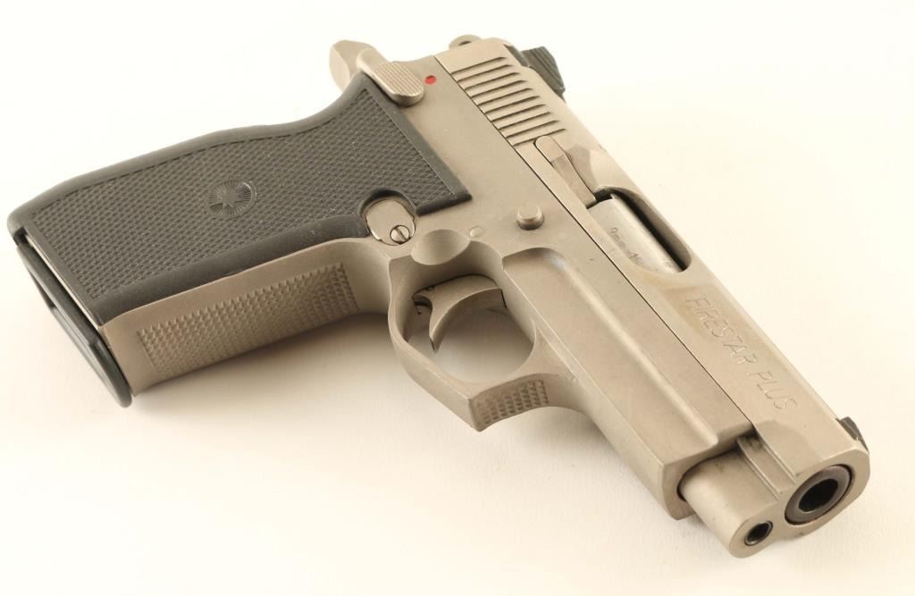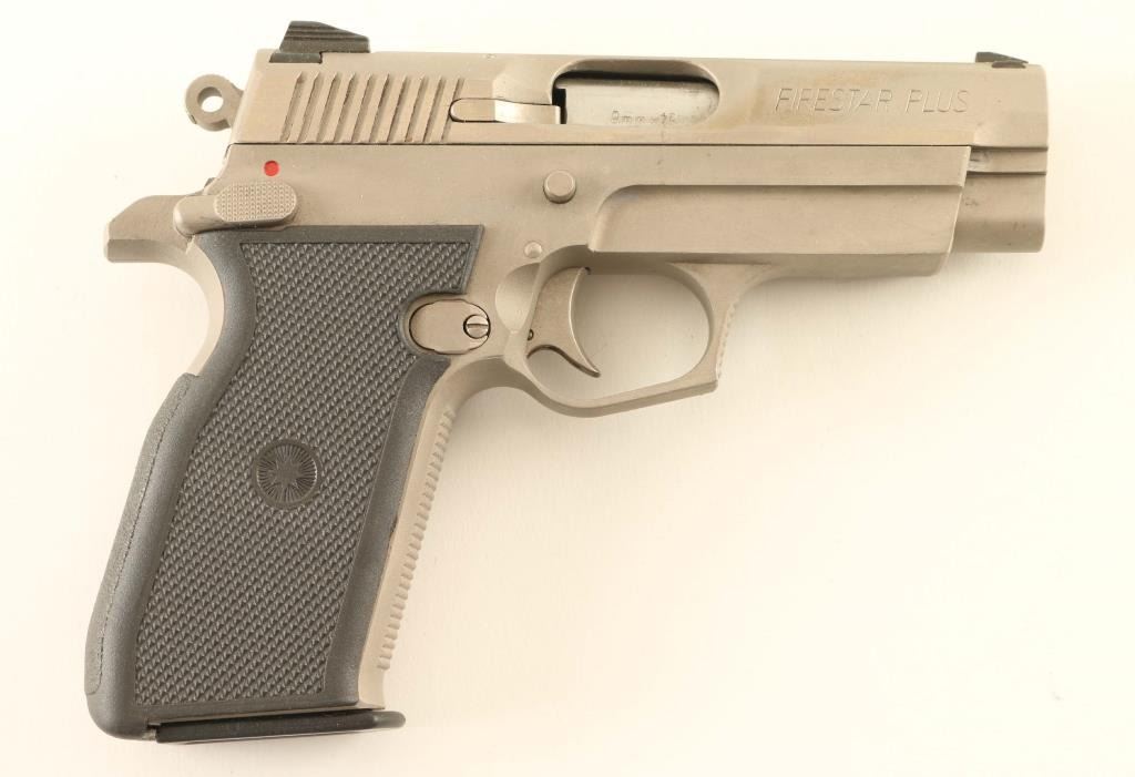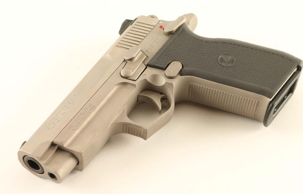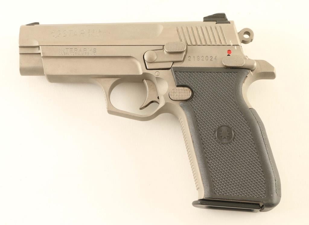 Single action semi-automatic compact pistol chambered in 9x19mm, manufactured in Spain circa 1995. Imported by Interarms of Alexandria, V.A. with import stamp on left side of the frame. Features a matte nickel plated slide with polished flats, 3.5" barrel, dovetailed three-dot sight with drift adjustable rear sight, smooth trigger, serrated round hammer spur, ambidextrous safety on the frame, magazine disconnect safety, push button magazine release, 10 round magazine, matte silver finished alloy frame, and one-piece checkered black synthetic wraparound grip with molded Star insignias. Pistol retains approximately 96% of its original finish showing light holster wear and some scattered bright scratches. Action is smooth, the bore is excellent and the synthetic grip is fine. Condition is NRA Very Good+++. ***Modern Firearm***