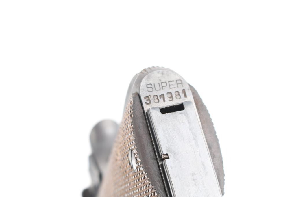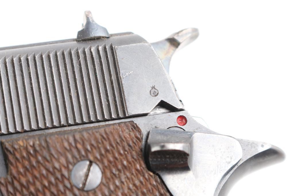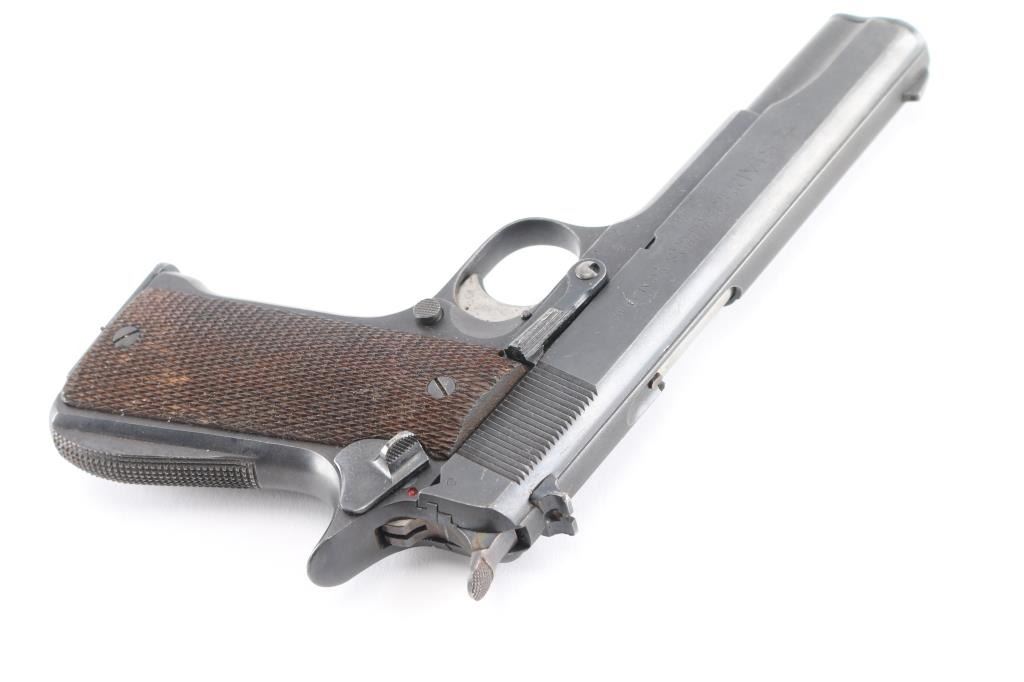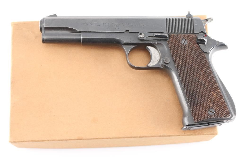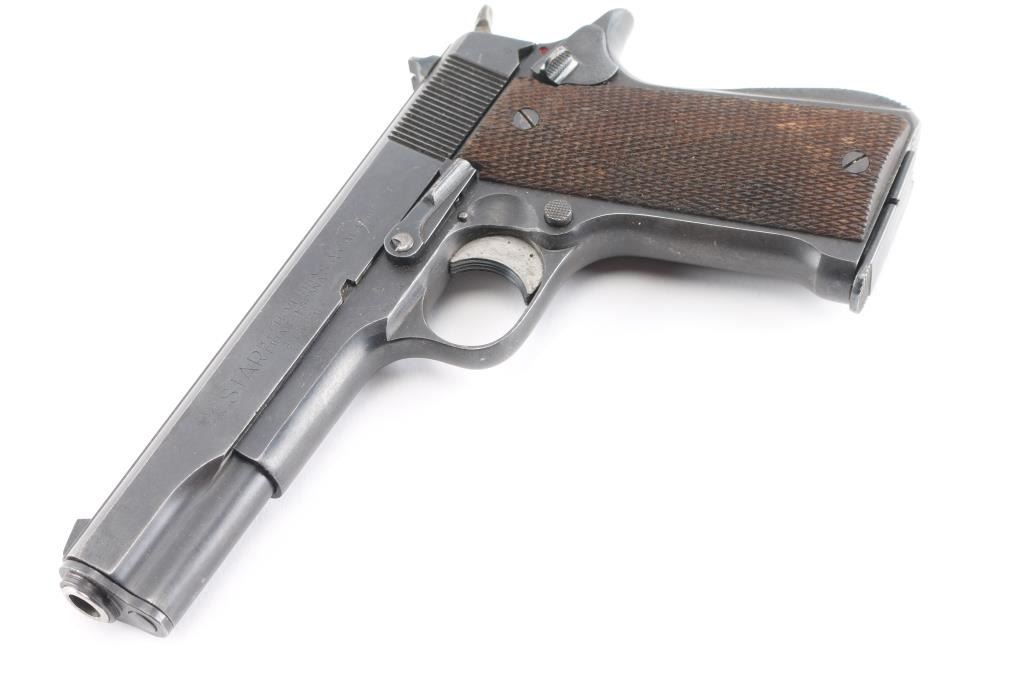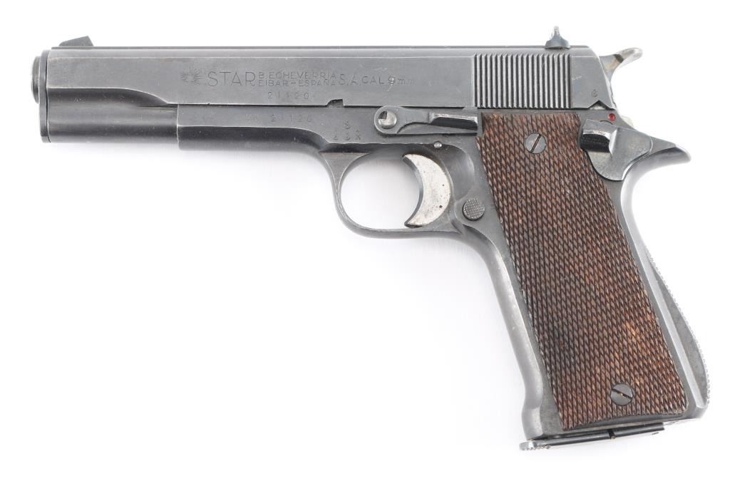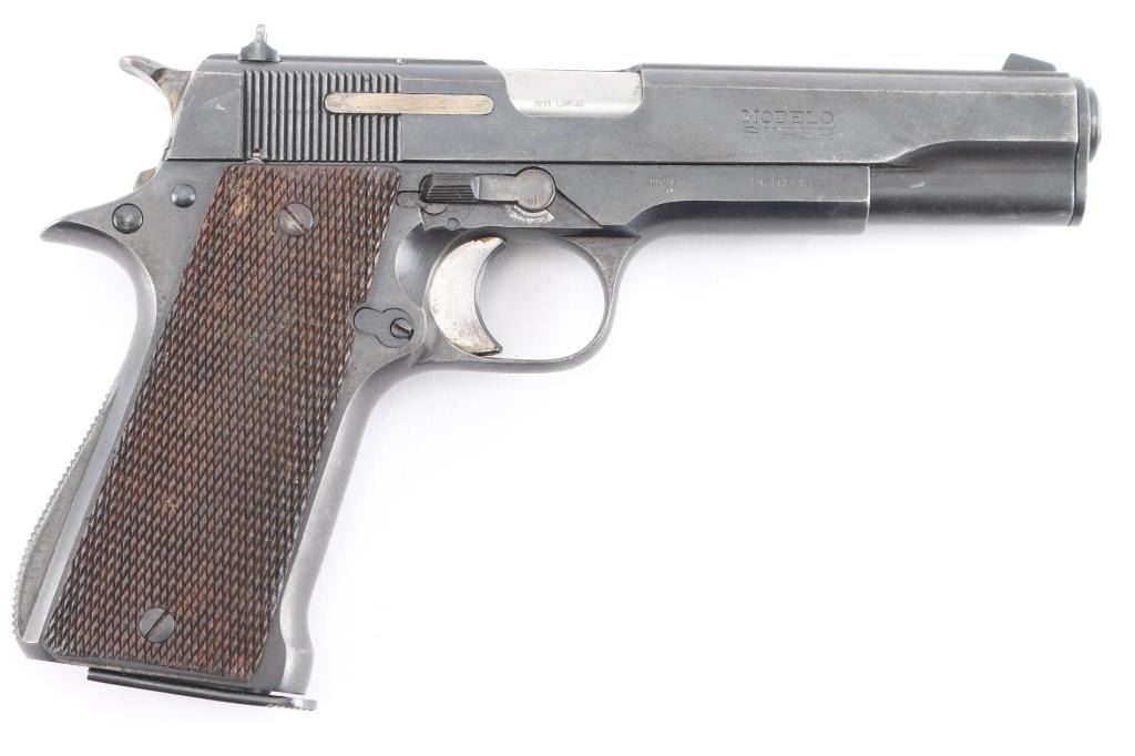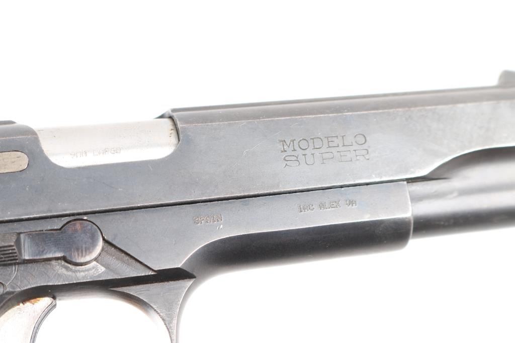 Spanish military single action semi-automatic service pistol built along the lines of the 1911, and chambered in 9x23mm Largo, with date code for 1952. Imported by I.A.C. of Alexandria, VA with import marks on the frame. Features a blued finish, 5" barrel, low-profile patridge front sight, dovetailed rear window sight, serrated trigger, checkered hammer spur, thumb safety, loaded chamber indicator, ambi slide lock, push button magazine release, 9 round magazine, steel beavertail frame with knurled arched mainspring housing and two-piece checkered wood grips. Stamped "21120" on the frame & slide along with standard military proofs. Serial number on heel. Bore is very good bright condition. Pistol exhibits approximately 85% of it's dull blued finish showing moderate holster wear and color fading on grip straps. Wood grips are very good. Comes in matching Interarms box with paperwork, cleaning rod, and two spare magazines.