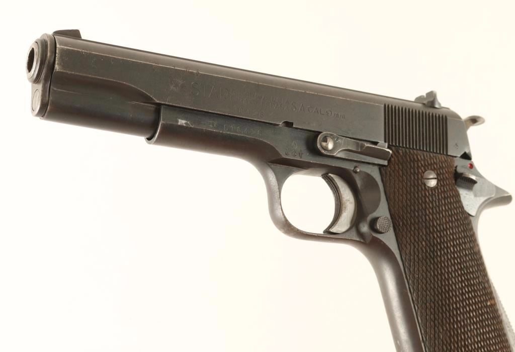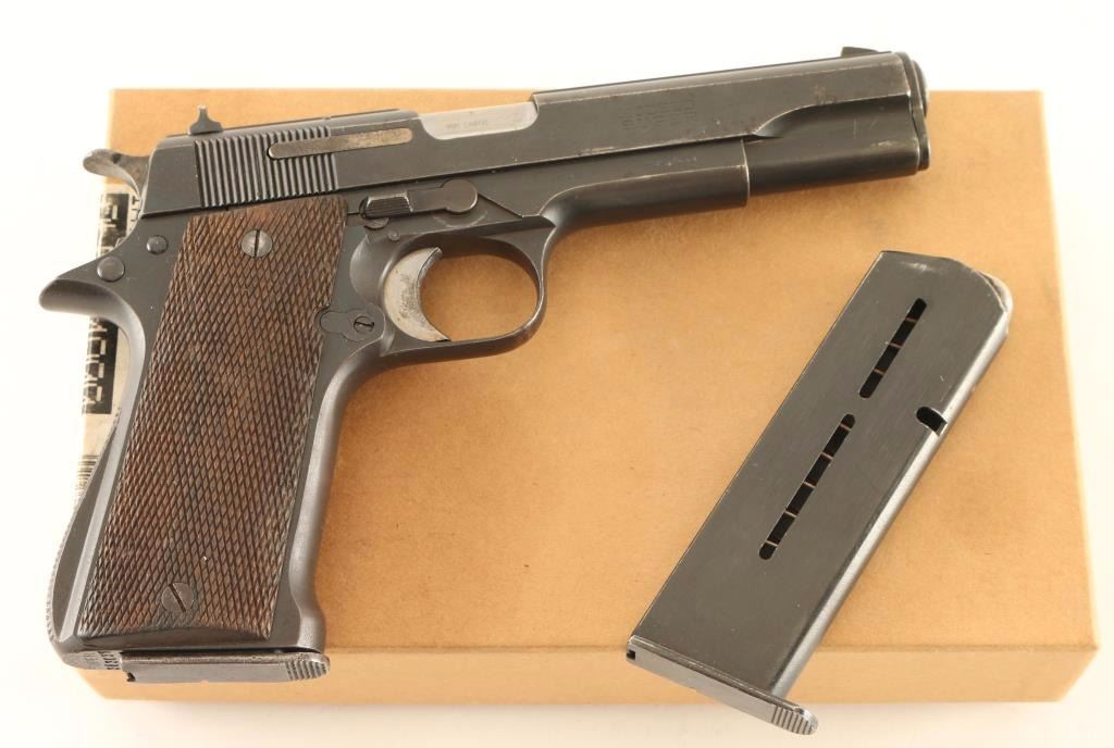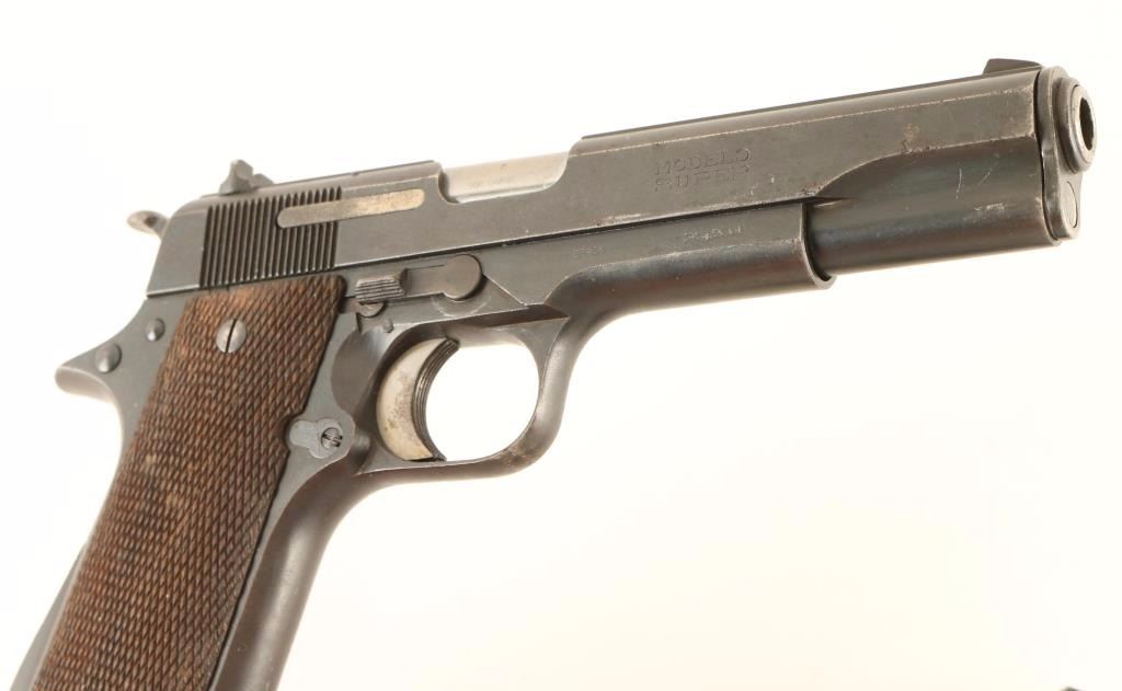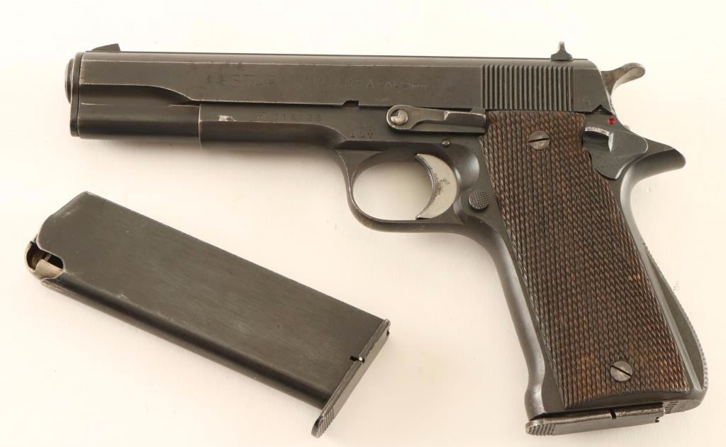 Spanish military single action semi-automatic service pistol built along the lines of the 1911, and chambered in 9x23mm Largo, circa 1951. Imported by I.A.C. of Alexandria, VA with import marks on the frame. Features a blued finish, 5" barrel, low-profile patridge front sight, dovetailed rear window sight, serrated trigger, checkered hammer spur, thumb safety, push button magazine release, 9 round magazine, steel beavertail frame with knurled arched backstrap and two-piece checkered wood grips. Includes an Interarms cardboard box with matching label, documents, cleaning tool and spare magazine. Stamped "016426" on the slide & "ET016426" on the frame along with standard military proofs. Pistol exhibits approximately 75% of it's blued finish showing moderate holster wear and scattered pin prick pitting. Action is smooth, bore is dark with scattered pitting and wood grips are good as worn semi-smooth. Condition is good. ***C&R Firearm*** ***Modern Firearm***