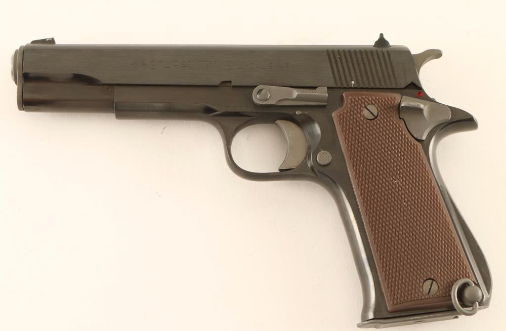Spanish made single action semi-automatic pistol chambered in 9x19mm. Imported by Interarms of Alexandria, Virginia with import marks on the right side of the slide. Features a blued/matte grey finish, 5" barrel, patridge front sight, dovetailed rear window sight, checkered hammer spur, serrated trigger, thumb safety, push button magazine release, 8 round magazine, lanyard loop, checkered backstrap and two-piece checkered brown plastic grips. Pistol exhibits approximately 98% of it's original blued finish showing very little wear. Action is smooth, bore is pristine and plastic grips are fine. Condition is excellent. ***Modern Firearm***
