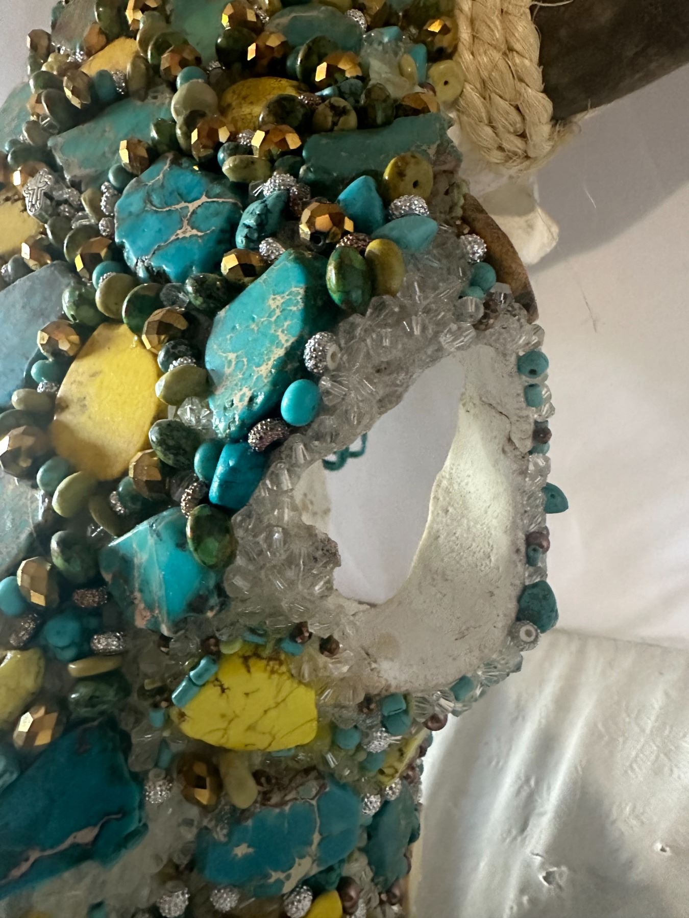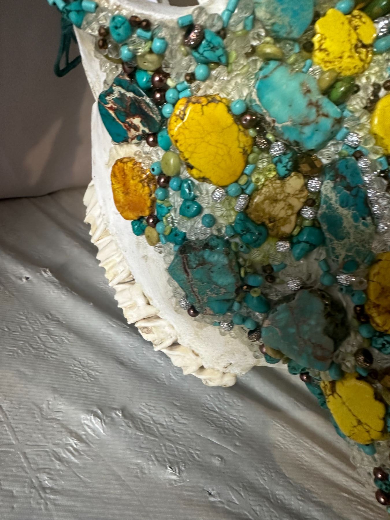 Unique and stunning, this beautifully adorned Steer skull, has been hand crafted and adorned with dozens of Genuine Turquoise cut Stones and Dyed yellow Howlite stones and accented with various smaller turquoise stones, various bead, rhinestones, crystal beads and other accents.