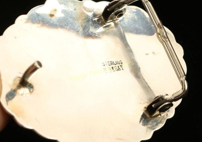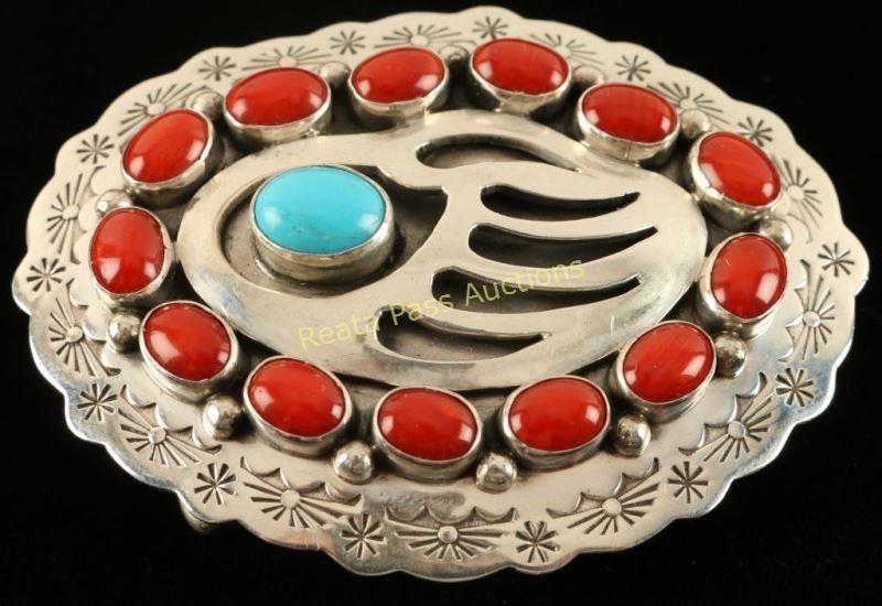 Center of buckle has bear claw cut out with single turquoise stone surrounded by 13 small coral stones. Outside edge is etched with sun and star design. Back is signed 'H. Begay, Sterling". Measures 3"x2 1/8".