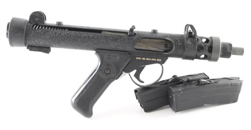 British semiautomatic pistol imported by Cassi Inc, Colorado Springs CO. Based on the Sterling submachine gun. Features 4.75" barrel, protected blade front sight, protected "L" flip notch/peep rear sight, side feeding detachable magazine, rear sling swivel, black plastic grip, manual safety. Bore is very good condition. Retains 95% coverage black crinkle finish paint on metal surfaces, some finish loss on barrel nut. Grip is very good condition. Includes (1) 34 rd magazine, (2) shortened magazines (appear to hold about 15 rounds). Condition is NRA Very Good++ *** Modern Firearm ***