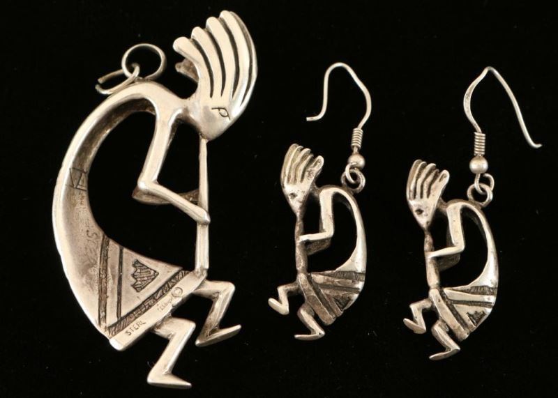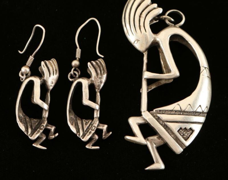 Whimsical Kokopelli pendant with geometric design with matching earrings on French hooks. Pendant measures 2 1/2"x 1 1/2" marked 'Sterling'
