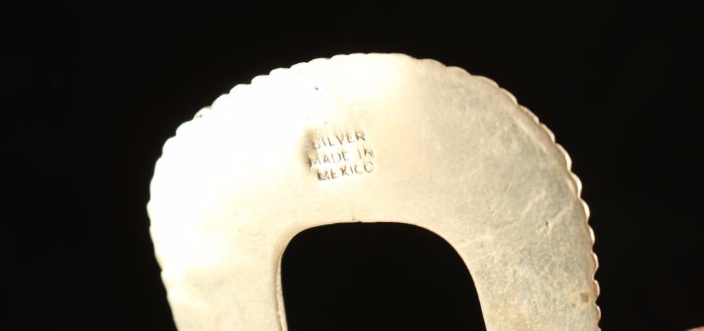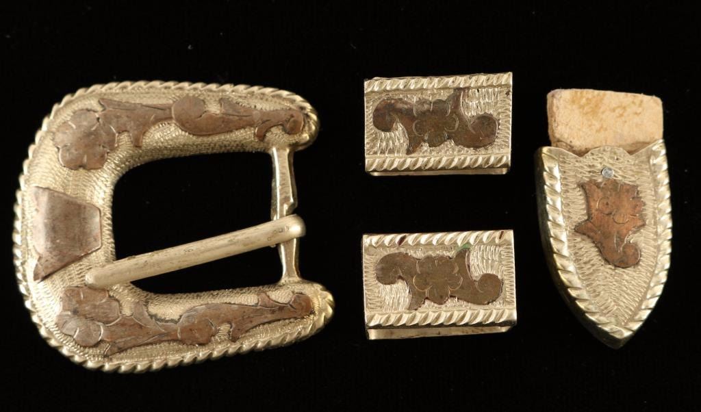 Small sterling buckle with a copper floral motif that is also on two keepers and tip for belt. Marked 'Silver Made in Mexico' Shows wear.