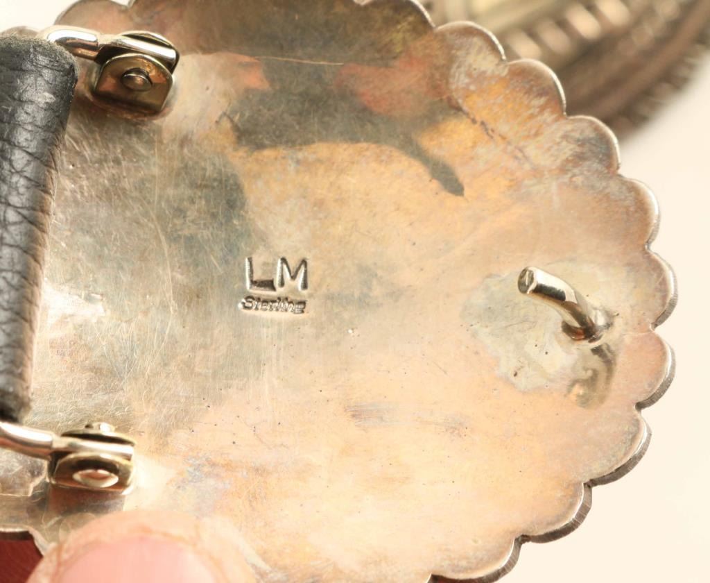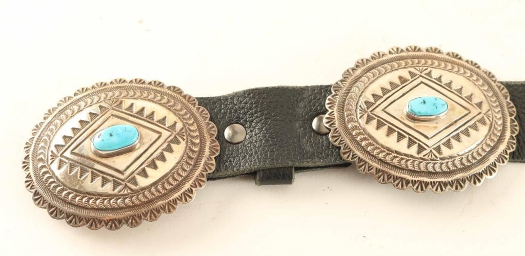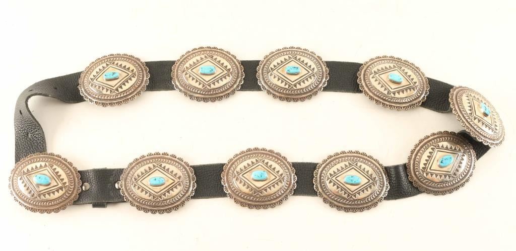 A beautiful concho belt with (10) Conchos all decorated with oval shaped pieces of turquoise. Belt has new leather and is for a 39" waist.