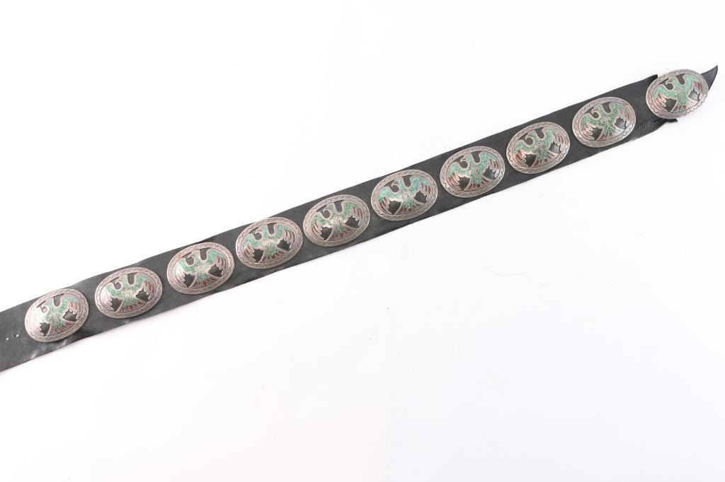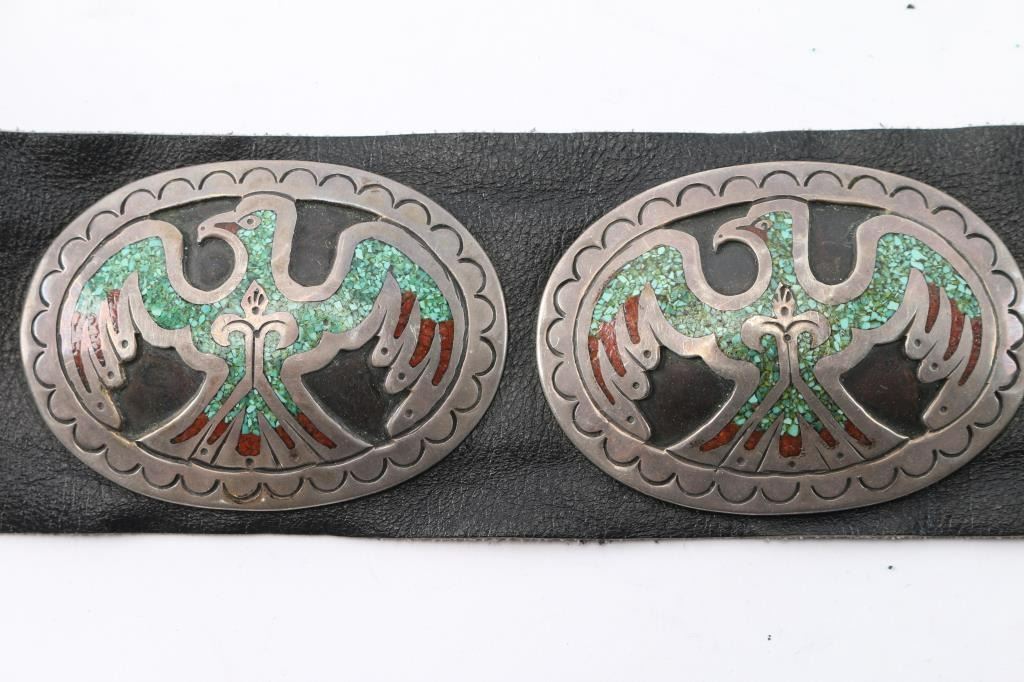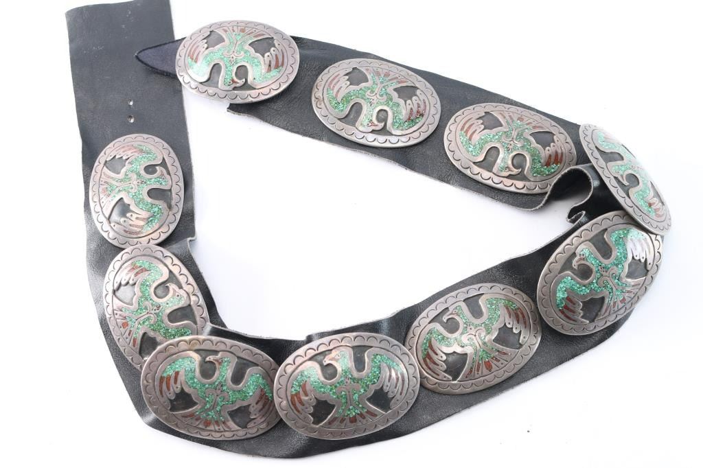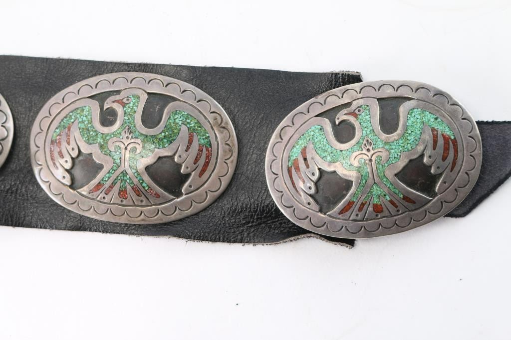 Inlaid with turquoise and coral. Ten conchos measure 2 3/4" x 2" each on 2 1/4" black leather belt measuring 35 1/4" end to end.