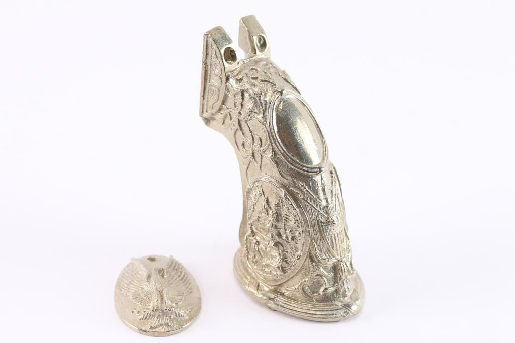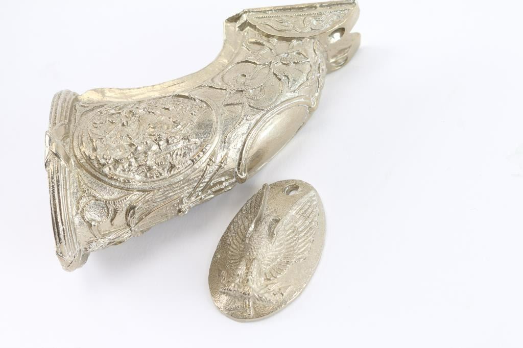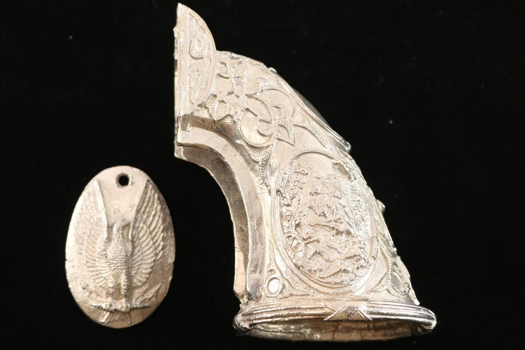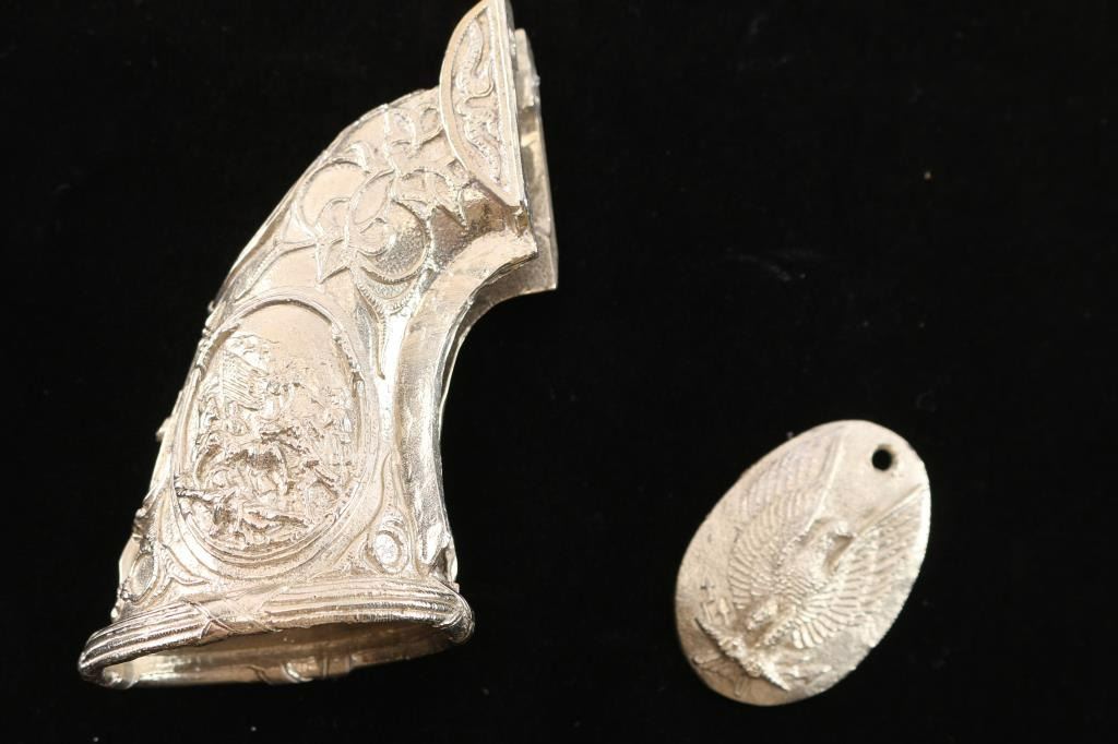 And grip cap, in sterling silver. Colt Navy size. High relief fancy design.
