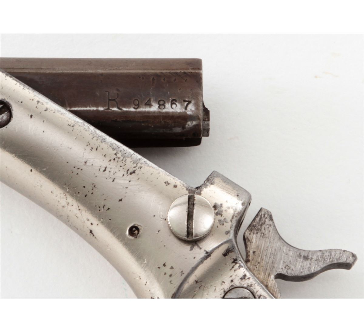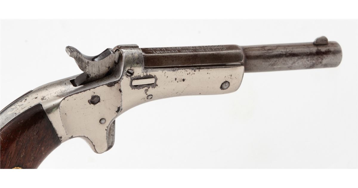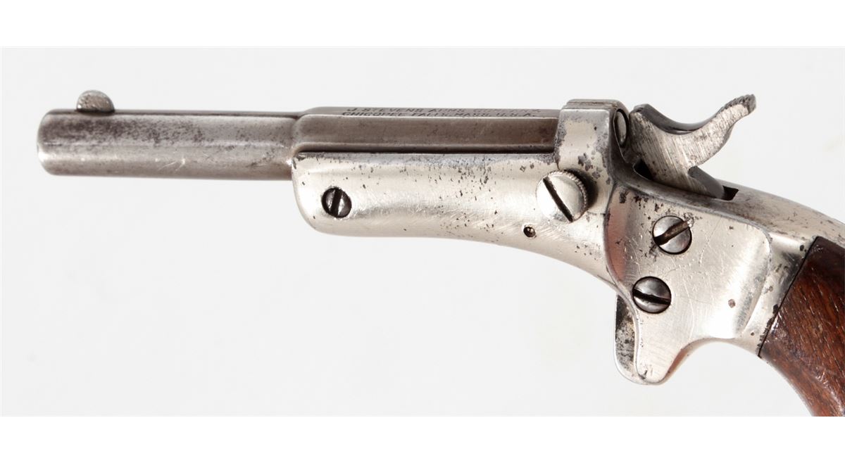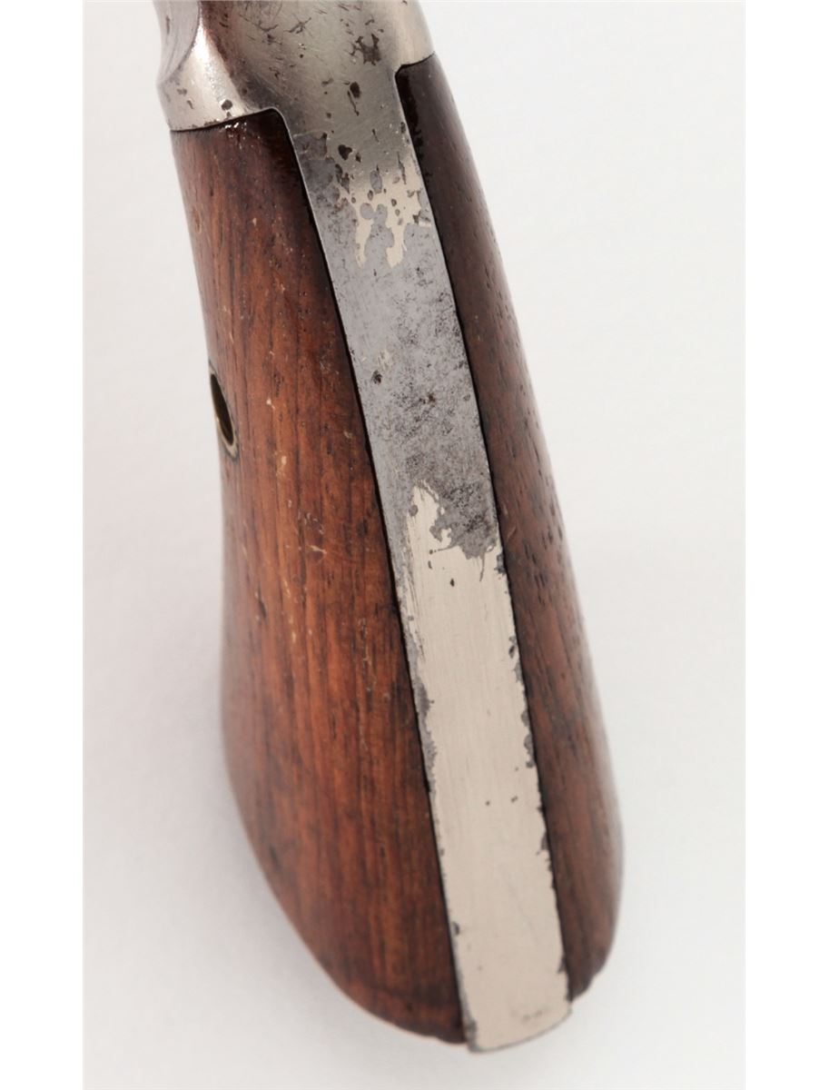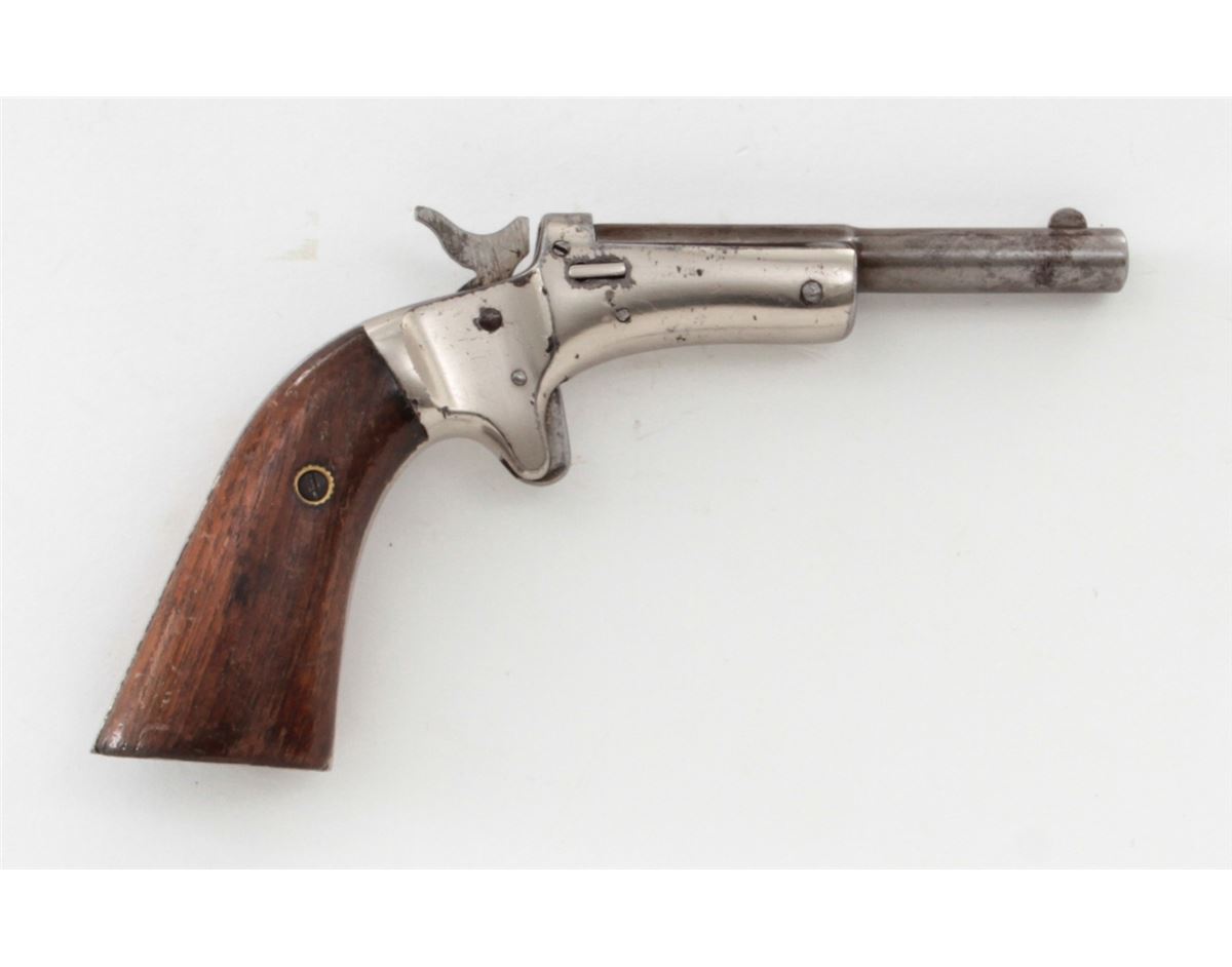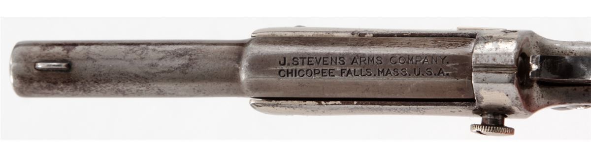 Stevens Diamond No. 43 2nd Issue Single Shot Pistol, #94867, .22 RF cal., 3-3/8'' barrel, nickel frame, long walnut grips. Condition is very good. Barrel retains approx. 20%-30% thinning blue. Frame with scuffs and scratches and light flaking. Grips show thinning to finish and fine scratches. Good action and bore. Est.: $100-$200. (Antique)