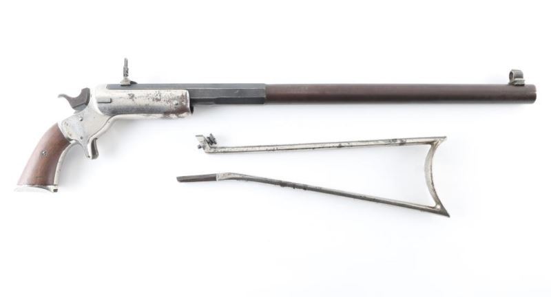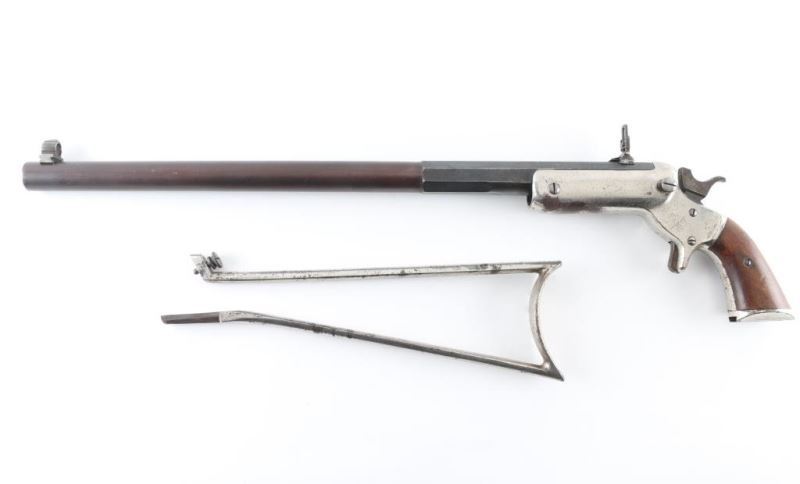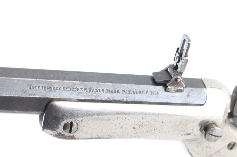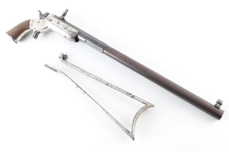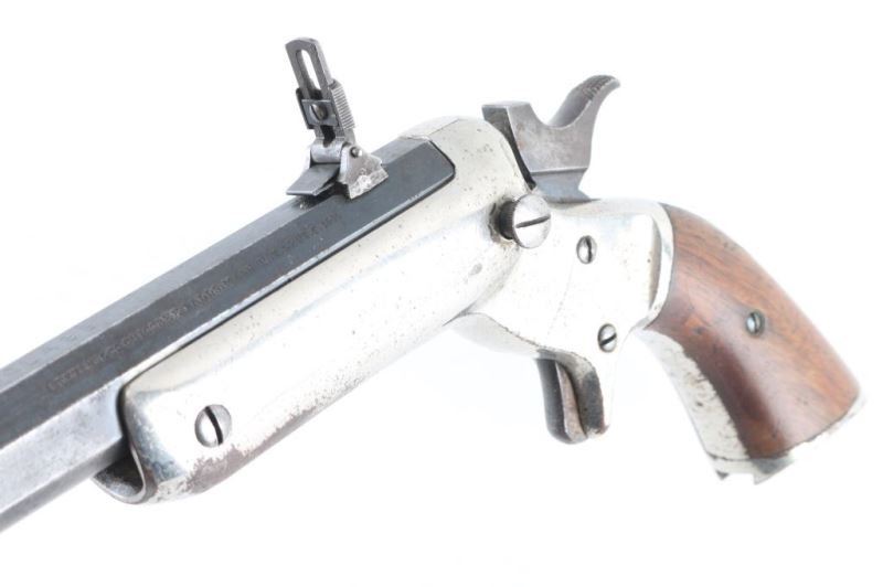 SN 1547. Rifle. Single-Shot. "Tip-Up" Model # 34, (1872-1896) heavy frame type, 1 1/4" width. Early rifle with one-line address on barrel. 22" octagonal to round barrel. Hooded Post bead front sights. Rear adjustable flip sight. Walnut grips. Nickel-plated iron frame. Nickel-plated shoulder stock has matching serial #. Bore is good with strong rifling, dirty. Blued barrel is about 30% with the rest turned a plum color. Action is smooth/tight. Nickel plated frame scratches/dings, and some loss and spots of surface rust. Grips are good. Shoulder stock has spots of rust. Someone has stamped "C.I. Douglass" twice on the the barrel. NRA condition-Good. Antique Firearm.