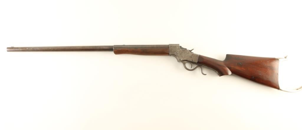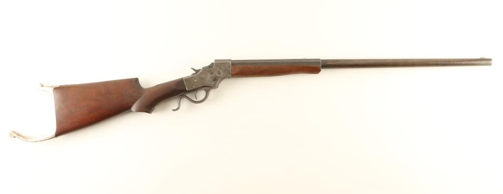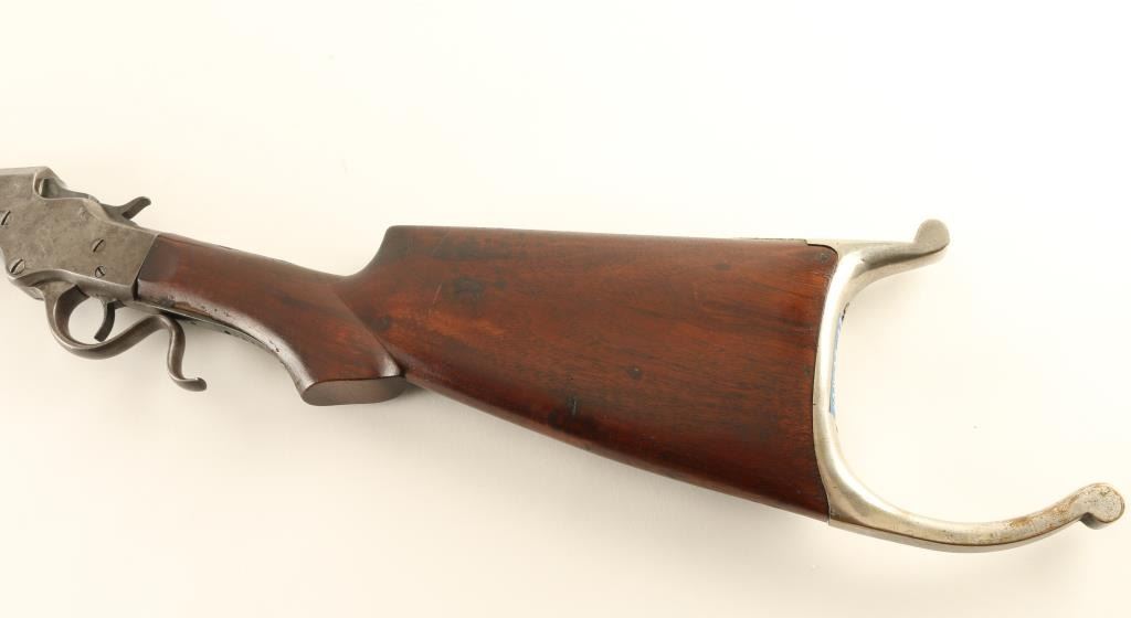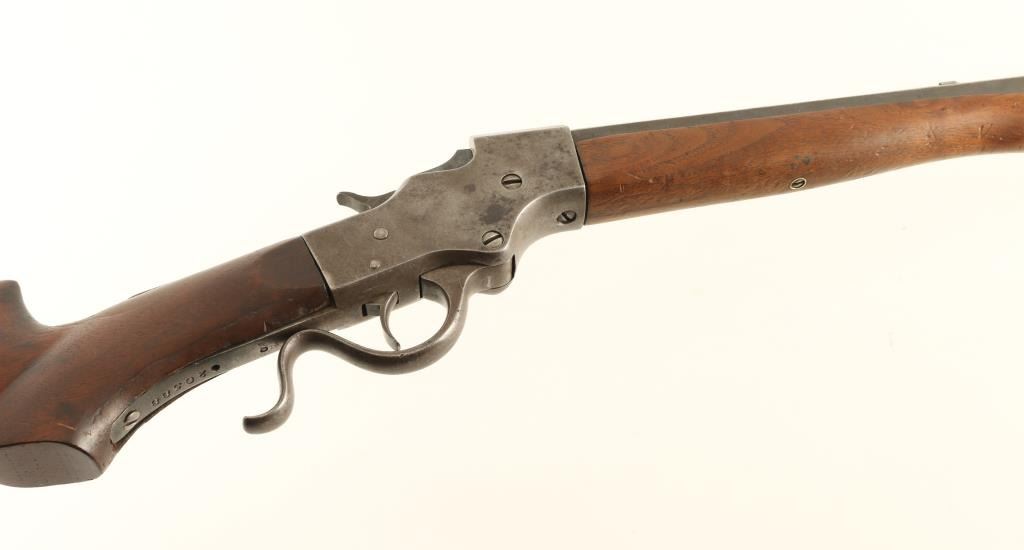 Rifle. Single-Shot. Falling Block Action. Manufactured 1896-1916. The 28" octagon/round barrel has been shortened to approx. 26". Two line address on barrel. Matching serial numbers. Sights removed, barrel drilled/tapped for scope mount. Bore appears excellent. Two piece walnut stock is very good with minor sctraches/rubs. Some chipping around the tang. Nickel Swiss buttplate. Action is smooth, and locks up tight. The case-hardened/blue finish has faded to a brown patina. Blue finish remains on the block. NRA Condition-Good. C&R Firearm.