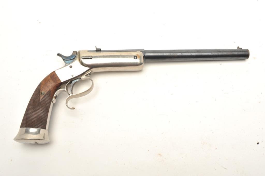 18. The butt is originally period inscribed “ Buffalo Bill To XXXXXX 1882”. Formerly from Bill Molnar collection. The defaced name of recipient has driven collectors nuts for 30 years in So. Ca. where this pistol is well known. The condition is fine to near excellent. (Antique) Est.: $3500-$7000