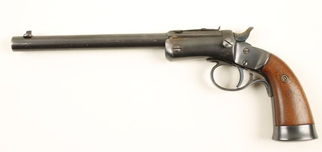 Blued single-shot tip-up pistol with an 8" barrel. Finish is good with only a few slight scratches and edge wear. Function is good. Bore is clean with rifling. Wood grips have one ding. Condition is very good. *Modern Firearm*