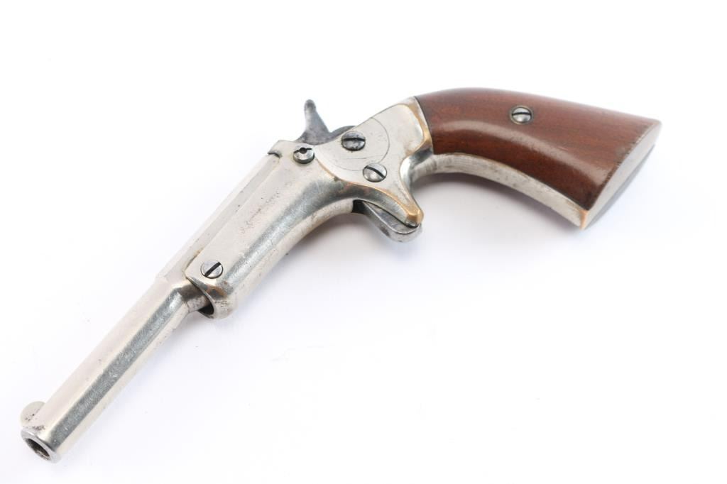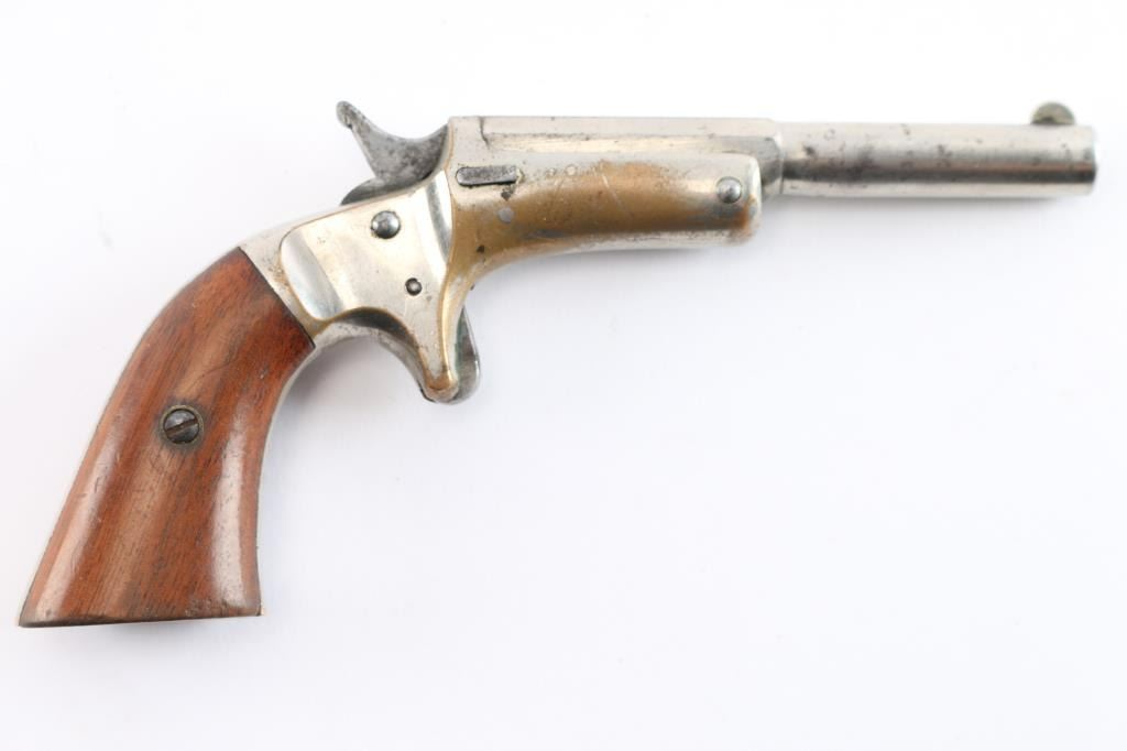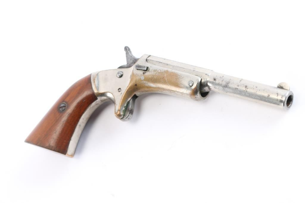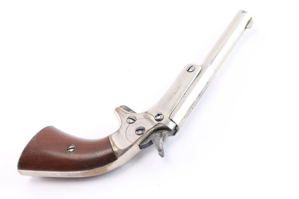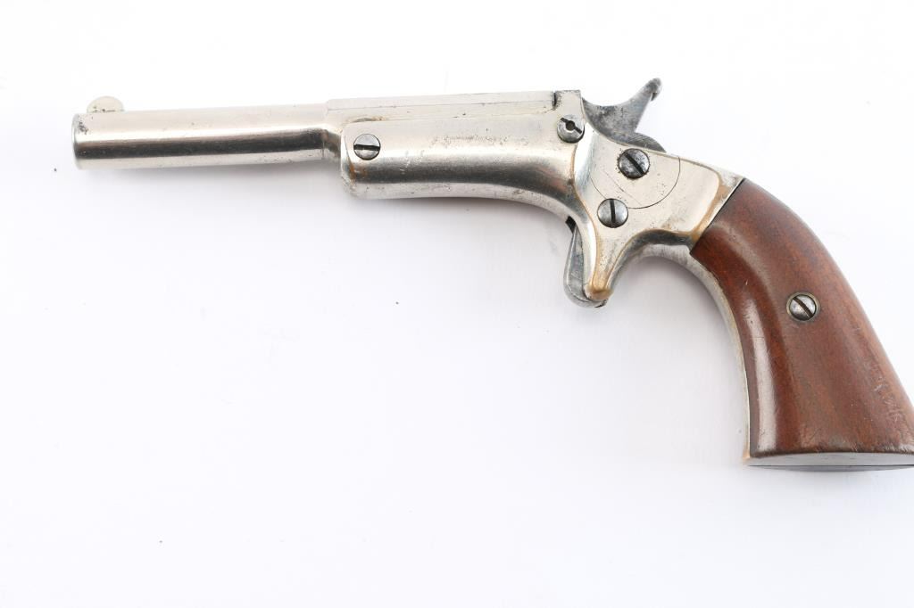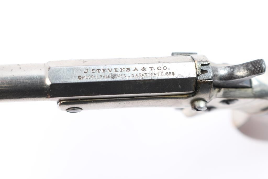 "Tip-Up". Stevens Model 41. 3.5" octagonal to round barrel. "J. Stevens A & T Co." markings on flat of barrel, . Nickel plated brass frame. Smooth walnut grips. Barrel & hammer lock up tight. Bore has rifling scattered light pitting. Frame and barrel have minor scratches/dings. Grips are very good, traces of case colors remain on the trigger/hammer. Nickel finish is about 70% with edge & handling wear, mostly on the right frame.
