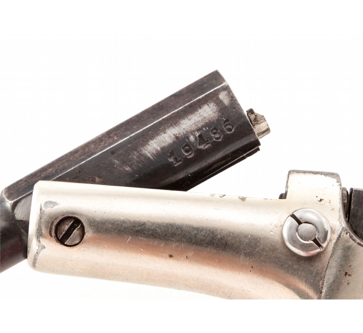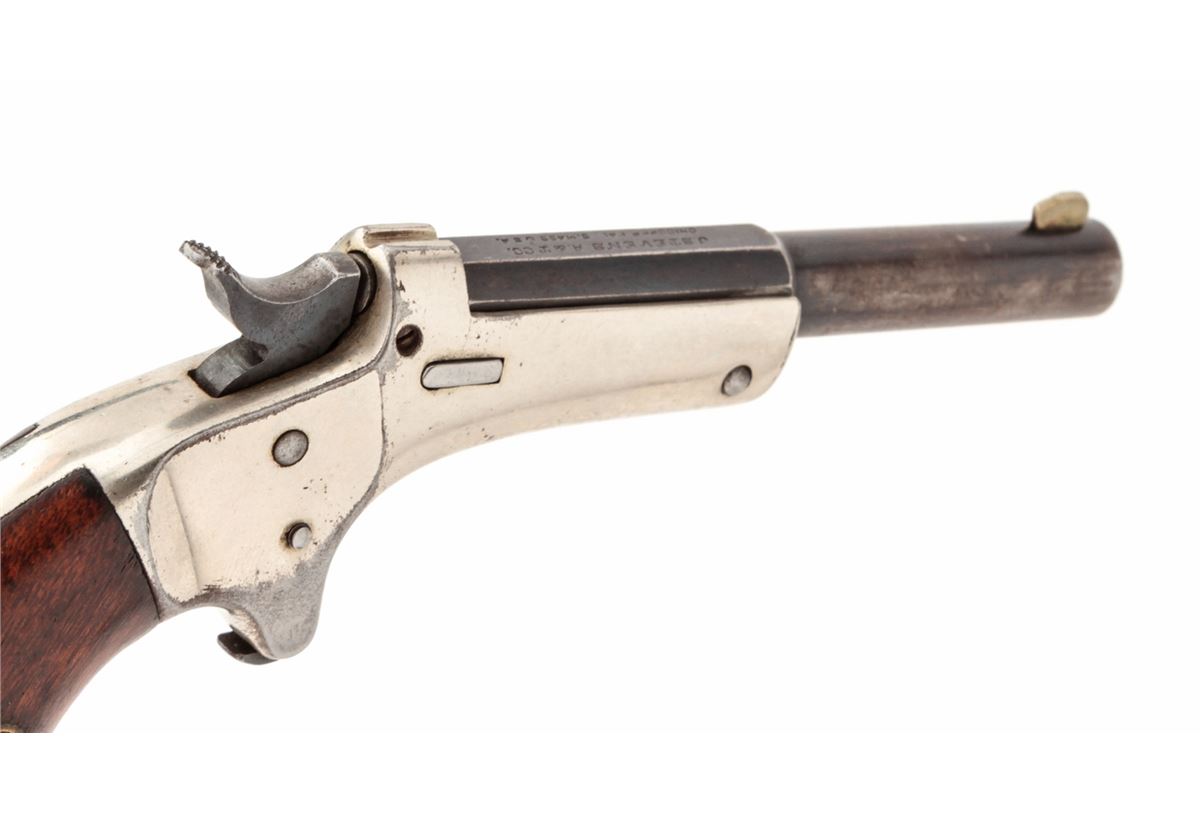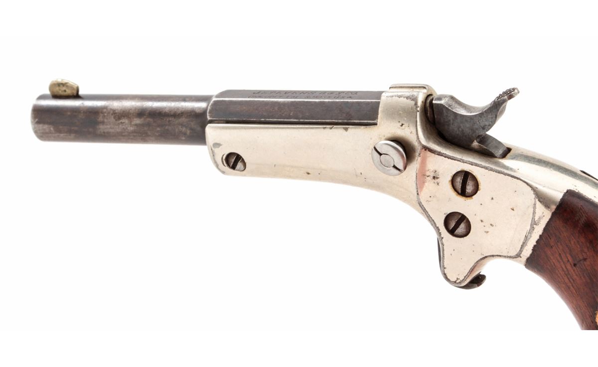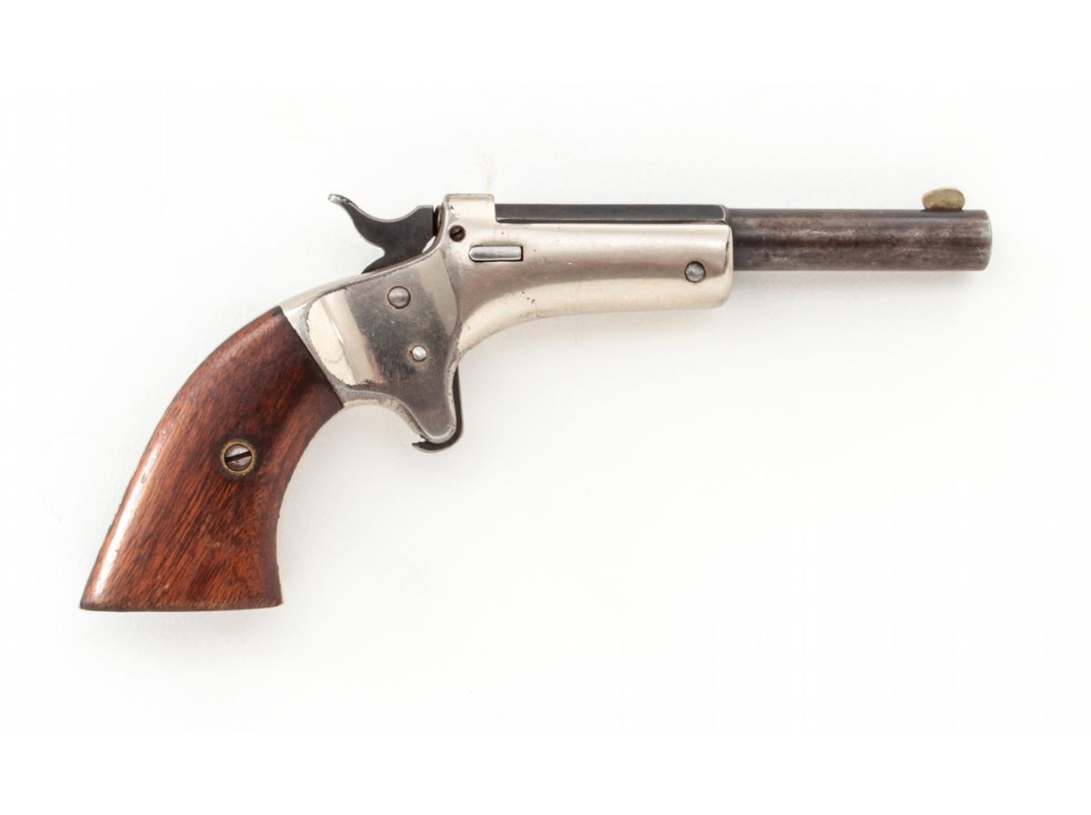 Stevens No. 41 Single Shot Pistol, #19486, .22 Short cal., 3-1/2'' blue barrel, nickel frame, walnut grip panels. Condition is very good. Barrel retains approx. 80% blue; frame with 90% nickel. Grips with light impressions. Front sight may be a later replacement. Good action and fair bore. Est.: $150-$300. (C&R/PPT)