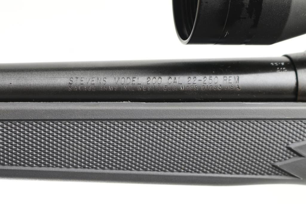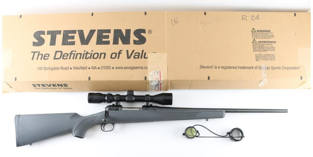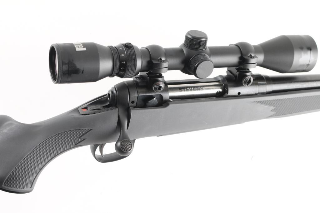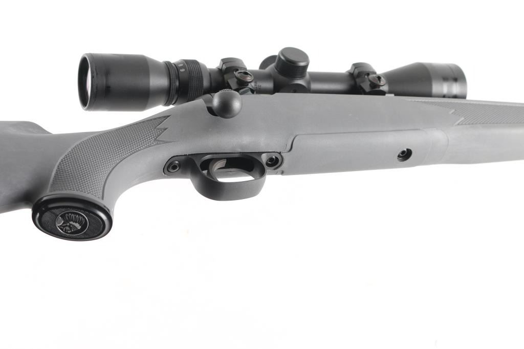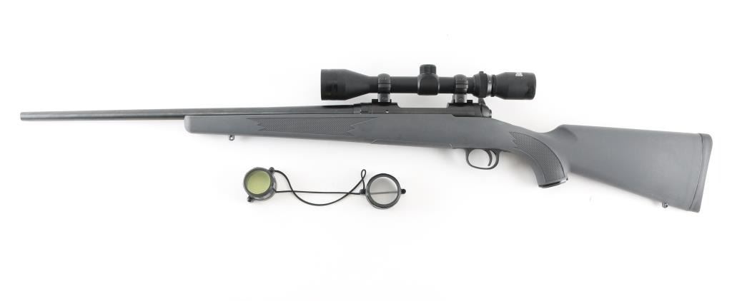 Blued finish, tapered 22" barrel, no sights, factory installed Bushnell 3x-9x40 scope, blind internal box magazine, manual safety, plastic trigger guard, swivel studs, and checkered grey synthetic pistol grip shoulder stock with rubber recoil pad. Bore is excellent. Rifle is as new with factory box, manual, lock. NRA Condition-As New Modern firearm