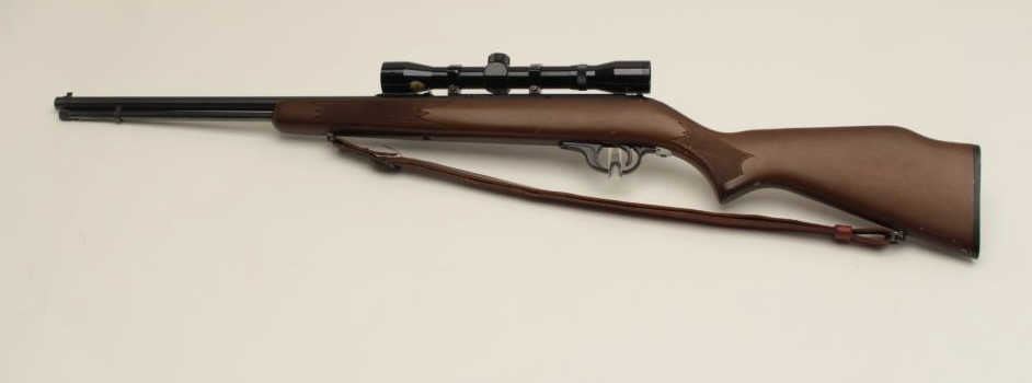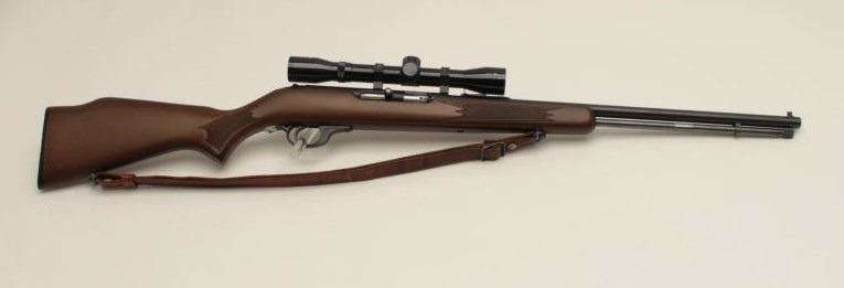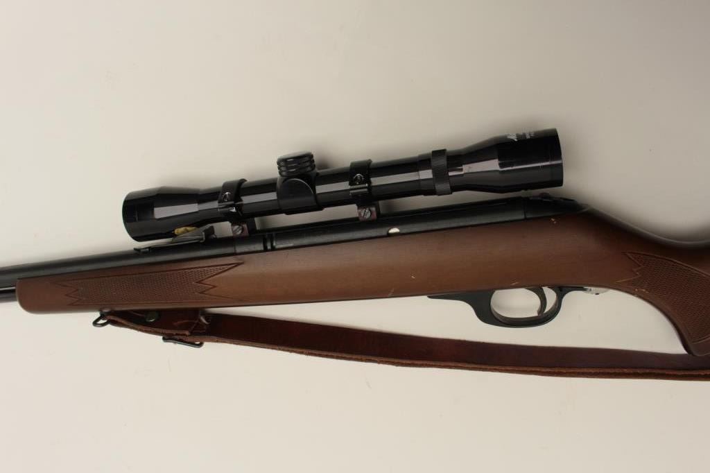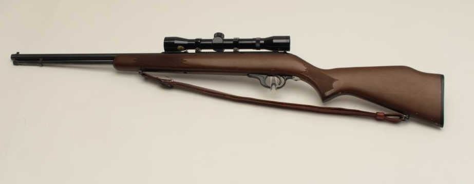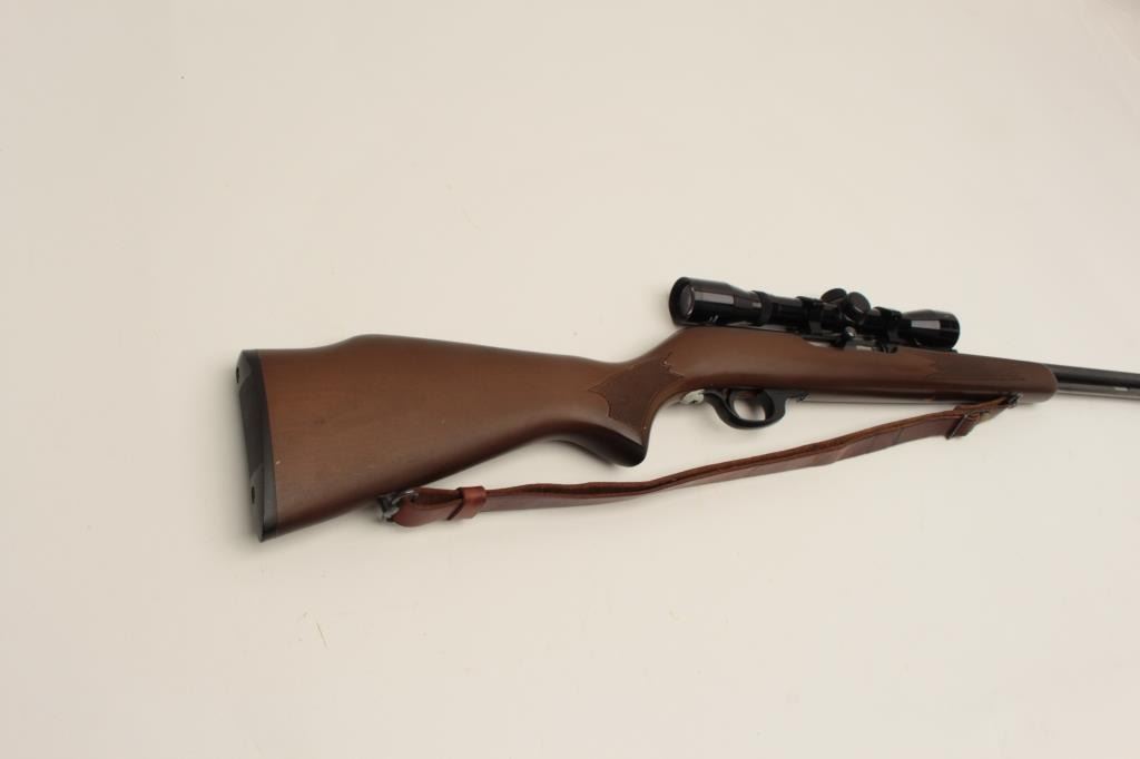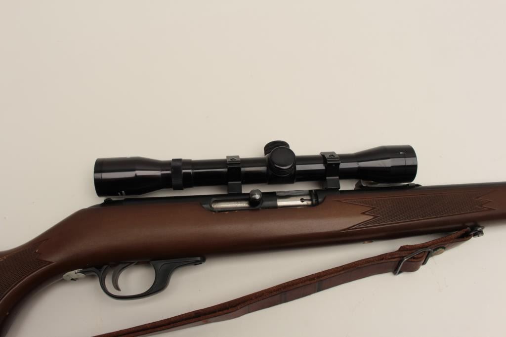 Stevens/Savage Model 987 semi-automatic rifle, .22LR caliber, 20” barrel, black finish, wood stock with leather sling, S/N E447748, in overall very good to near fine condition with majority of original finish,fine bore, action and markings, very good stock with an old repair to back end of trigger guard. (Modern/No PPT). Est.: $90-$180.