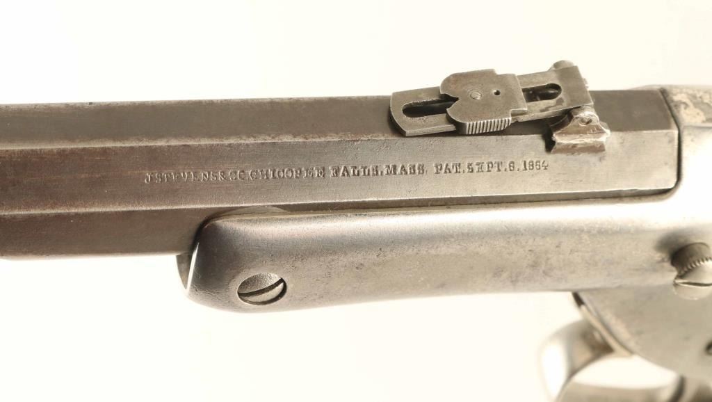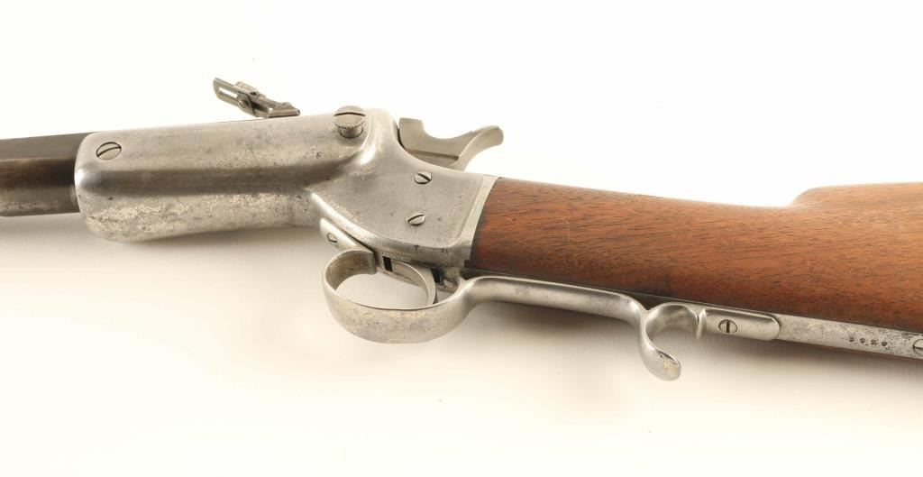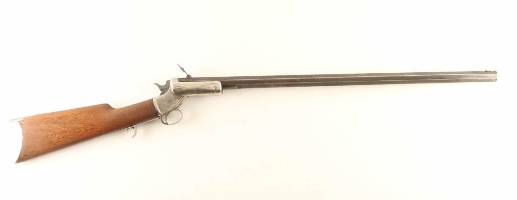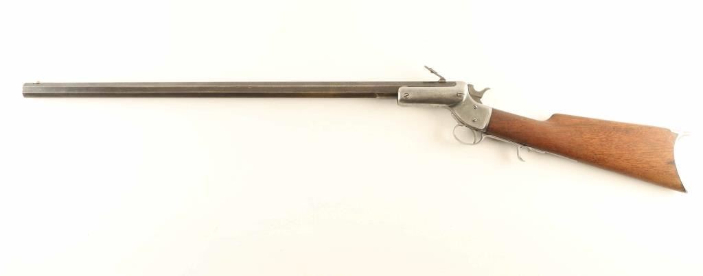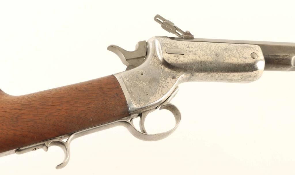 Single shot rimfire rifle features blued barrel, nickel plated action, wood butt with straight grip, crescent buttplate, 26" heavy octagonal barrel, blade front sight, folding ladder rear sight with elevator slide, external hammer. Bore is fair condition, frosted and dull with fairly sharp rifling. Barrel retains 50% finish, mostly turned gray or dark plum, with bare metal showing at edges of flats. Receiver retains 20% nickel finish, peeling to reveal bare metal, overall bright, many tiny pits on left side & both tangs. Wood is good serviceable condition, with loss of finish, some discoloration, some shrinkage at buttplate. Buttplate is bare metal, with many areas showing even shallow pitting. Condition is NRA Very Good *** Antique Firearm ***