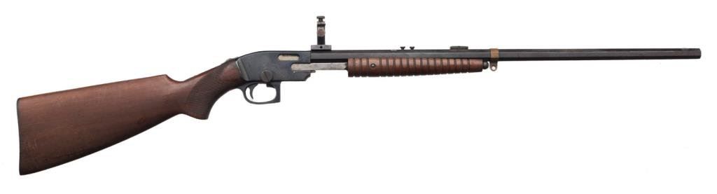 *Stevens pump action rifle, .22 caliber, 24” octagon barrel, S/N 144997, no magazine, blued finish, checkered wood butt stock, scope mounts on top of barrel with rear scope ring; fair to good condition with considerable blue finish under a layer of grime that may clean; bright bore, good action and markings, overall good wood that also needs cleaning. Est.: $100-$200.
