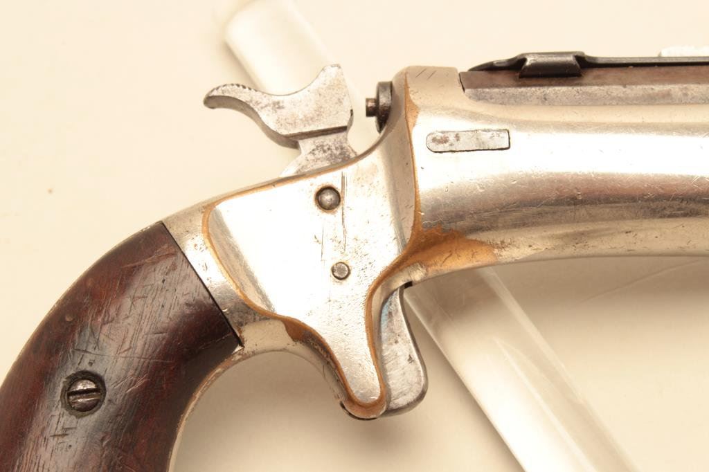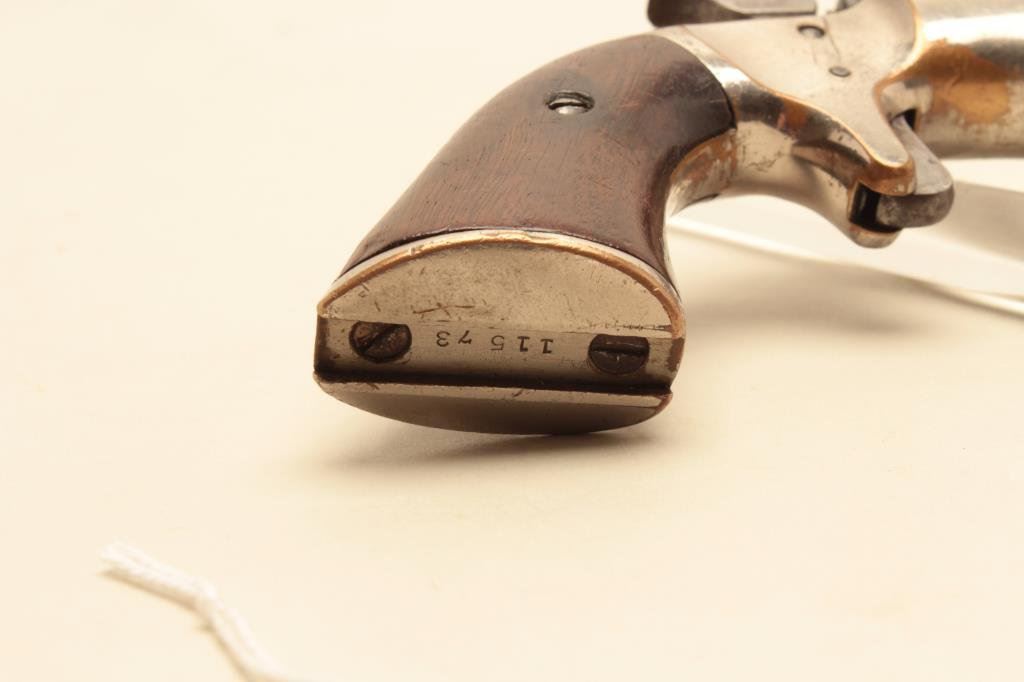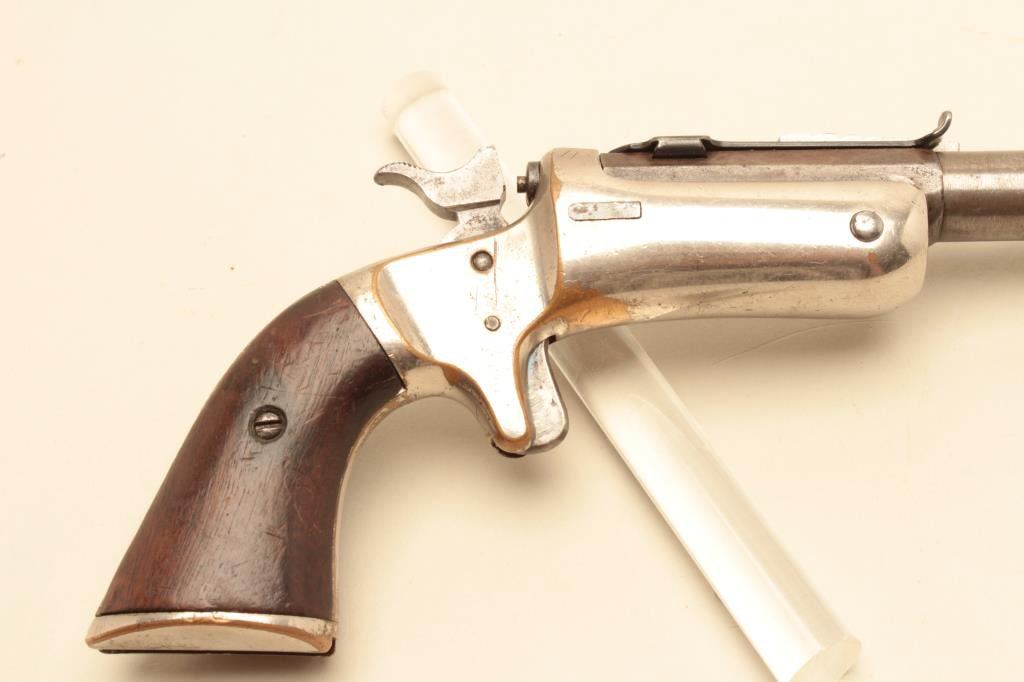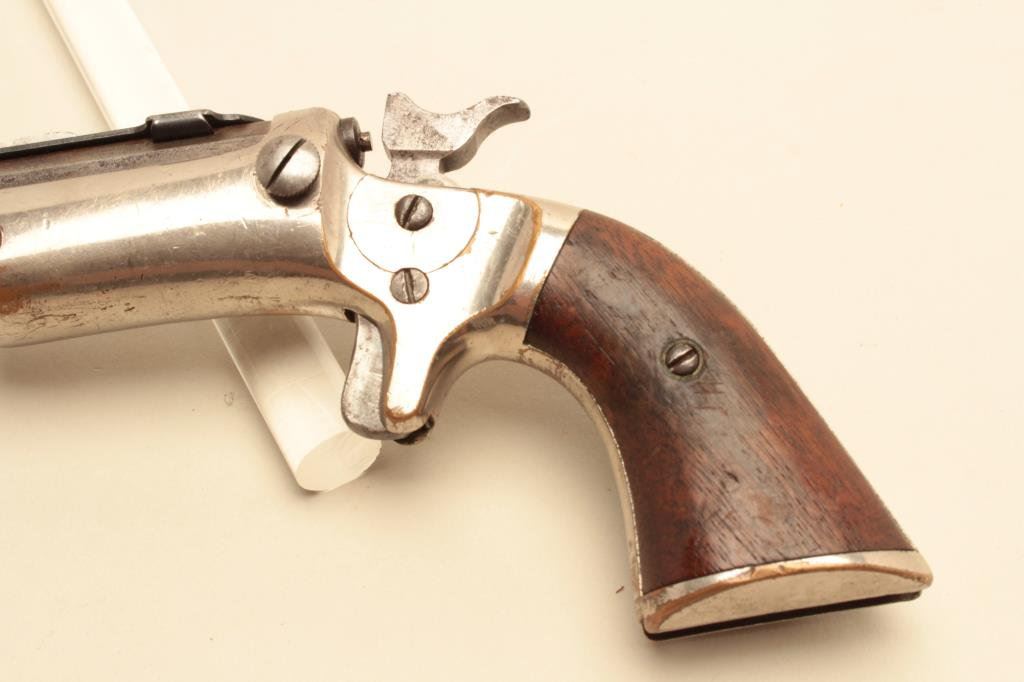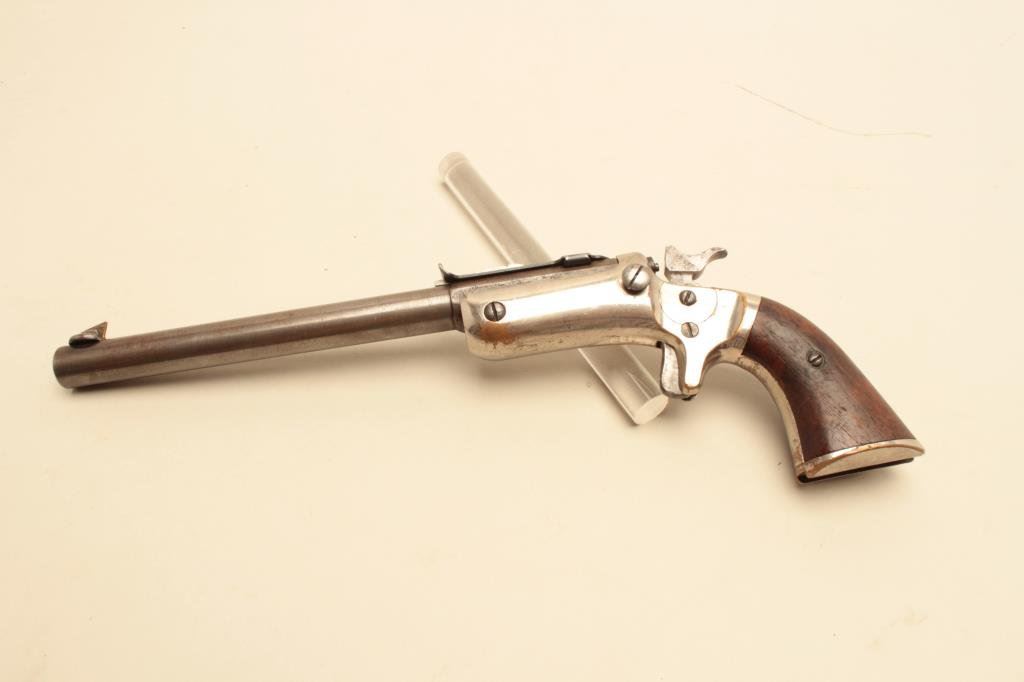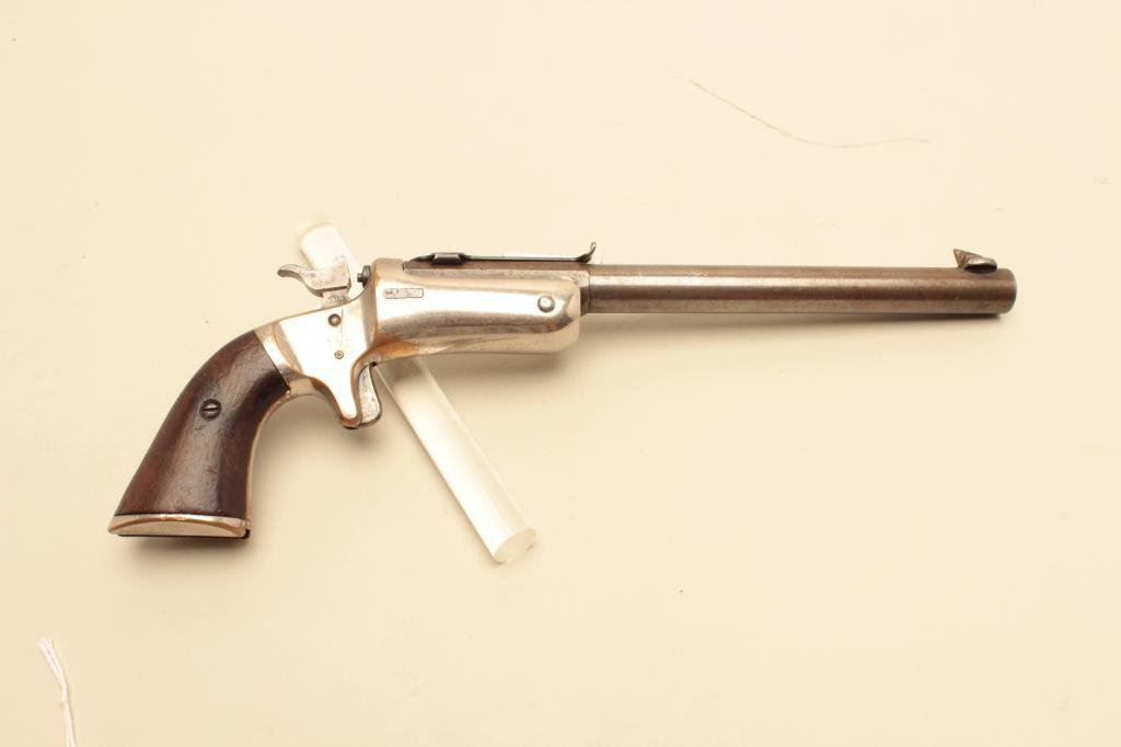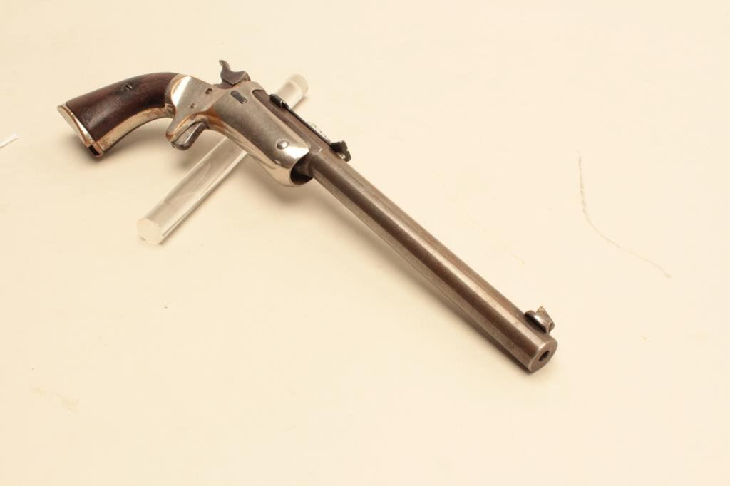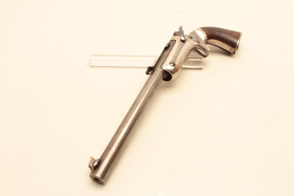 stock), .22 caliber, 8” barrel, silver wash to brass frame, wood grips, S/N 11573, in overall good condition with a good bore, crisp action, good markings and good grips. (Antique). Est.: $150-$300.