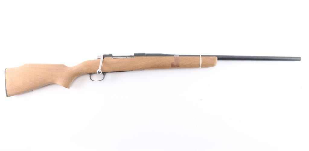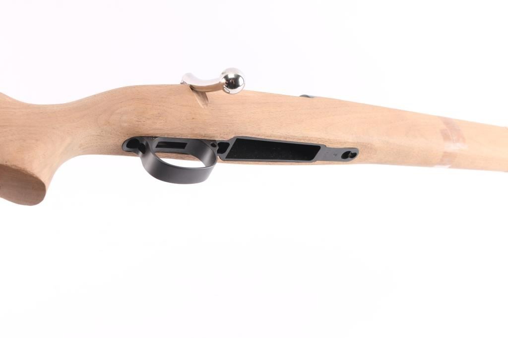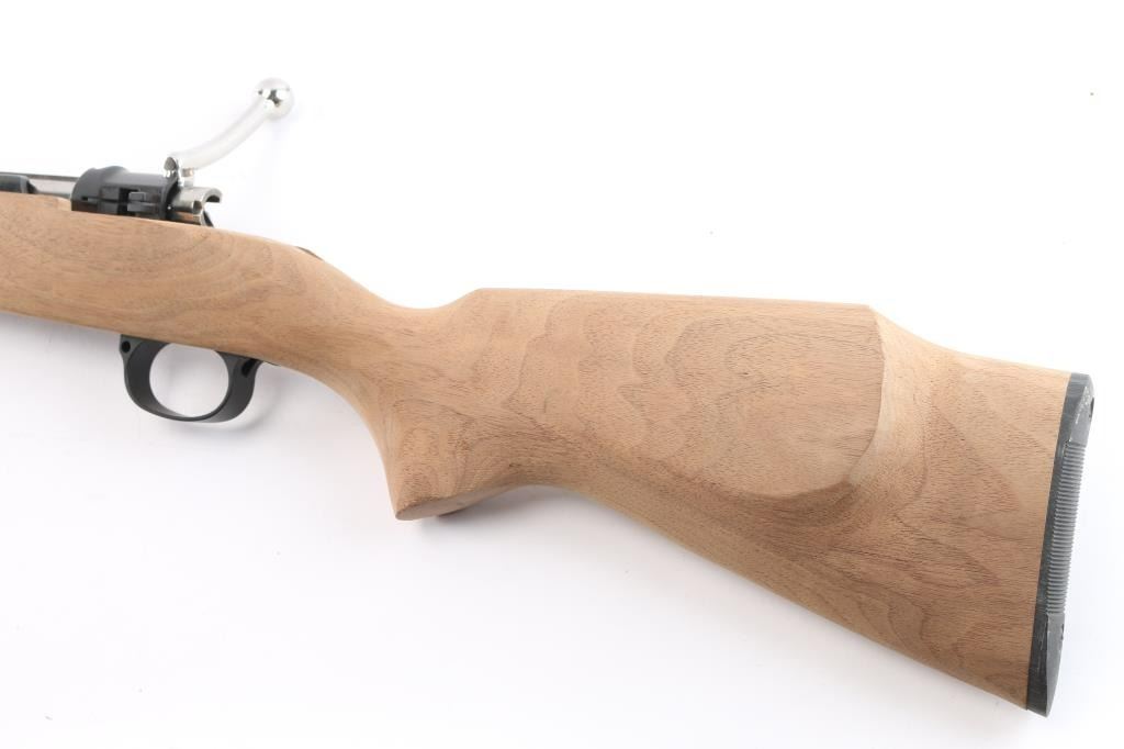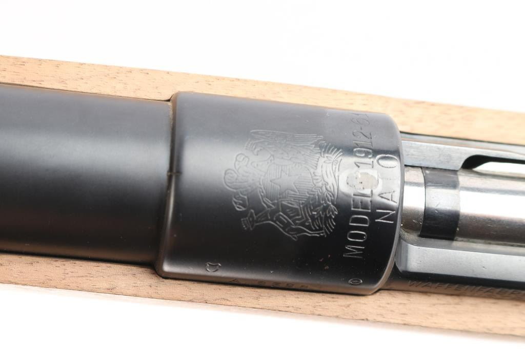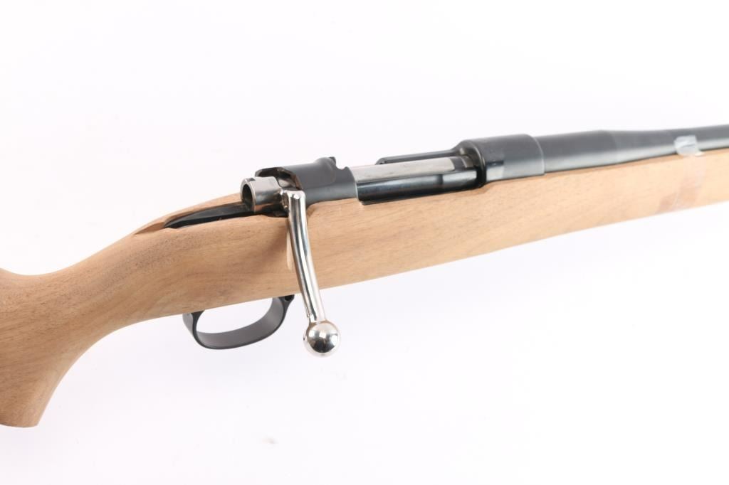 Project Rifle. This is a Chilean military contract 1912-61 Steyr Mauser rifle that is is the process of being converted to a sporter rifle. 23" tapered barrel, no provisions for sights, Steyr receiver and trigger guard assembly with matching serial number, the stock has not been finished, includes buttplate, 3 1/2" long, upswept bolt handle on the stripped bolt except for the extractor. No trigger assembly, bolt release, floorplate or screws. The metal parts have a matte finish. The chamber has the Chilean crest, marked Model 1912-61 Nato. As it has been re-barreled, we are not sure of the caliber. The existing parts are in excellent condition.