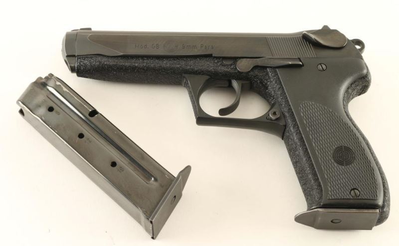 'GasBremse' Austrian made gas-delayed-blowback operated double action semi-automatic pistol chambered in 9x19mm, circa 1970's-1980's. Designed to meet the requirements of the Austrian military, it competed for the contract in 1982 but lost to the Glock 17. Imported by Gun South Inc. of Trussville, A.L. with import stamp on the top of the slide. Features a blued finish on the slide, 5.45" barrel w/ polygonal rifling, fixed three-dot sights, serrated trigger, skeletonized hammer, thumb decocking lever, push button magazine release, 18 round magazine, black crinkle finished steel frame and two-piece checkered black synthetic grips w/ Steyr insignias. Includes a spare magazine. Pistol exhibits approximately 97% of it's original finish showing some handling marks on the slide and light slide wear on the barrel. Action is crisp, bore is pristine and synthetic grips are fine. Condition is NRA excellent. ***Modern Firearm***