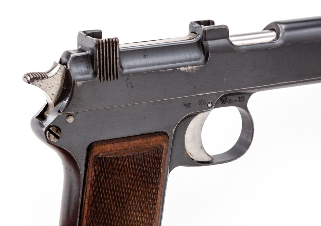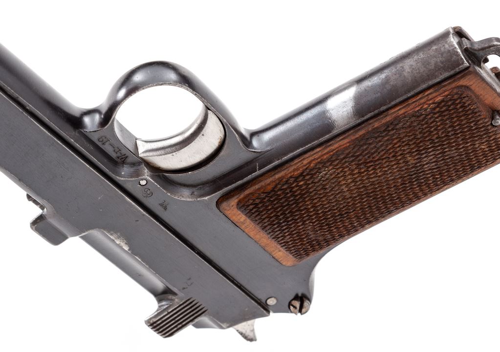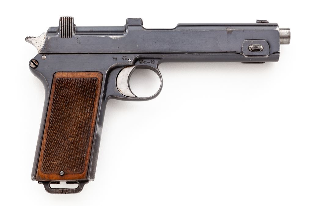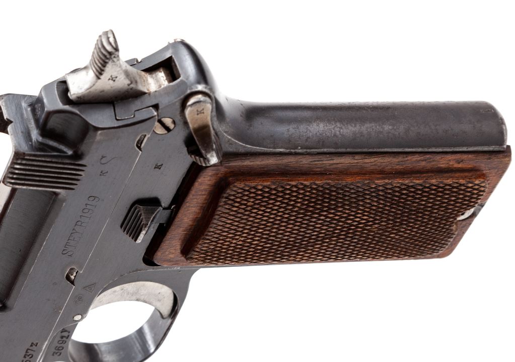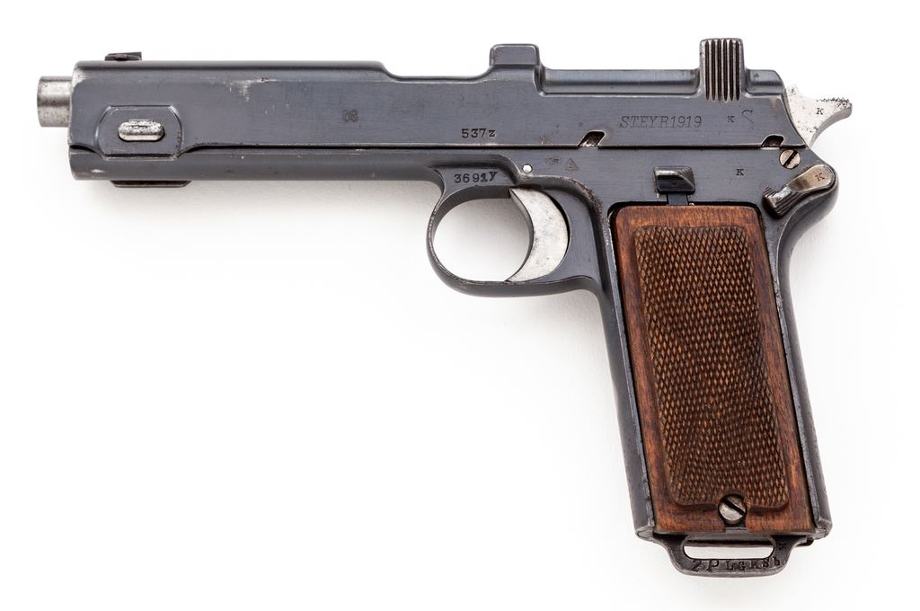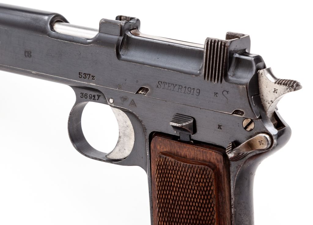 Steyr-Hahn Model 1912 Semi-Automatic Pistol, with military proofs, #3691y, 9mm, 5.125'' barrel, blue finish, straw small parts, factory checkered walnut grips, with lanyard loop. Left side of slide marked ''Steyr 1919'', as well as ''08'' and ''S'', indicating conversion to 9mm Parabellum. ''(Stick eagle)/L'' proofmarks to right side of frame, indicating Police use, as well as 'W-r.-19'' marking to right side triggerguard bow. Lanyard loop area marked with WWI era regimental markings. Pistol also exhibits ''(eagle)/N'' and ''(triangle)/O'' markings, as well as ''K'' inspector markings to small parts. Front sight is drift adjustable and appears to be factory. Slide is numbered ''537z''. Condition is fine as converted, retaining approx. 85% overall generally thinning blue. Grips are excellent and show only minor flattening to checks. Action is crisp, bore is mirror bright. Est.: $1,000-$1,500. (C&R/PPT)