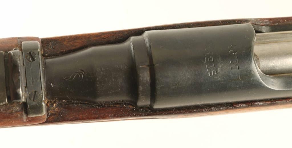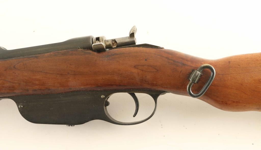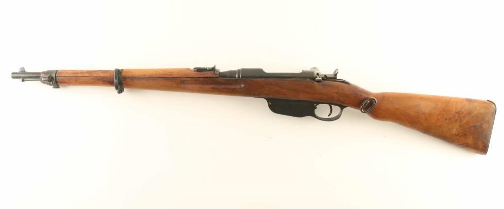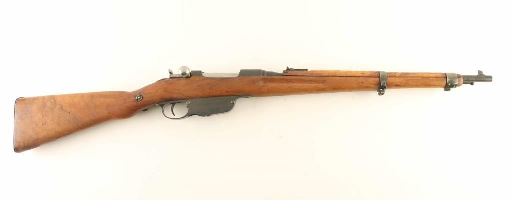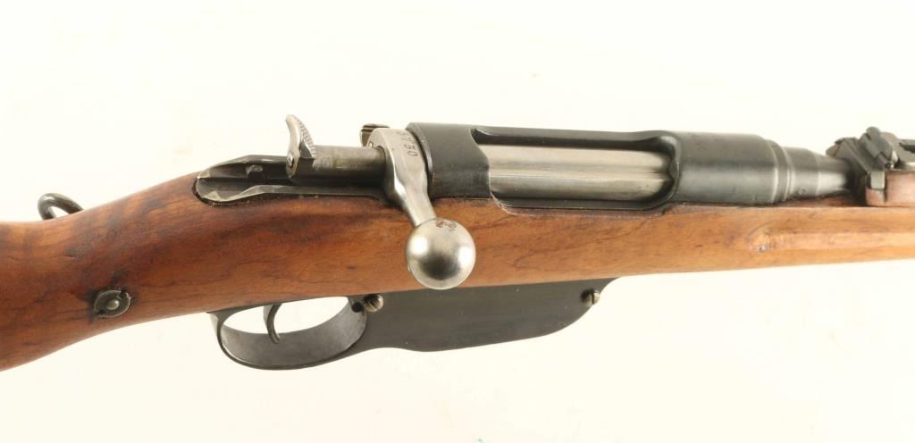 Austrian military straight pull bolt action rifle imported by CAI, St Albans VT. Carbine or Stutzen length, features blued finish, bolt assembly in the white, wood stock with semi pistol grip shaped wrist, 19.5" barrel, side mounted sling swivels, bayonet lug, stacking hook, blade front sight, flip-up ladder rear sight, manual safety, Rear sight is shorter carbine type, front sling mount is non-swivel type with large fixed loop. Bore is good condition, dark in grooves with strong rifling. Retains 75% bluing with discoloration and bare metal on bands, bare metal on many edges. Stock is good serviceable condition, appears sanded with fair fit to buttplate, thinning of wood depth on left side, filled oval on toe line from previous rifle type swivel installation. Bolt is re-marked to match rifle serial number on hanfle, with different number remaining on knob. Condition is NRA Good *** C&R Firearm ***