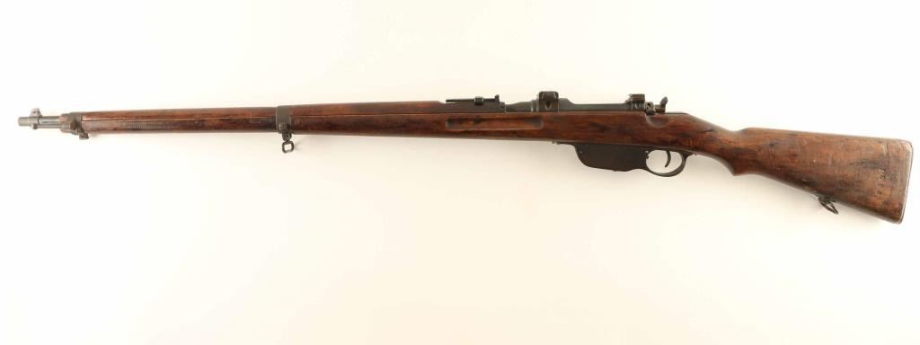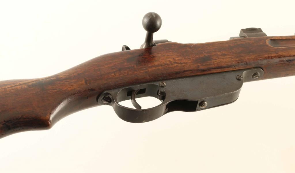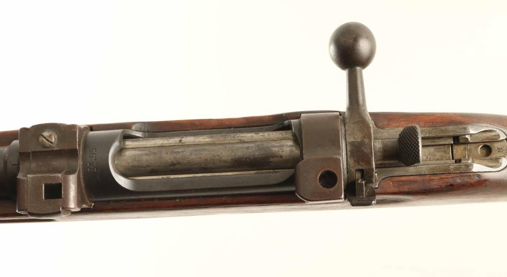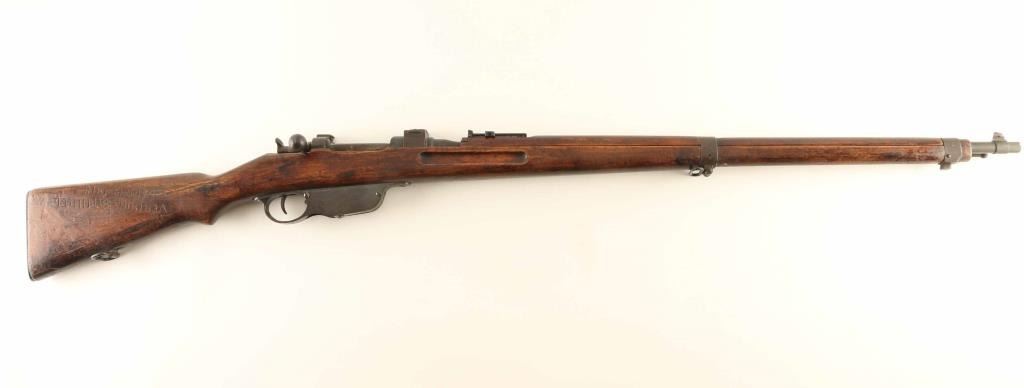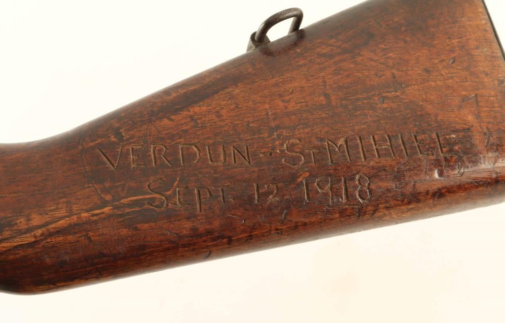 Austrian military straight pull bolt action rifle features blued finish, full length wood stock & handguard, 30" barrel, blade front & folding ladder rear sights, stacking hook, manual safety, sling swivels, offset bases for claw type scope rings (no rings or scope present). Bore fair condition, dark with visible strong rifling. Bluing is now mostly patina brown, including the originally in-the-white bolt, with even pitting on some surfaces such as stacking hook. Wood is in good serviceable condition with many dings and dents, appears lightly sanded, with evidence of a light varnish coat. Right side of butt is carved in 1/2" tall block letters "VEDUN - ST MIHIEL / SEPT 12, 1918". Serial number visible on barrel & stock, forward scope base is numbered "7198 / M". No import marks observed. Condition is NRA Good *** C&R Firearm ***