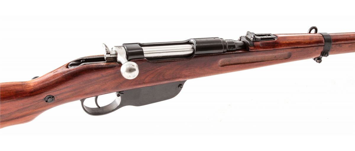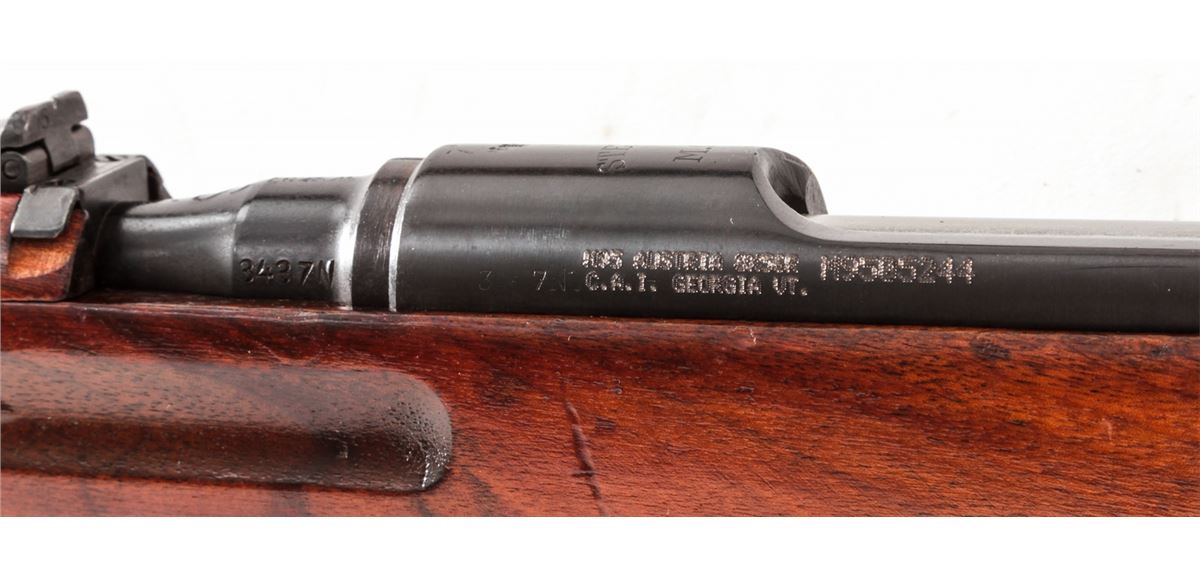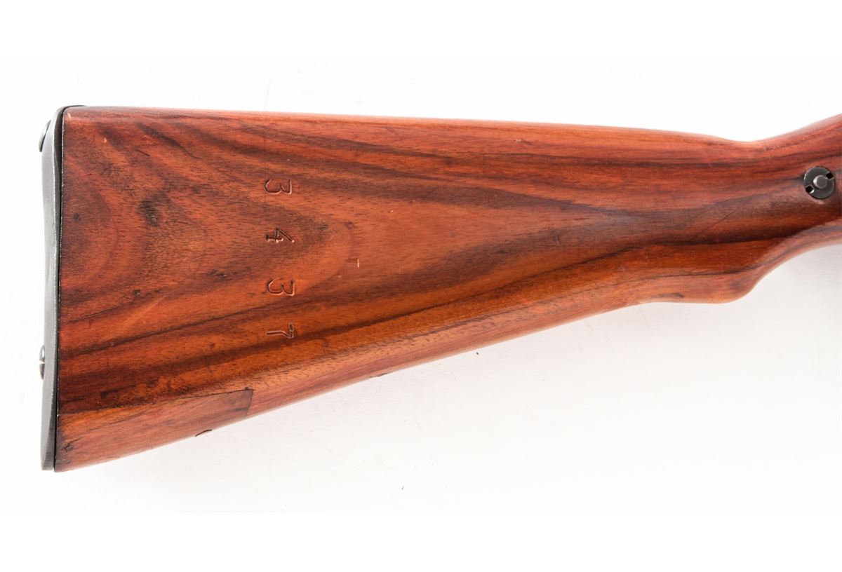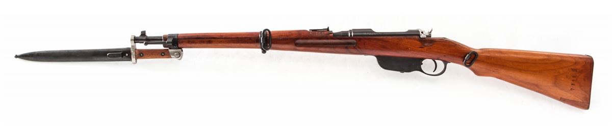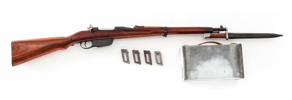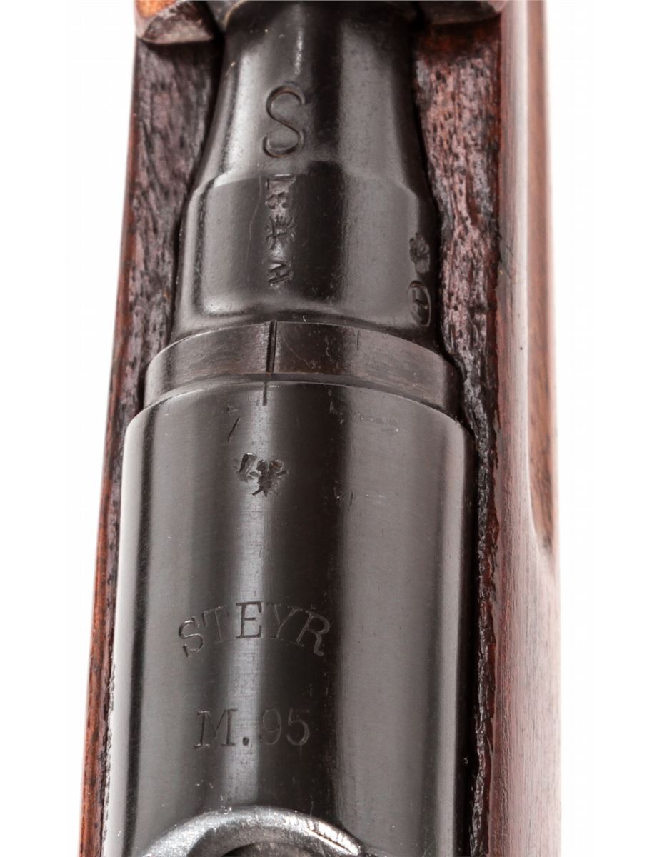 Steyr M95 Straight-Pull Bolt Action Rifle, #3437M, 8x56R cal., with bayonet, scabbard, one large tin of ammo, and four (4) stripper clips; 20'' barrel, blue finish, walnut stock and handguard. Condition is excellent as arsenal overhauled and import marked, with mixed parts. Crisp action, good bore. Est.: $250-$400. (Antique)