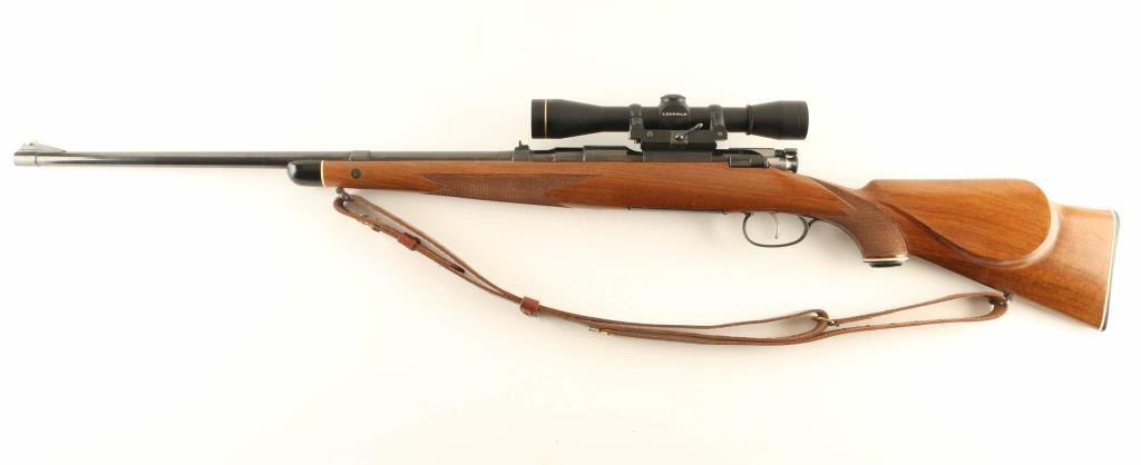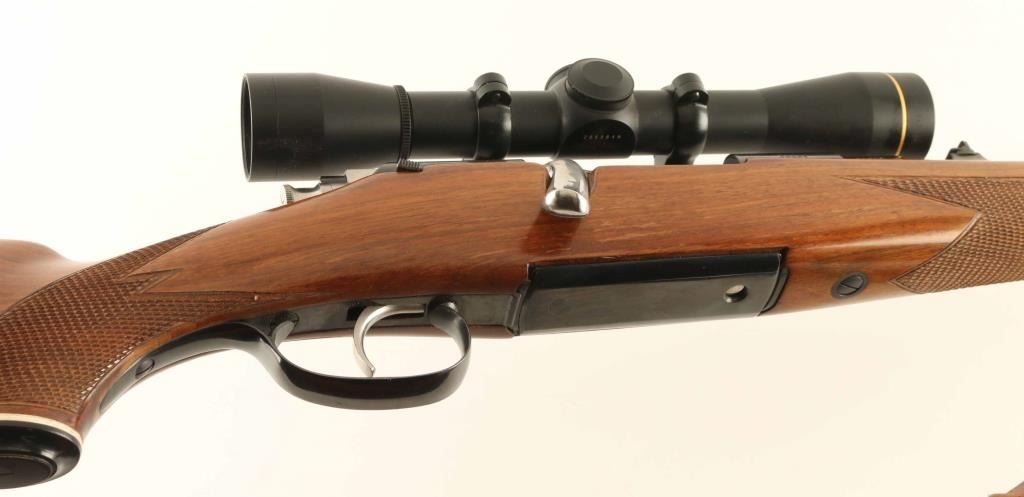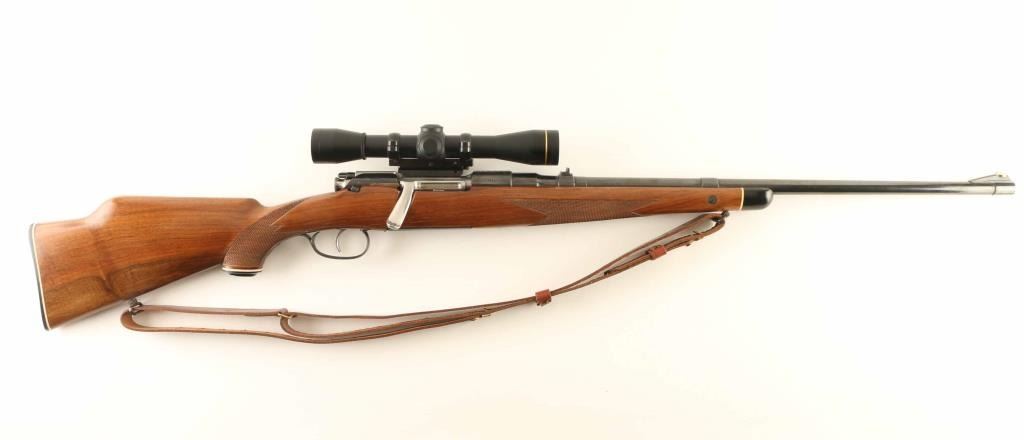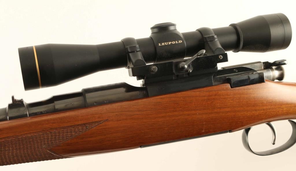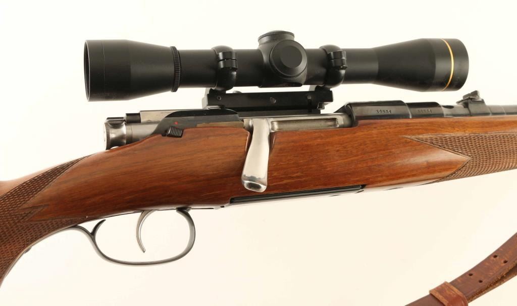 Austrian bolt action rifle features blued finish, bolt assembly mostly in-the-white, wood stock with checkering at wrist & forend, right handed cheekpiece, flat plastic buttplate, black forend tip, 24" barrel, blade front sight, island rear sight with one standing & one folding leaf, single trigger, fixed rotary magazine, sling swivels, Paul Jaeger offset scope base & rings with quick detach lever. Bore is excellent. Retains 85% blue with scuffs and scratches, signs of handling. Stock is excellent. No importer marks observed. Mounts a very good condition Leupold FX-II 4x33mm scope, duplex reticle with clear view. Includes a very good condition leather sling. Condition is NRA Very Good ++ *** C&R Firearm ***