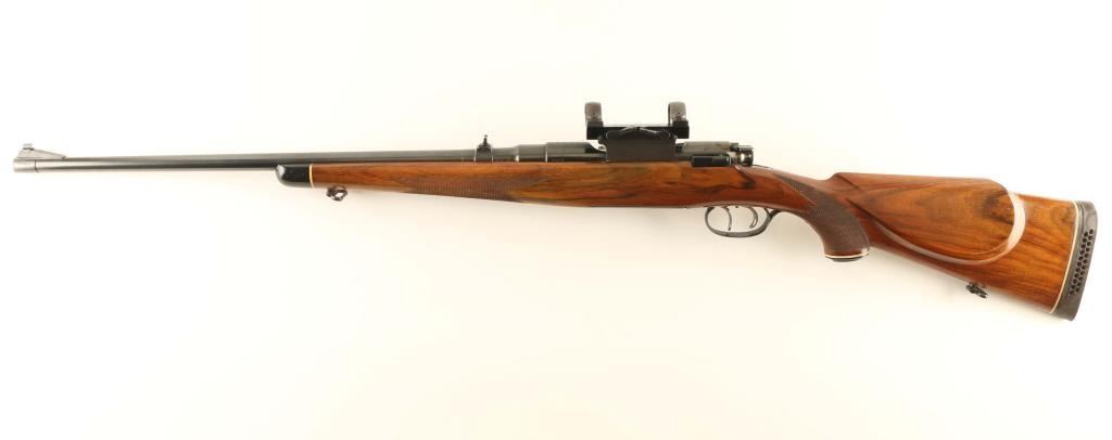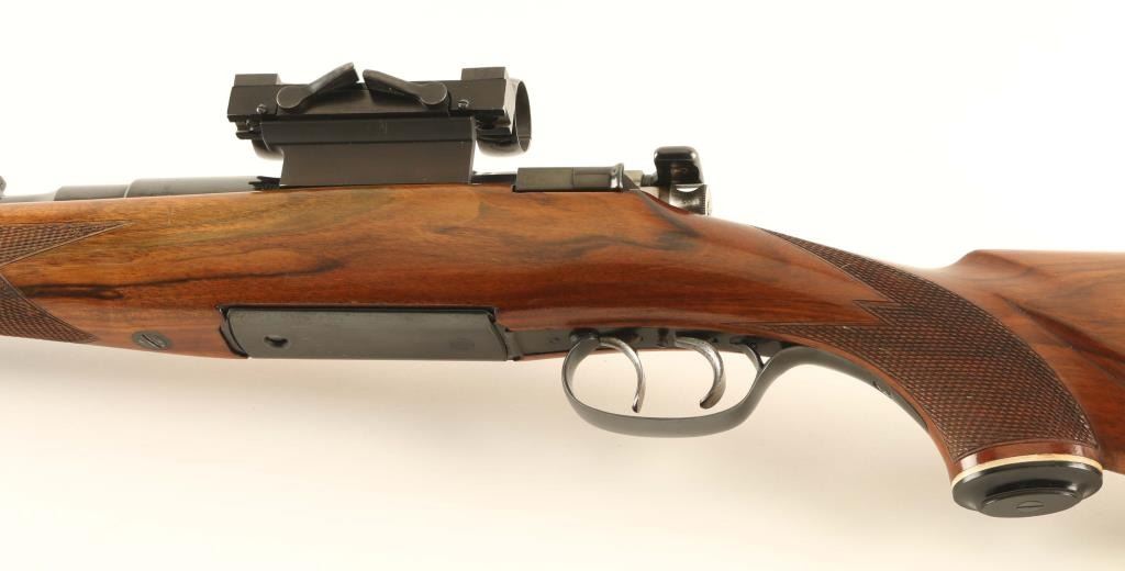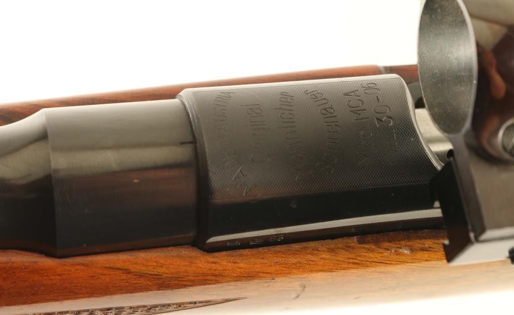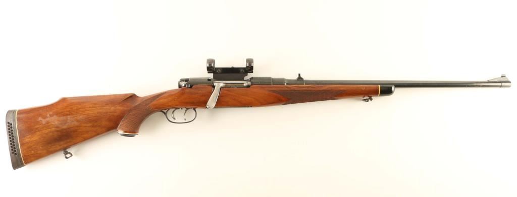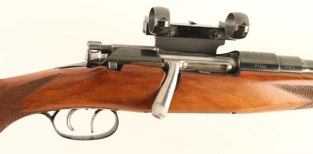 SN: 41788 High quality bolt action sporting rifle chambered in .30-06 Springfield, manufactured in Austria by Steyr-Daimler-Puch A.G. circa 1963. Features a blued finish, 22" tapered barrel, ramped blade front sight with brass bead, adjustable flip-up rear sight, installed Griffin & Howe side mount scope base with 1” rings, double set triggers, swept-back butter knife bolt handle, two-position flag safety on the rear of the bolt, manual safety on the right side of the receiver, removable rotary magazine, and semi-pistol grip walnut shoulder stock bordered point checkering, right handed shadow line cheek piece, sling swivels, black grip/forend caps, aftermarket recoil pad & 15” LOP. Matching serial numbers are found on the receiver, barrel and bolt handle. Rifle retains approximately 90% of its original blued finish showing light scratches, some scattered finish loss and a small amount of oxidation/surface rust. Action is sound, the bore is dark with pitting throughout, and the wood stock is good with blemishes & small losses around the scope mount. Condition is near NRA Good. ***C&R Firearm***