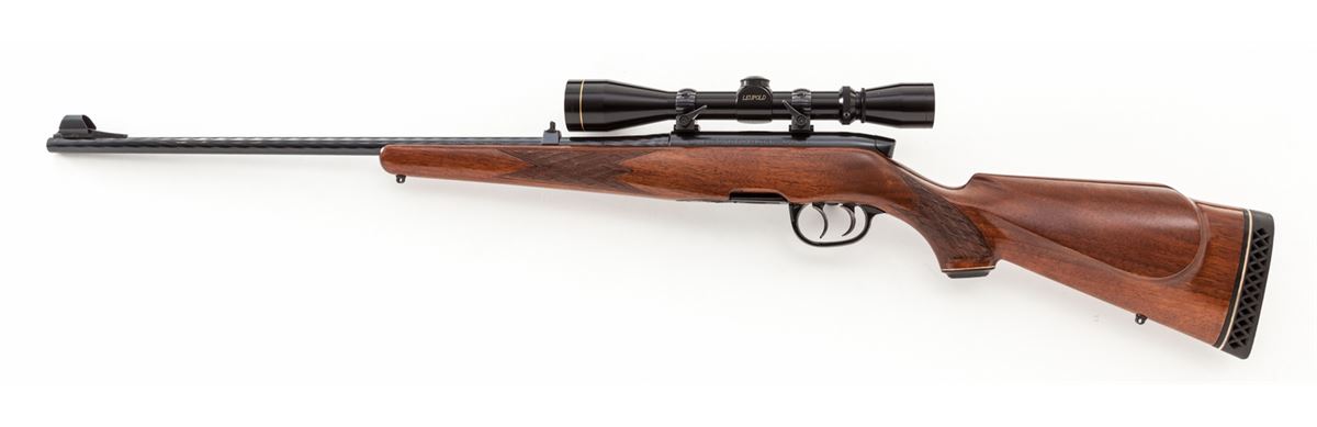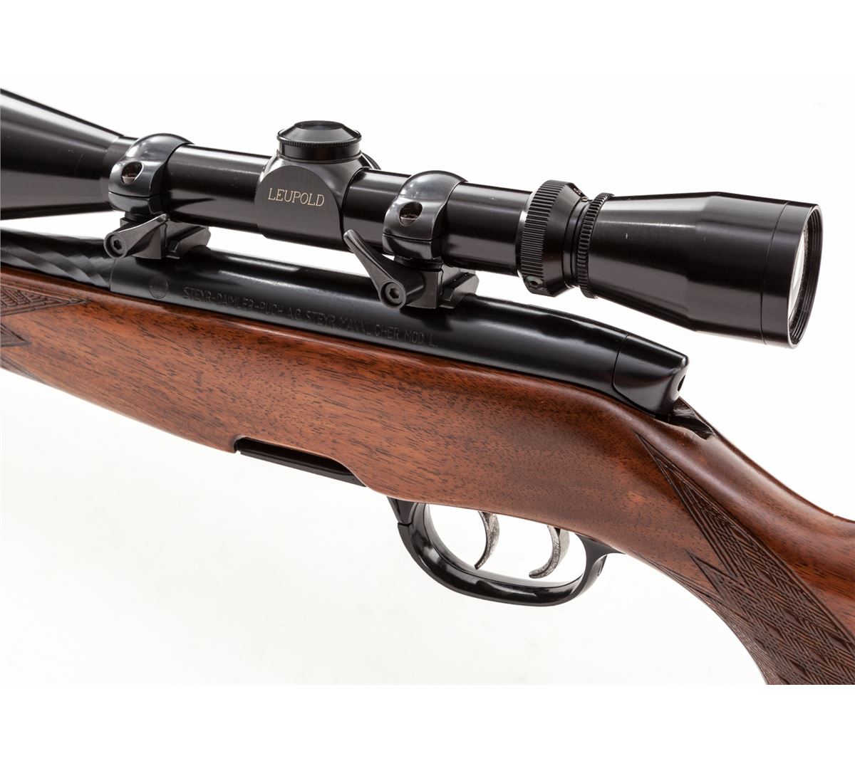 Steyr Model L Bolt Action Rifle, #16100, .243 cal., 23-1/2'' barrel, blue finish, double set triggers, skipline checkered walnut stock, with Leupold 3x9 Vari-X II scope and one removable magazine. Condition is excellent with Stoeger importation markings, retaining approx. 98% blue. Stock with minor impressions. Good working set trigger. Clear scope optics. Magazine shows repair. Good action and bore. Est.: $650-$800. (Modern)