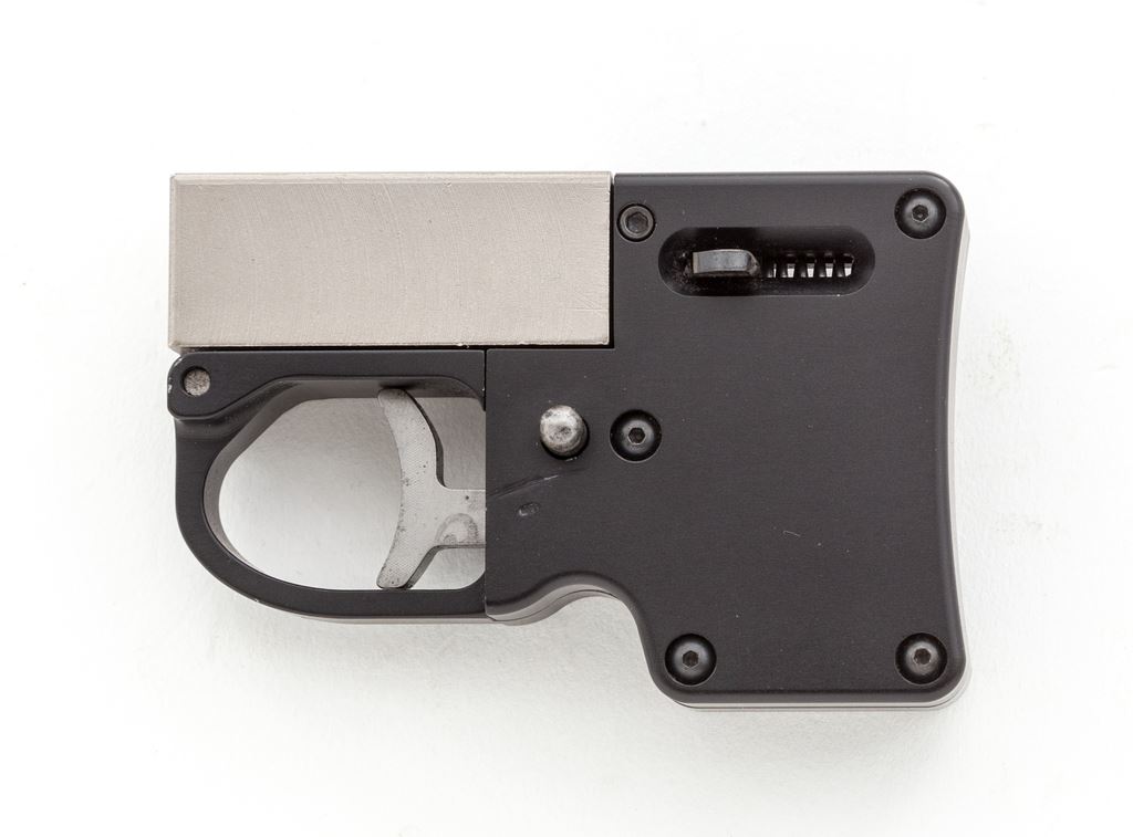 Stinger 9mm Liberator Single Shot Pistol, #LB888, 1-7/8'' tip-up retractable barrel, satin alloy finish. Produced without sights, with caliber and maker's mark on top of barrel and frame. Rectangular block barrel, alloy frame, with barrel latch on left side. Condition is excellent, appearing as new and probably unfired. A rare novelty. Est.: $400-$600. (Modern)(Not available to Calif. residents.)