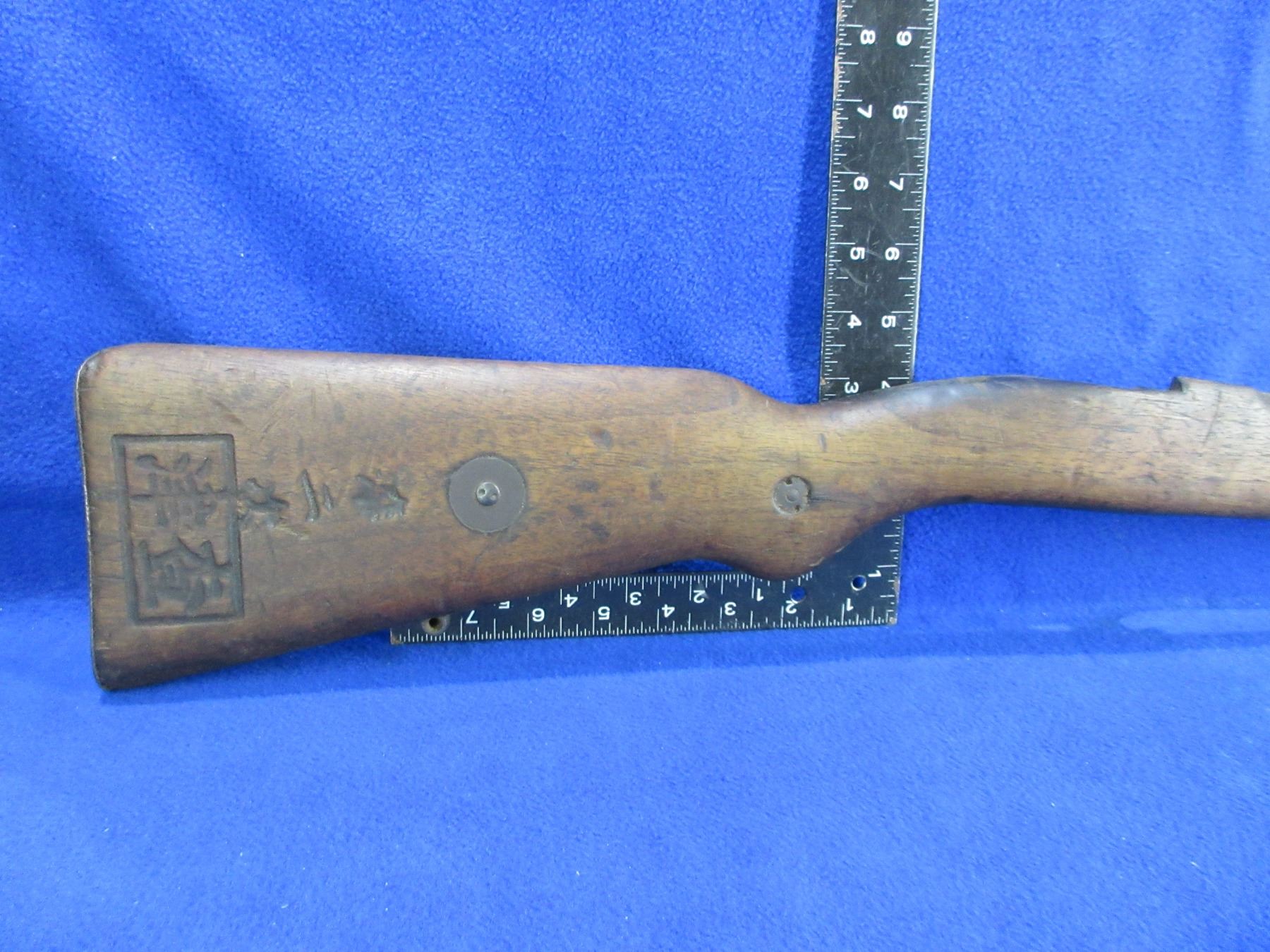 Stock Only - Czech Mauser Japanese Training Wood Stock - Stock is good with a crack on the heel, some drying cracks and many usage marks. Has Japanese markings on the butt. Comes with side swivel, stock disks and metal butt plate