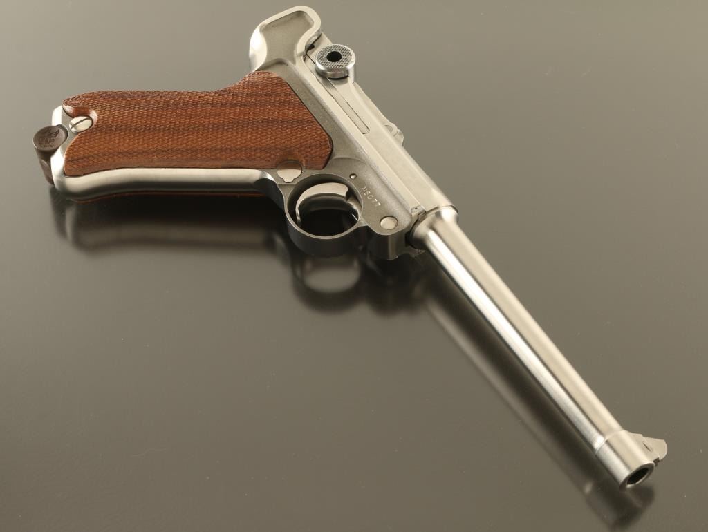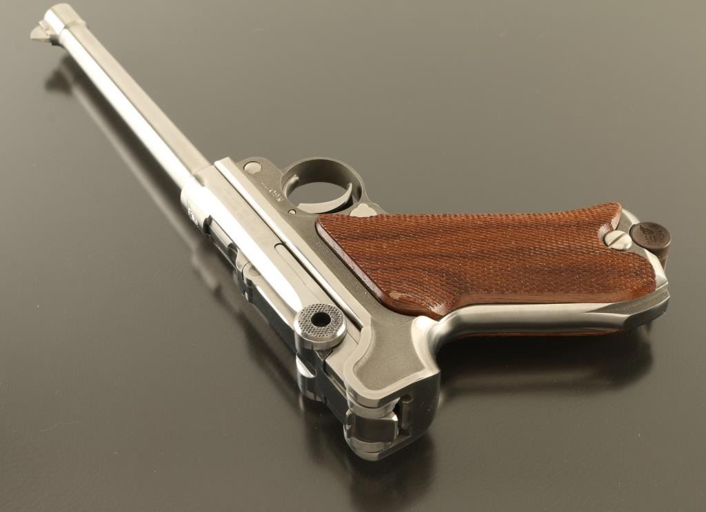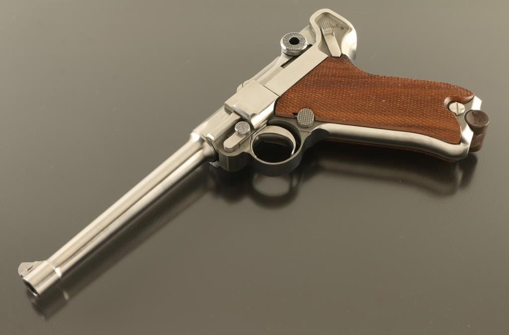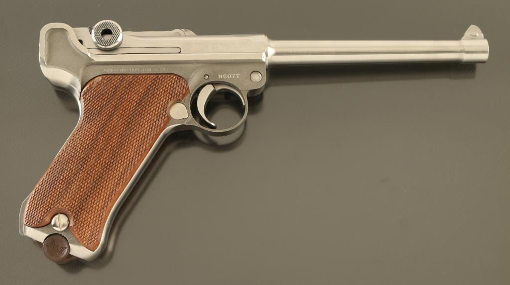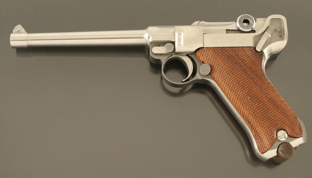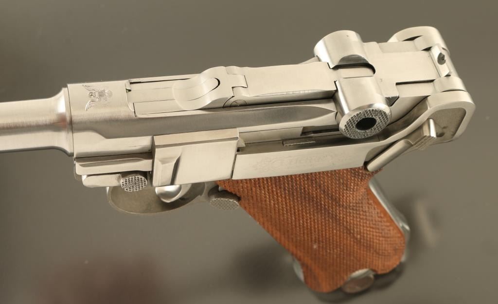 Semiautomatic pistol features stainless steel construction, checkered wood grips, 6" barrel, fixed sights, manual safety. Bore is excellent condition. Metal is excellent condition with few observed scratches. Wood grips are very good with a small gouge to right panel. American Eagle emblem over breech, and in dished our sides of wooden magazine base plug. Marked "LUGER" on left side. Includes one magazine. Condition is NRA Excellent *** Modern Firearm ***