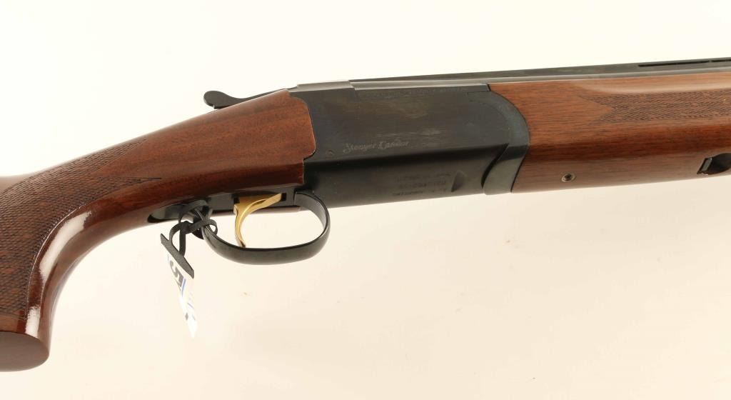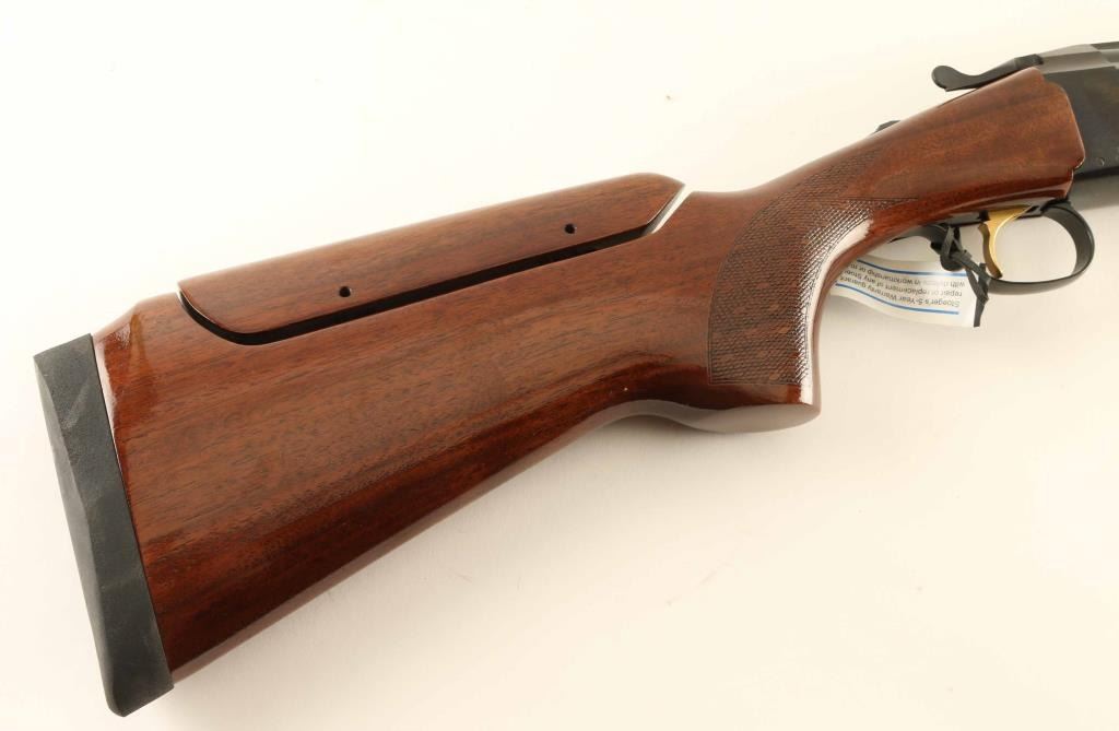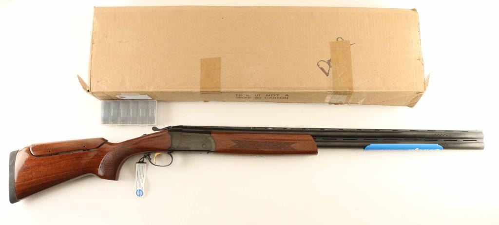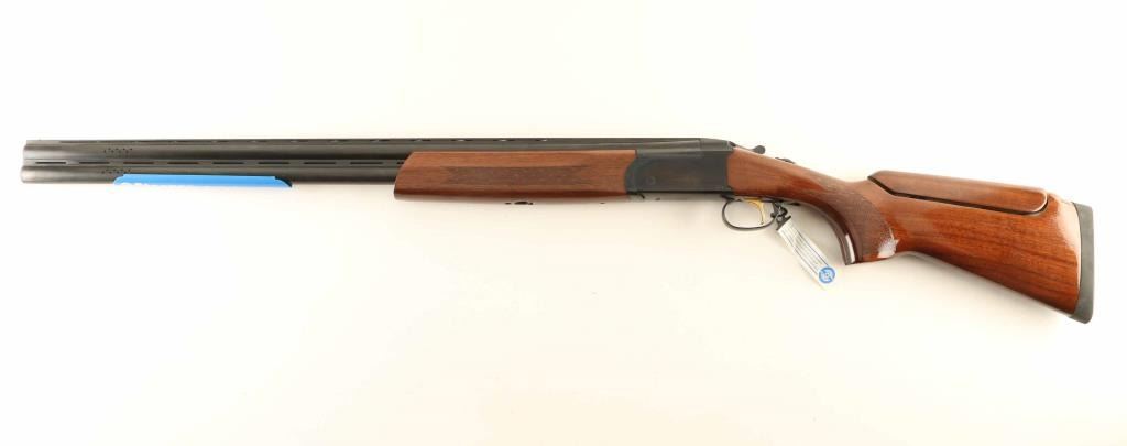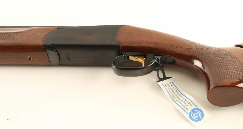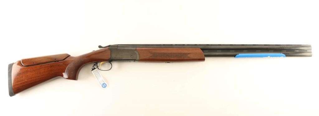 Brazilian over-under shotgun made by E.R. Armantino, imported by Stoeger, Accokeek MD. Takes 3" shells. Features 30" ported barrels with vent rib, screw-in choke tubes (Modified & IC flush mount tubes are installed), brass front bead, gold accent single triggers, tang safety/barrel selector, inertial hammer, checkered panels at wrist and forend, solid rubber butt pad, comb is adjustable for height. Bores are excellent. Retains 95% dark blue, with a hint of thinning at receiver edges, thin lines of barrel metal on top edges of vent rib, and solder line visible along barrel rib. Wood is excellent condition, mostly straight grain. Approx stock measurements are: 14-3/8" Length of Pull, 1-3/8" Drop at Comb (adjustable), 2-1/4" Drop at Heel. Includes original factory hanging tag and plastic barrel "sleeve", factory cardboard box, choke wrench and set of six extra choke tubes (extended type - 2 each Full, Mod, IC). Condition is NRA Very Good *** Modern Firearm ***