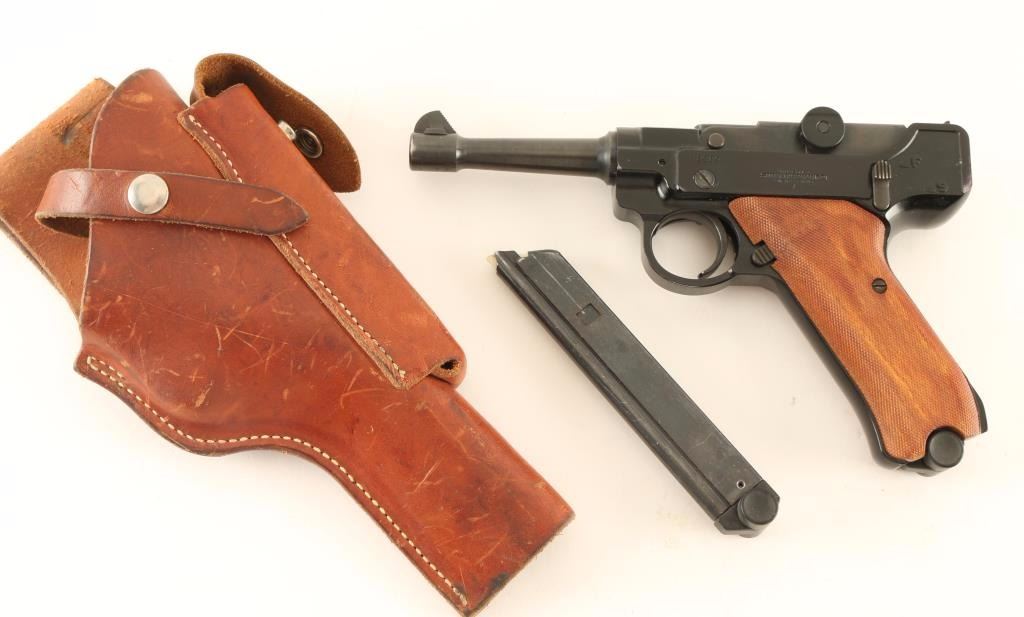American made semi-automatic rimfire pistol modeled after the German military pistol and chambered in .22 Long Rifle. Features a blued/black finish, 4.5" tapered barrel, dovetailed blade front sight, fixed rear window sight, thumb safety, smooth crescent trigger, push button magazine release, 10 round magazine and two-piece checkered hard wood grips. Features a smooth brown leather belt looped holster marked "STOEGER/-genuine-/LUGER" with magazine pouch & spare magazine. Pistol exhibits approximately 95% of it's original finish showing light holster wear. Action is smooth, bore is very good and wood grips are very good. Condition is very good+++ ***Modern Firearm***