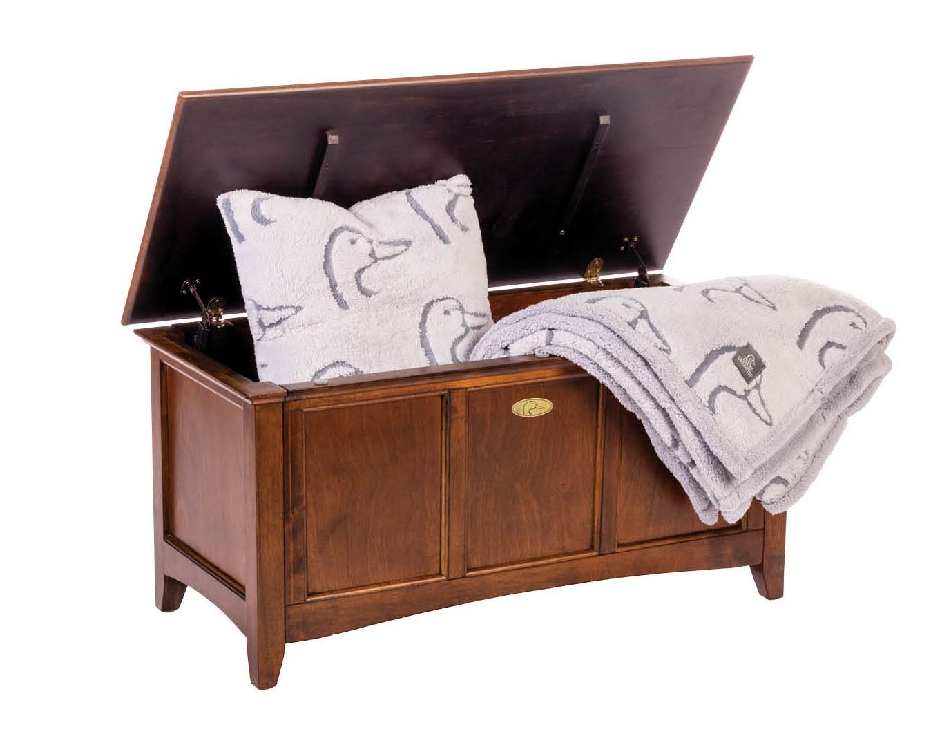 The Storage Chest is a versatile and functional piece that blends traditional style with Ducks Unlimited character. Measuring 39” x 19” x 18”, it is crafted from durable rubberwood with a warm elm finish, making it both sturdy and stylish. Perfect for placement at the foot of a bed or for use as a coffee table, this chest offers practical storage while enhancing your home décor. A distinctive oval duckhead plate adds a signature Ducks Unlimited touch, making this storage chest as decorative as it is useful.