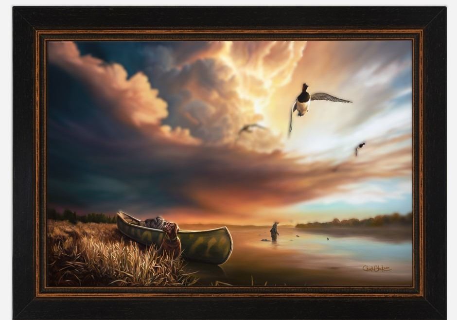 “Storms Will Pass” by Chuck Black captures the quiet calm following a passing storm, set against a backdrop of dramatic skies and reflective water. A lone hunter and his faithful chocolate lab stand ready among decoys as canvasbacks circle above, evoking the anticipation and solitude of a day in the field. Known for his masterful use of natural light and his deep connection to the outdoors, Chuck brings this moment to life with vivid realism. As the 2024 Federal Duck Stamp winner, his talent shines in this 17.75" x 26.5" canvas, making it a striking tribute to the resilience and beauty found in the hunting tradition.