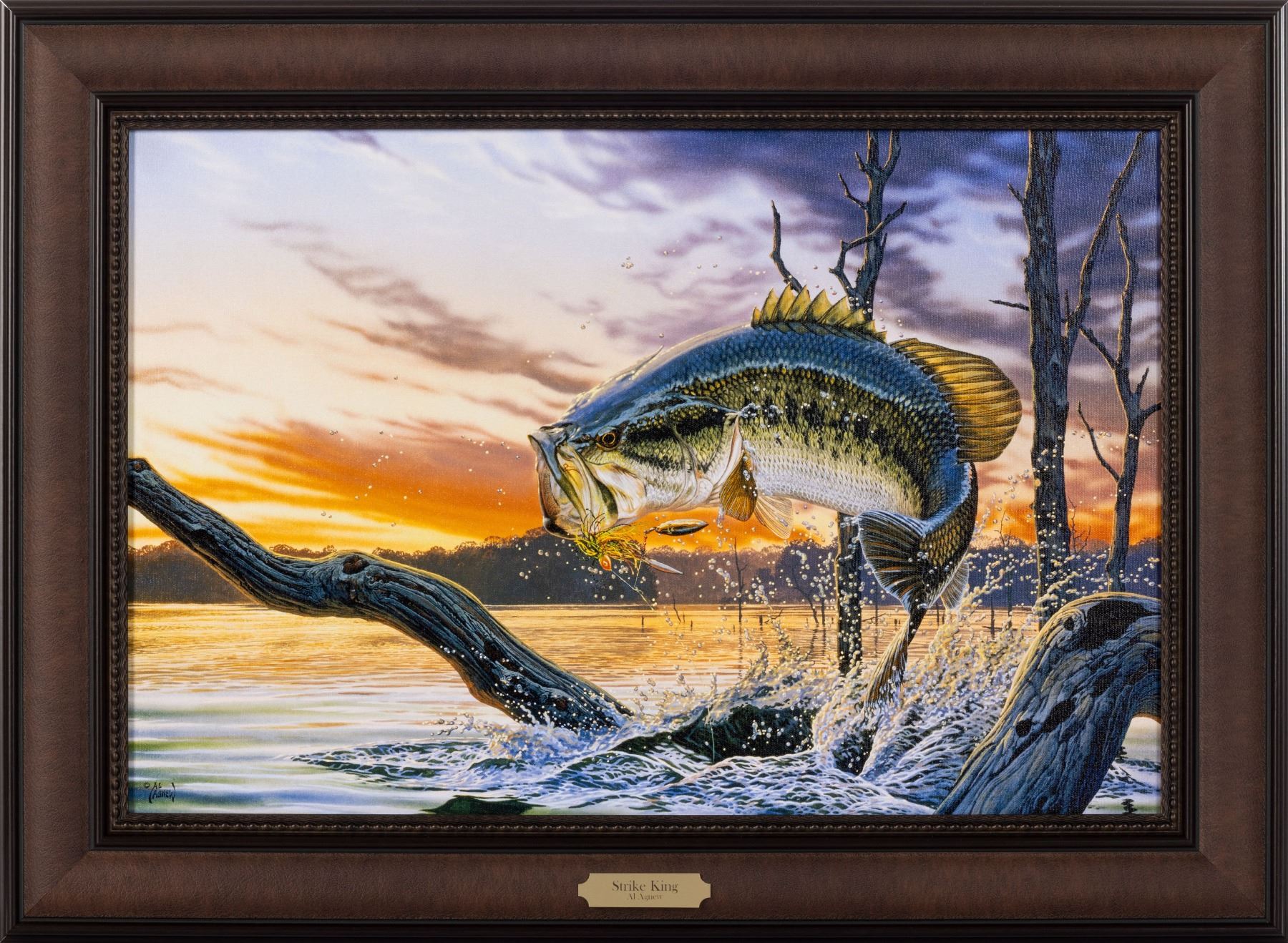 "Strike King" by Al Agnew is a captivating masterpiece that beckons viewers into the dynamic world of angling. With meticulous artistry, Agnew brings to life a thrilling scene in which a large-mouth bass is tantalizingly enticed out of the water by the allure of the "Strike King" lure, a delectable meal awaiting it. The canvas, beautifully printed and framed, accentuates the allure of the moment, while the included title plate adds a touch of elegance. Agnew's illustration not only celebrates the art of fishing but also encapsulates the essence of predator and prey in nature's intricate dance. This artwork serves as an invitation to witness the interplay of anticipation and instinct, a striking tableau of life beneath the water's surface.