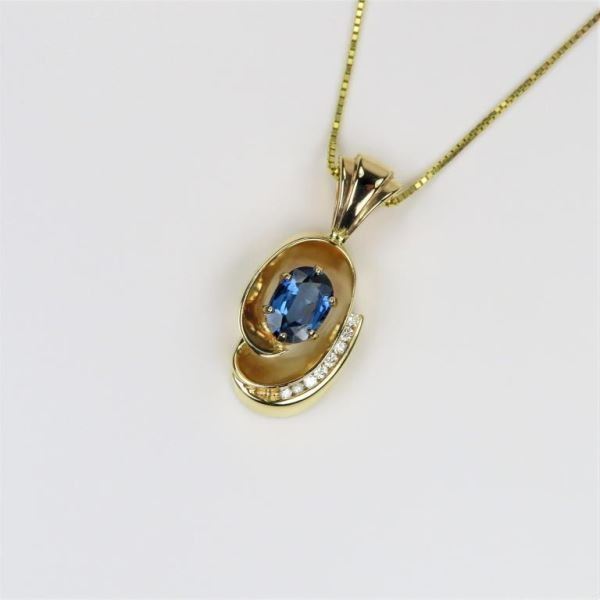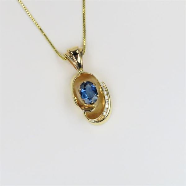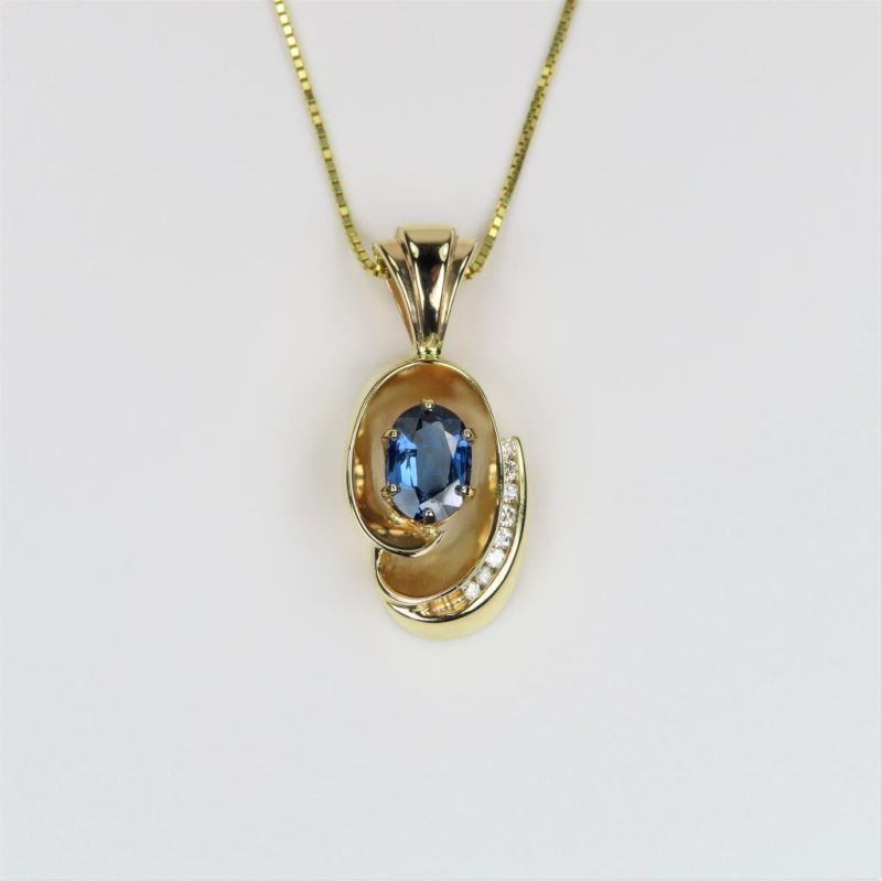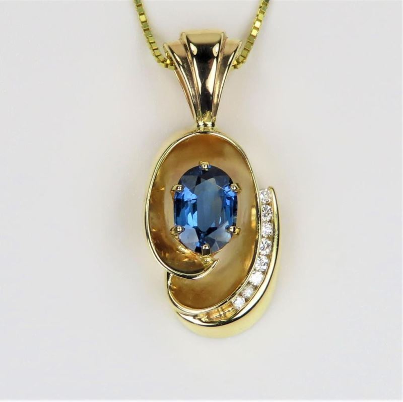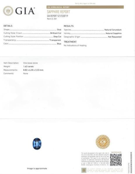 featuring a G.I.A. Certified 100% Natural NO HEAT oval cut Blue Sapphire weighing 1.62 carats channel set with 8 round Diamonds weighing approx. 0.20 carats with G-H colors and VS/SI clarity set in a custom contemporary style setting crafted in 14 karat yellow gold. Retail $5,000-$6,000