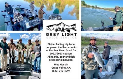 Grey Light Guide Service is offeering a striper fishing trip for 4 people on the Sacramento or Feather River. Good for 2022/2023 season.