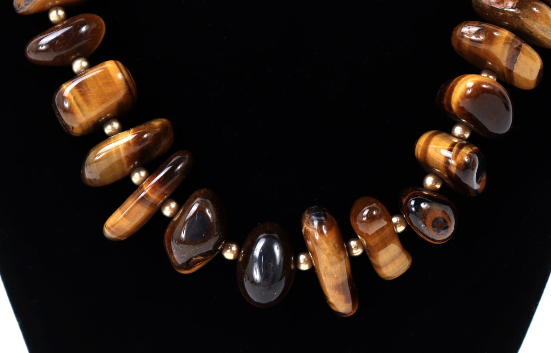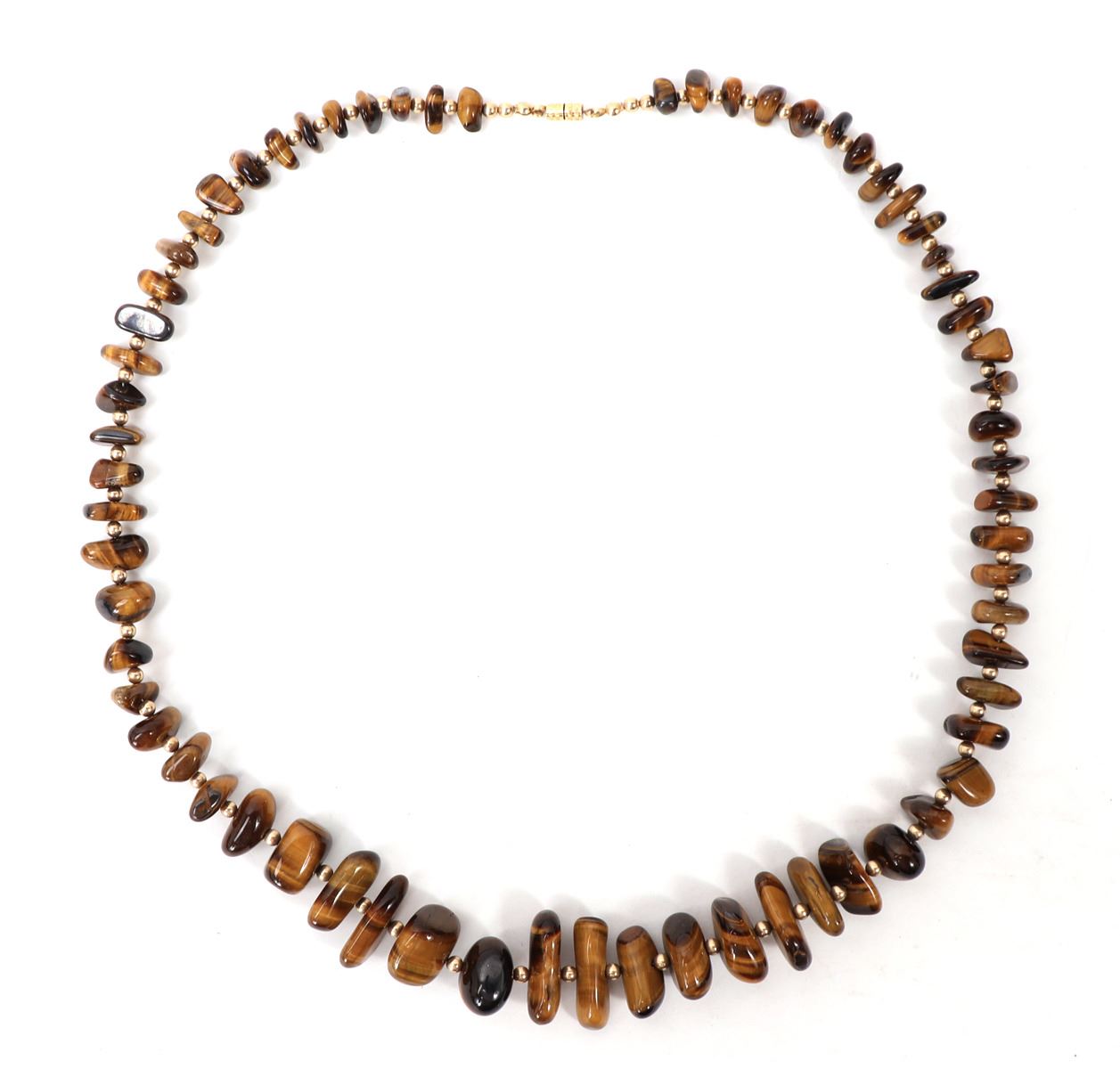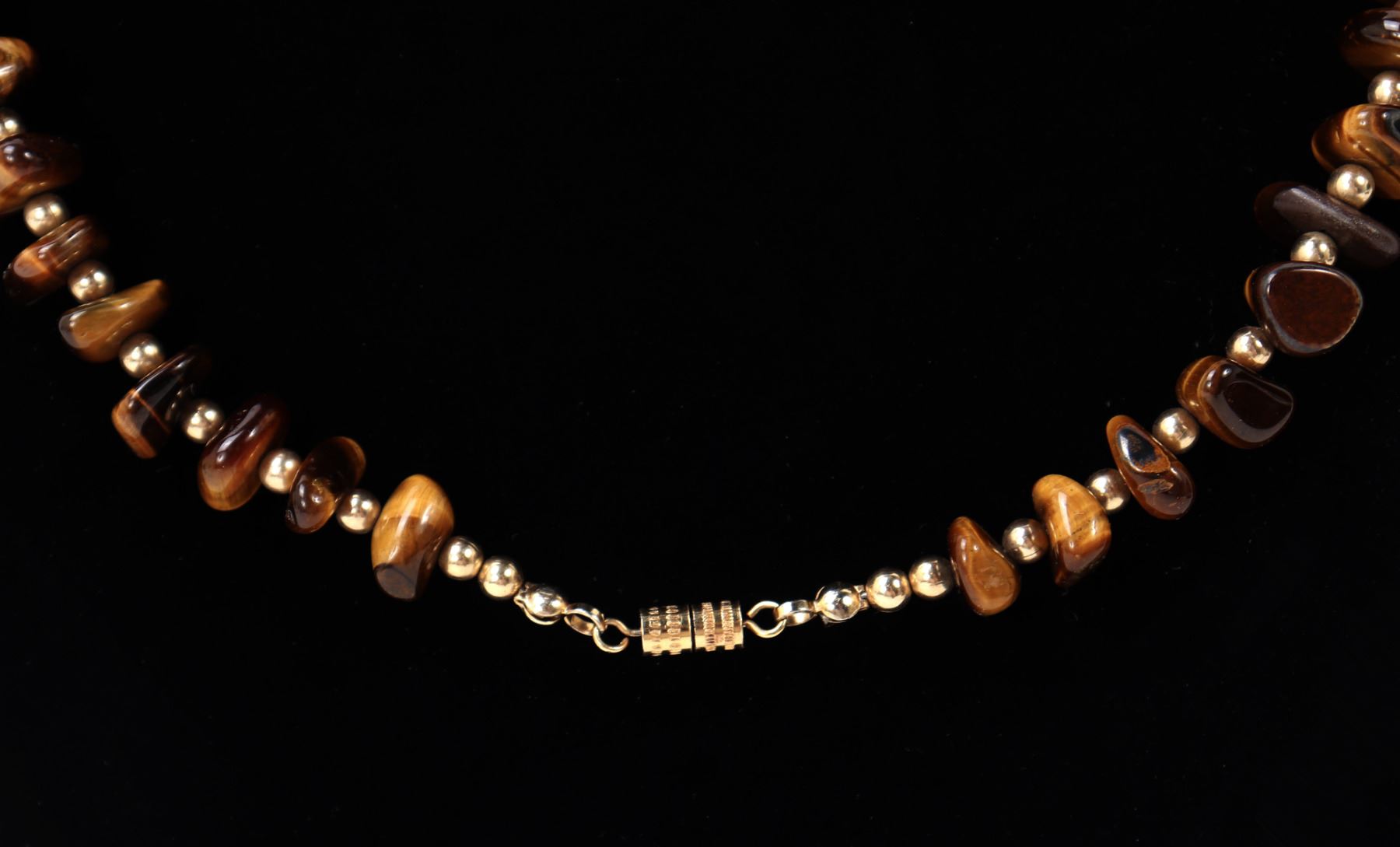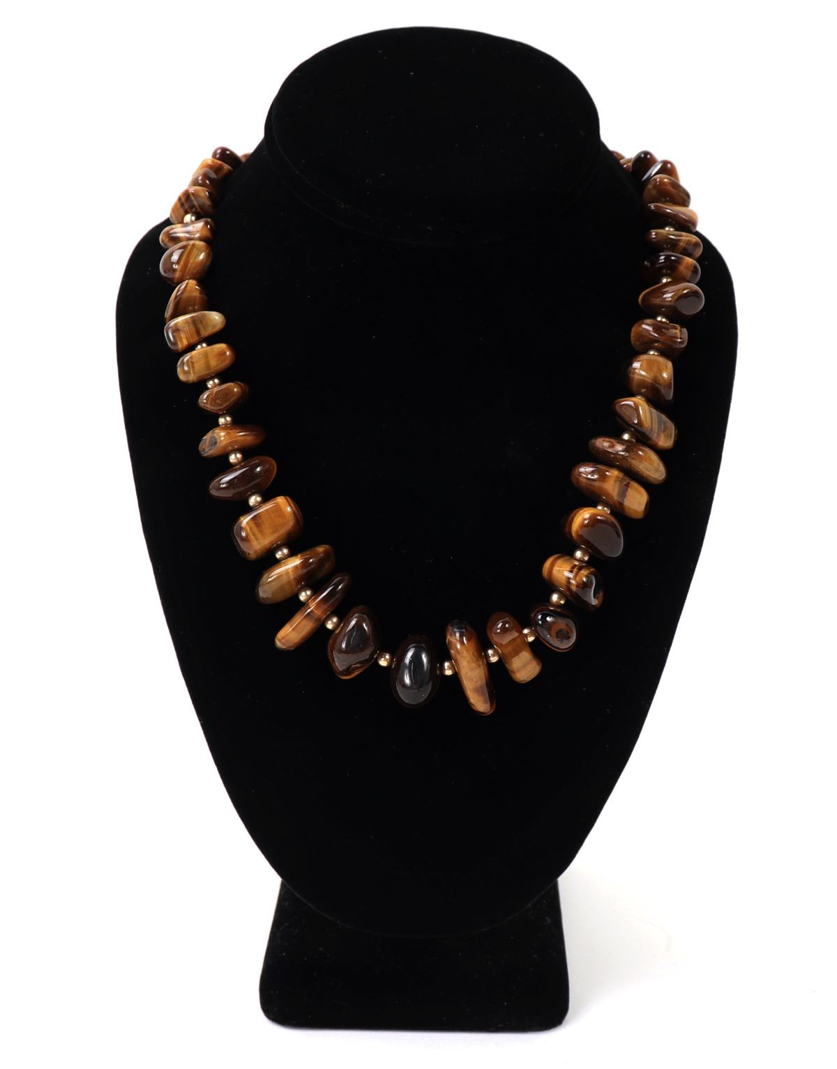 Incredible necklace comprised of dozens of wonderful tiger's eye beads with lovely gilt gold spacer beads in between with a gold screw clasp to the back. Varying sized beads make the necklace appear to be waxing and waning from one end to the other. Size 22" L, weight 160g. Condition: Beautiful wearable condition.